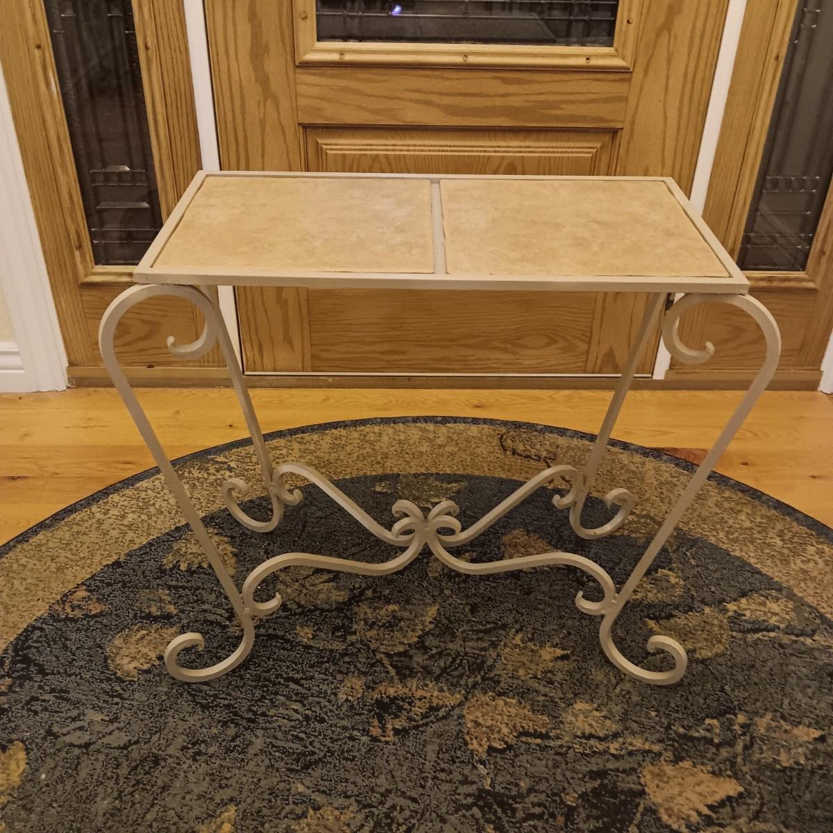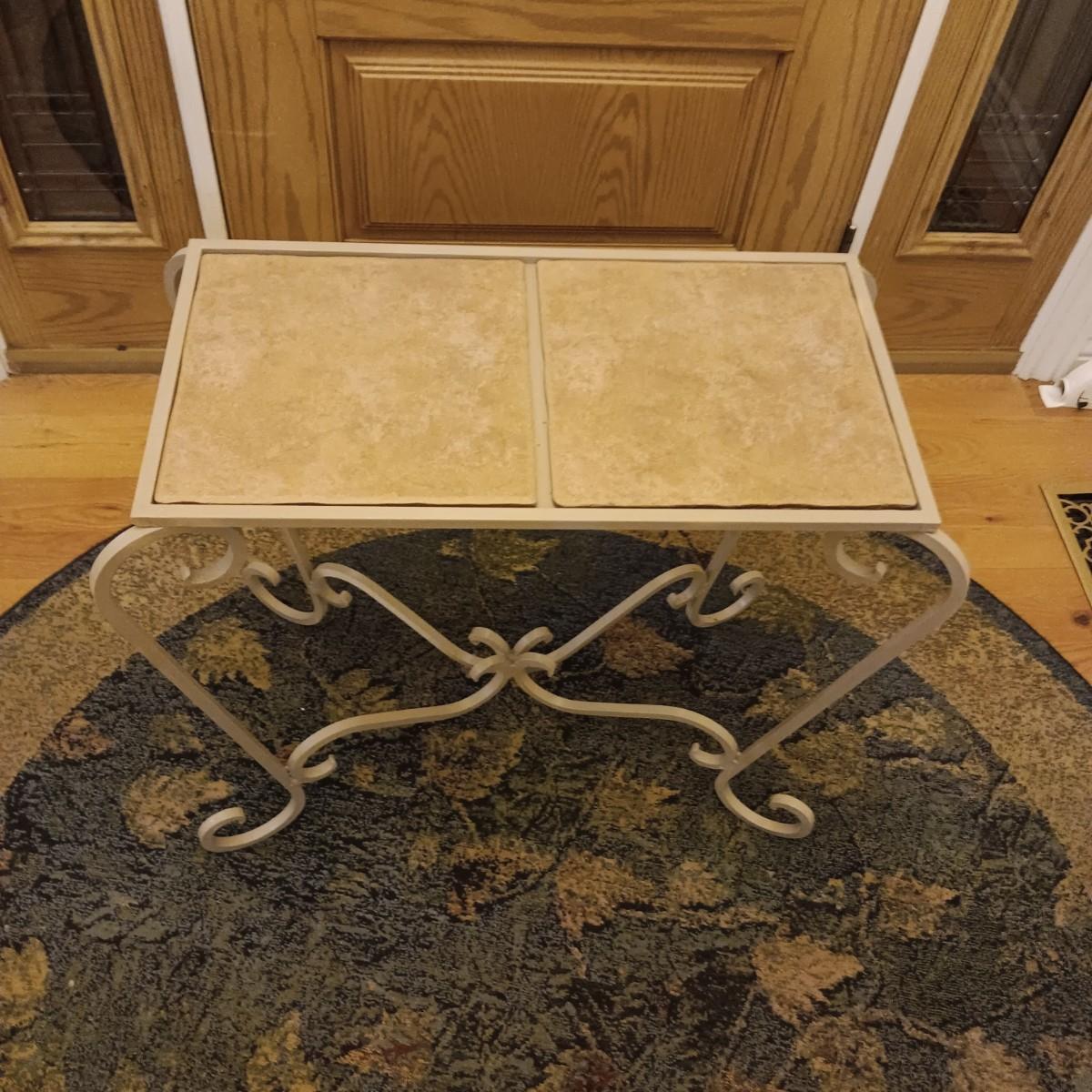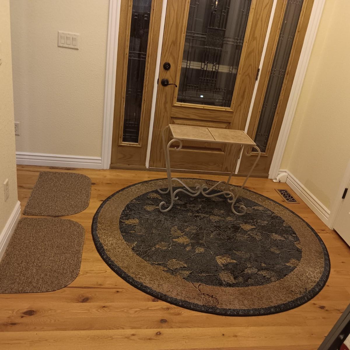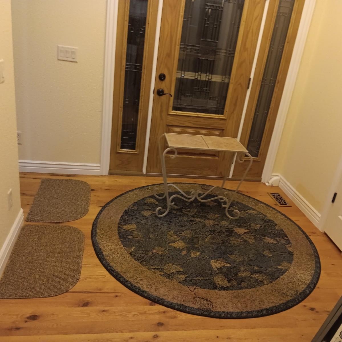 ROUND AREA RUG, IRON SIDE TABLE WITH TILE TOP AND 2 DOOR MATS