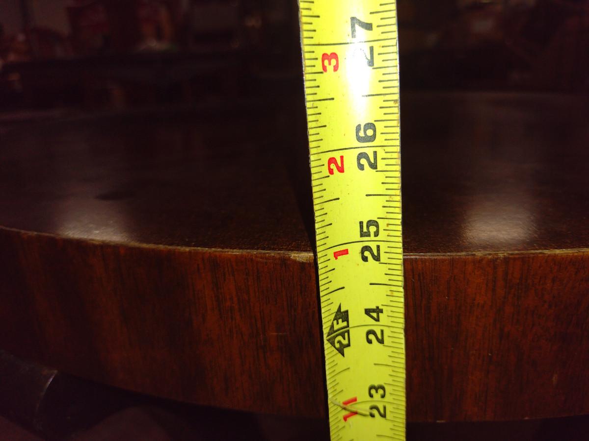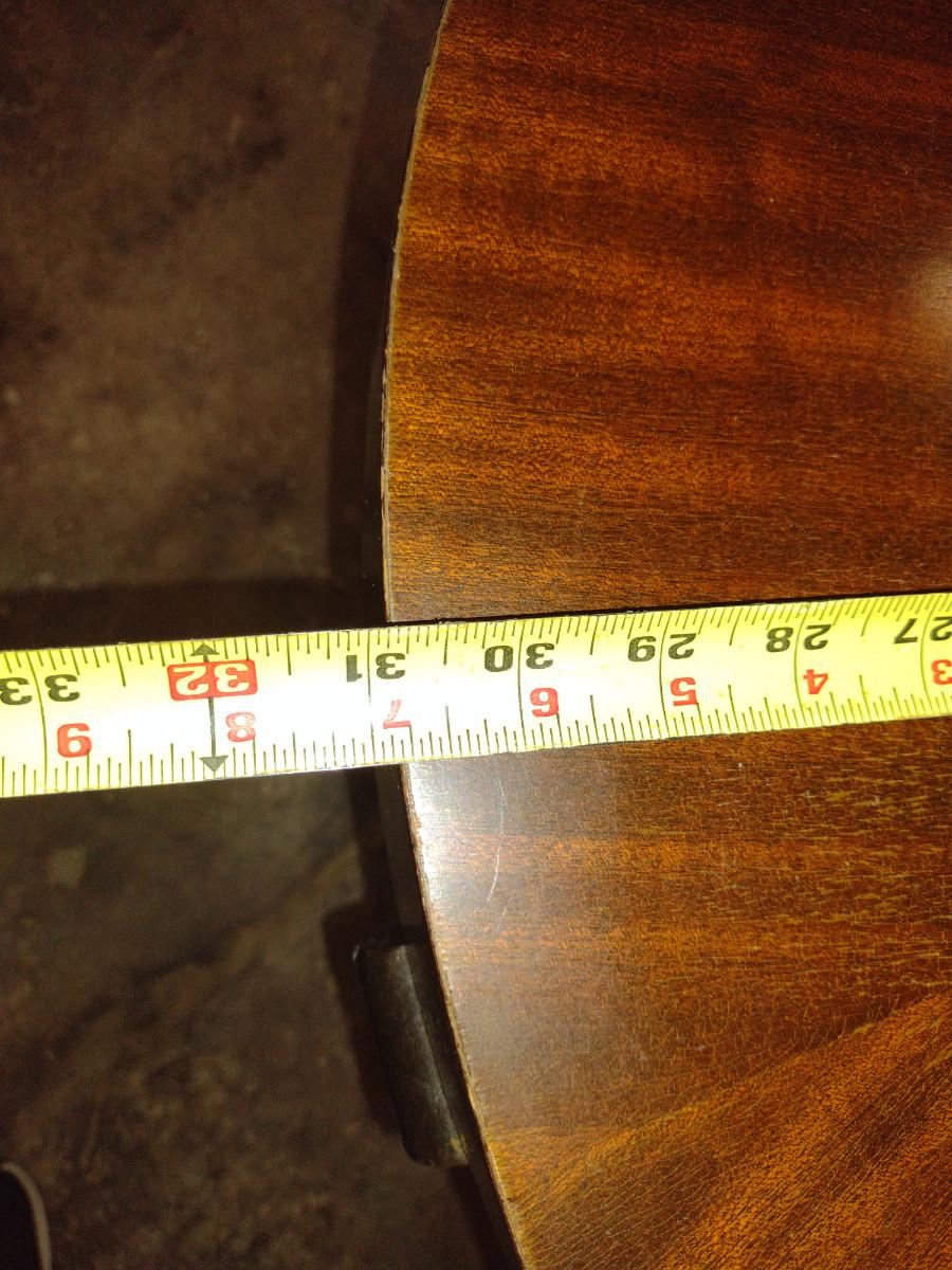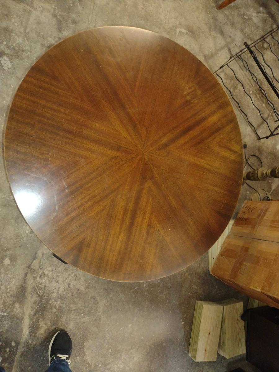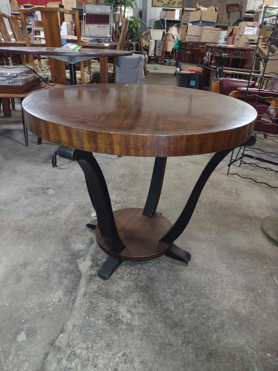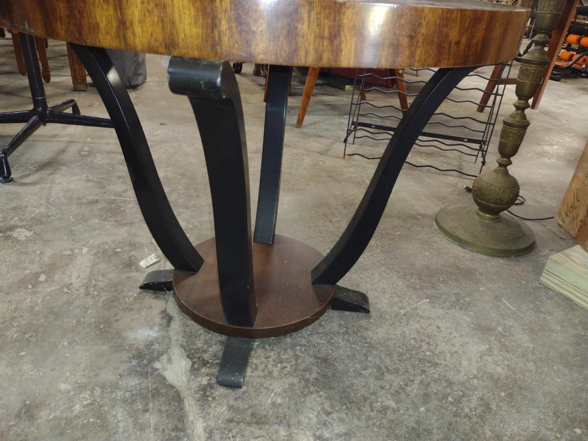 Round, Art Deco Gueridon Side Table- Walnut and Black Lacquer Finish. Measures approx 31" in diameter, 25" tall.
