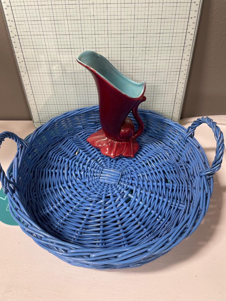 Round blue basket & Red Wing planter