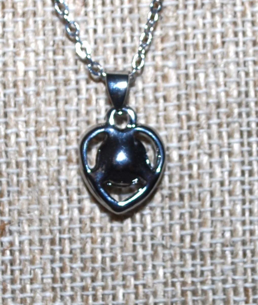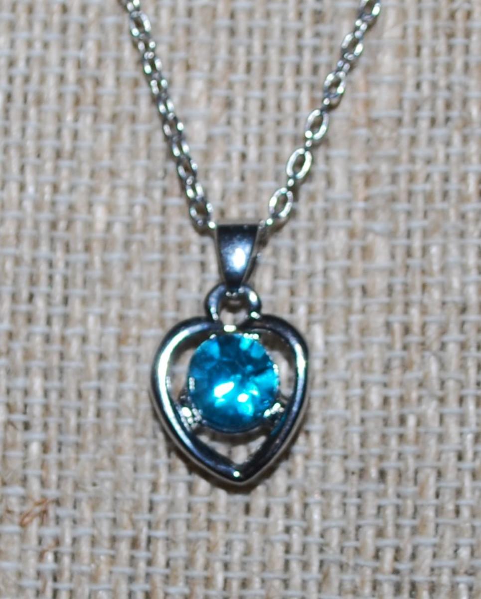 Round Blue Stone in a HEART Setting PENDANT (½" x ½") on a Silver Tone Necklace Chain 16" L