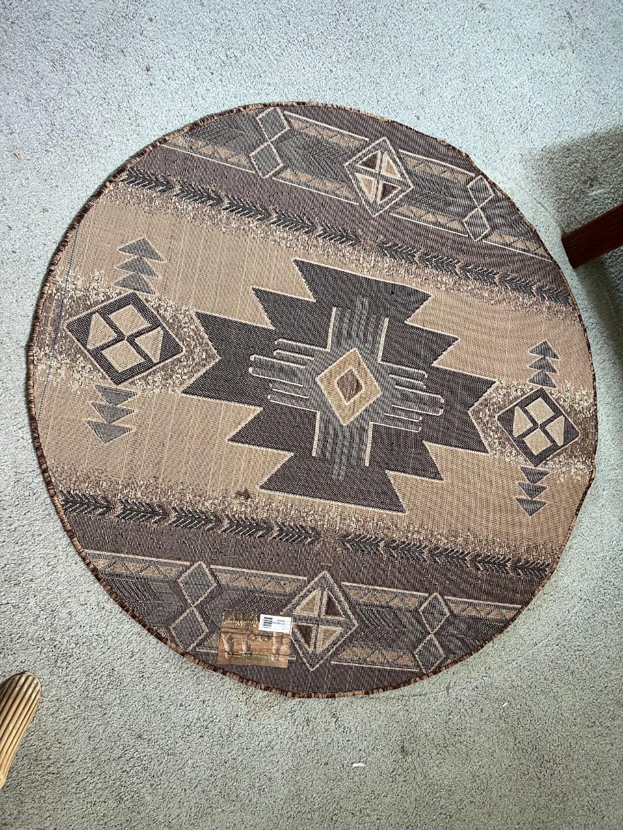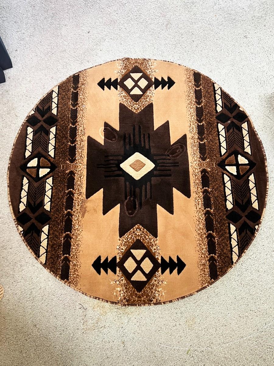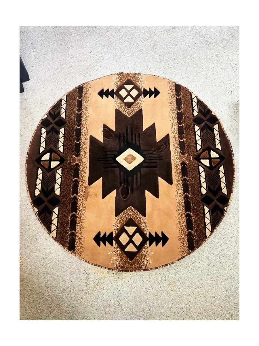Round Brown & Tan Southwestern Style Rug. In good used condition. About 59" diameter. Table legs have left imprints, not sure if/how well they will come up.
