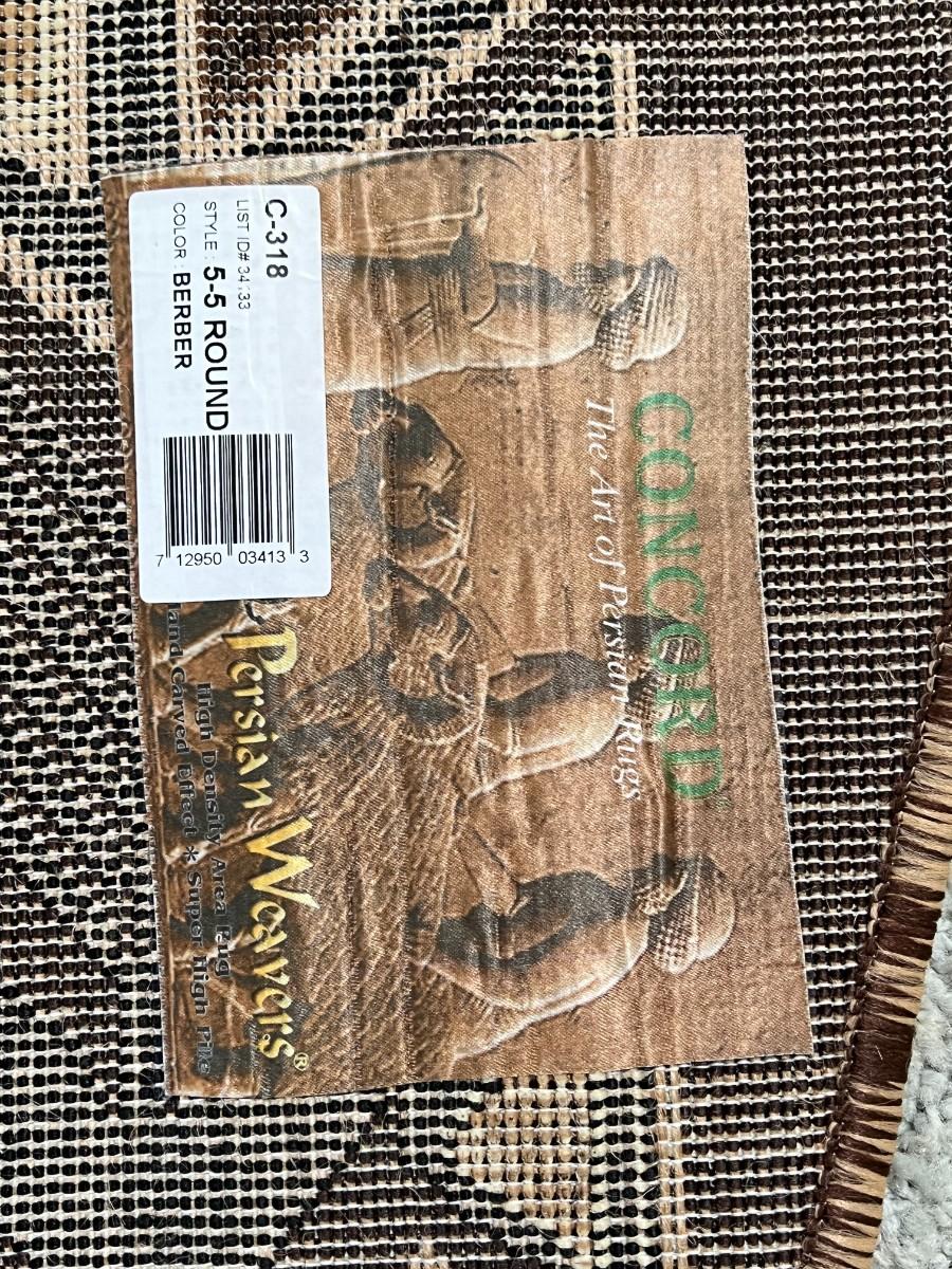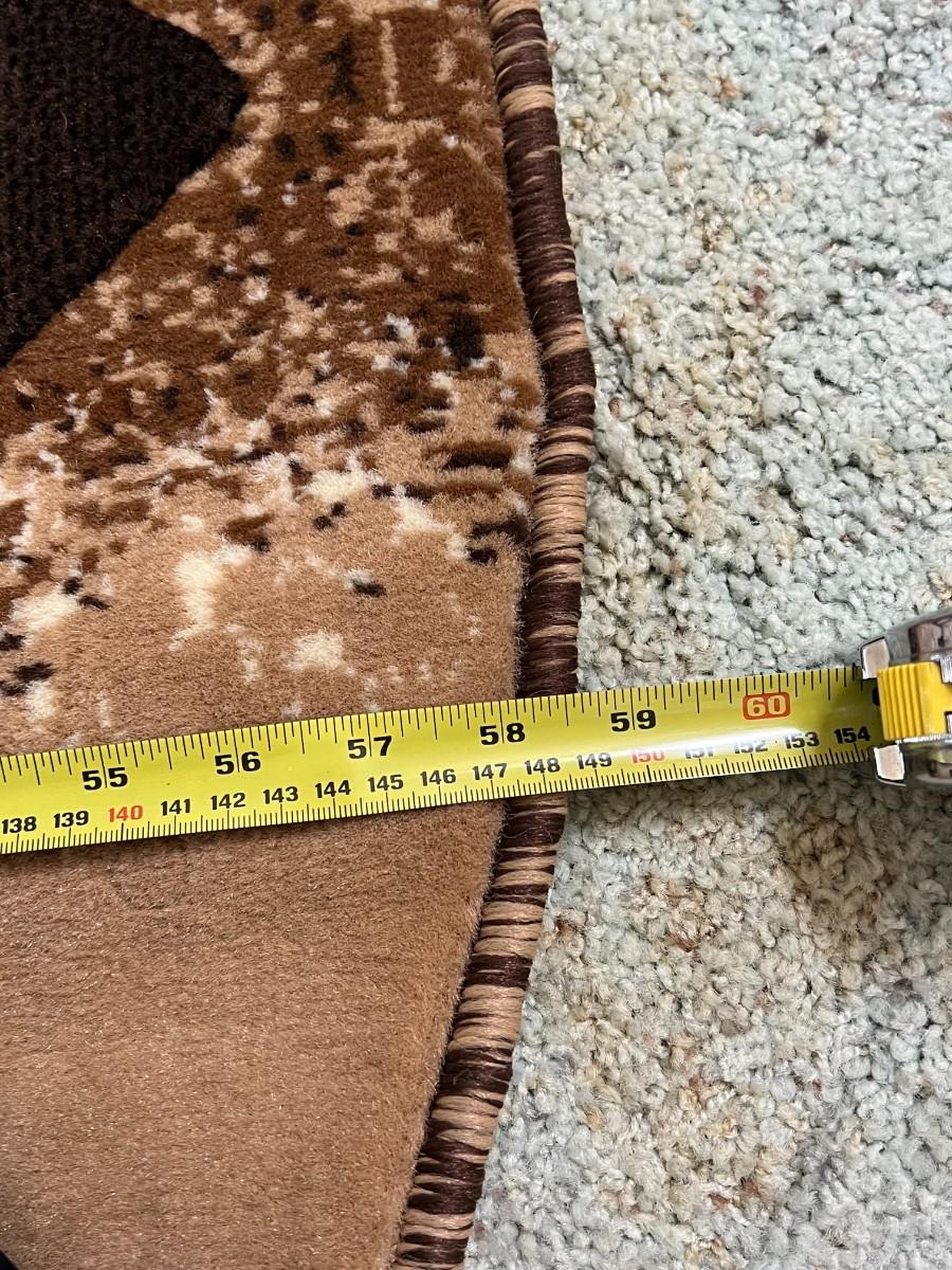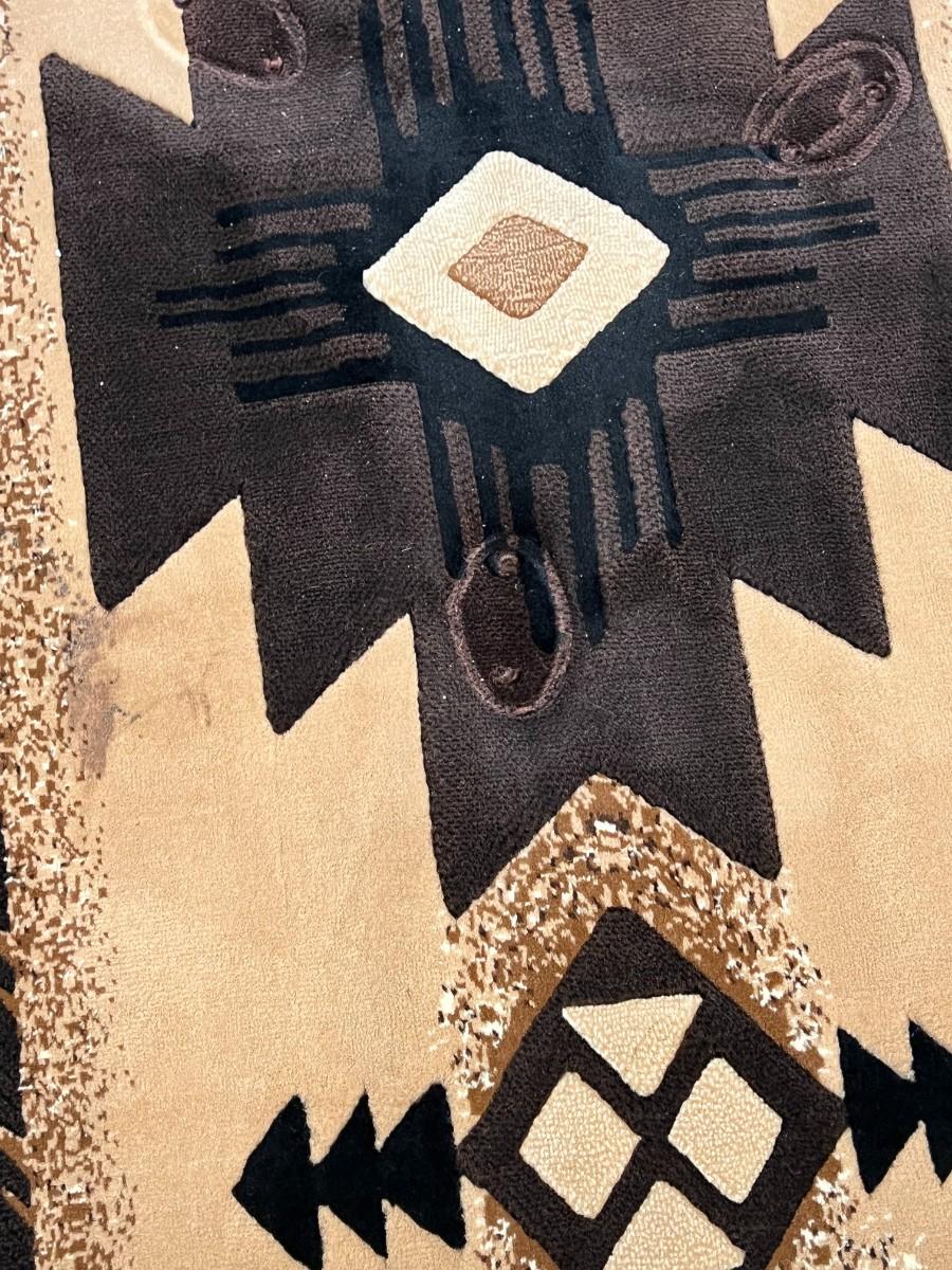 Round Brown & Tan Southwestern Style Rug. In good used condition. About 59" diameter. Table legs have left imprints, not sure if/how well they will come up.