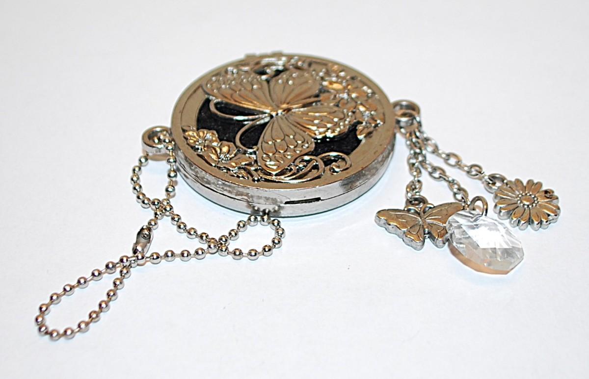 Round Butterfly Hinged AROMATHERAPY CASE (1¾" Diam.) with Foam Insert and Accent Dangles and 3" Silver Tone Chain