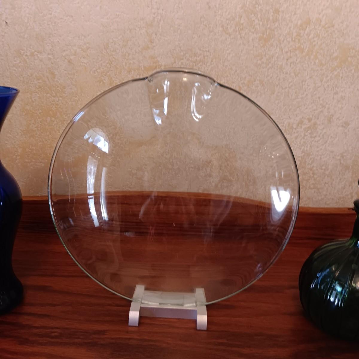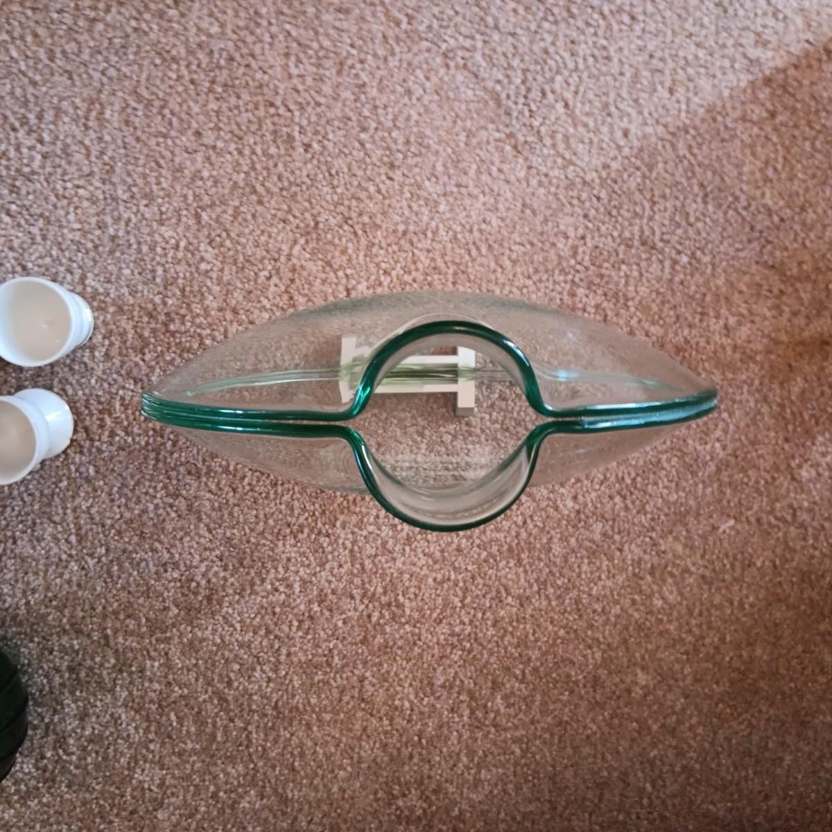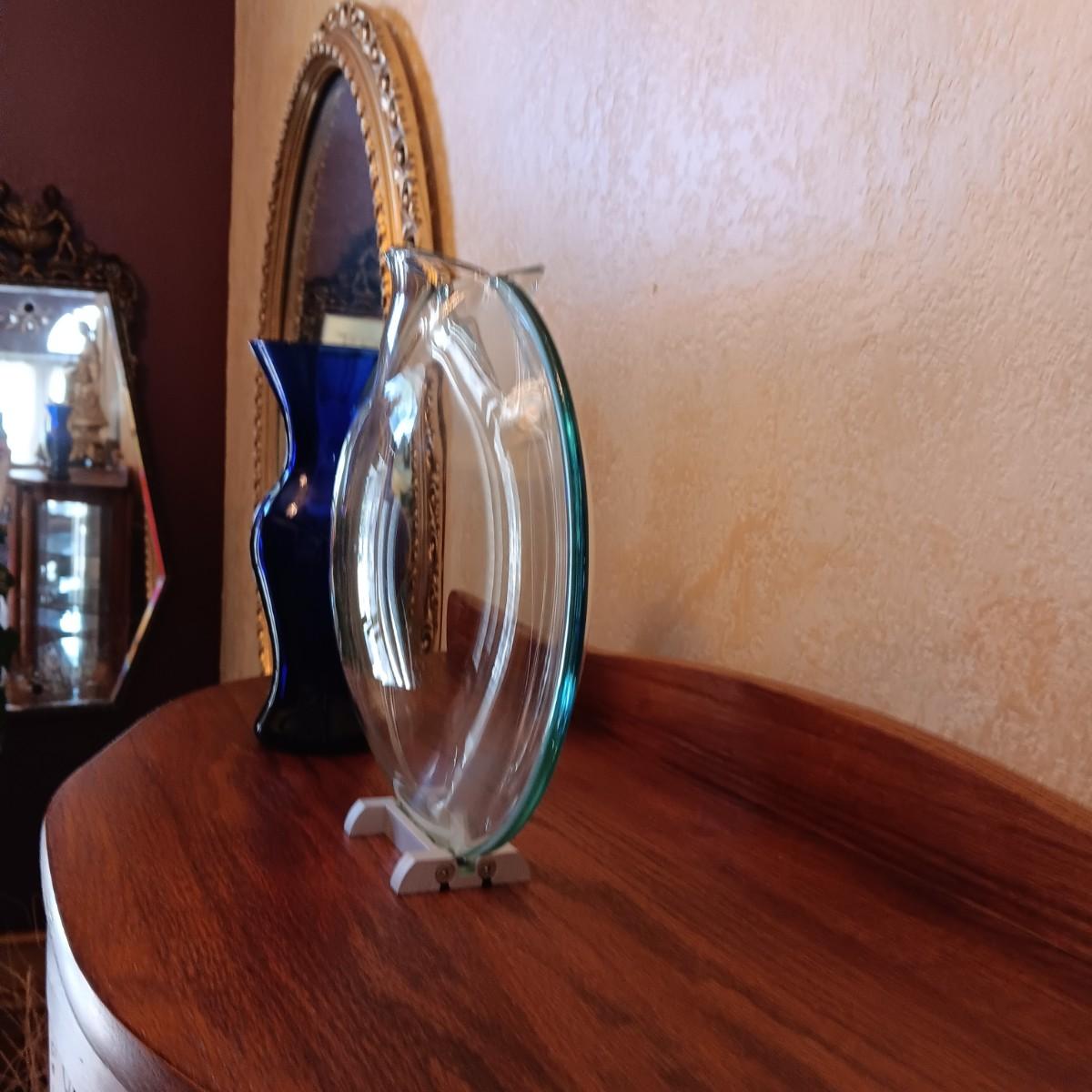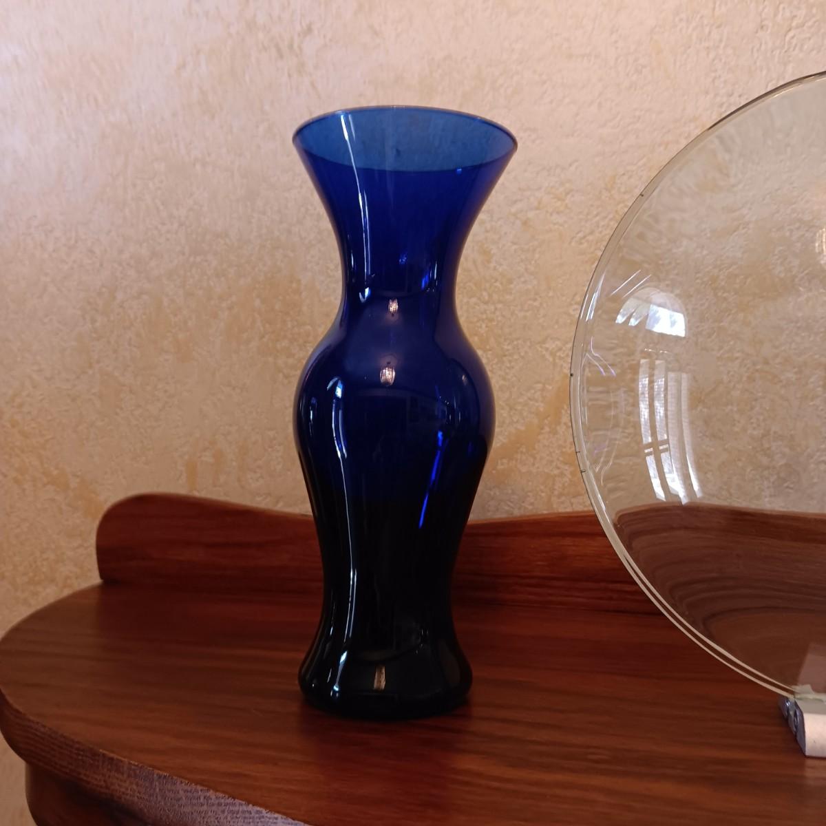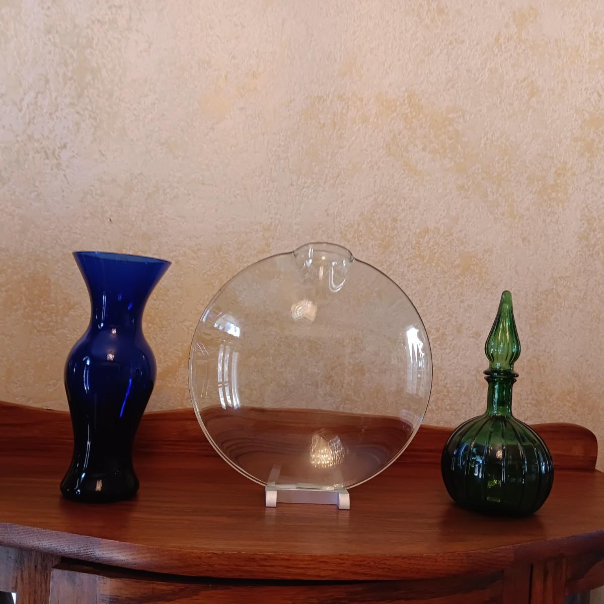 ROUND CLEAR ART GLASS VASE, BLUE GLASS VASE AND DECANTER