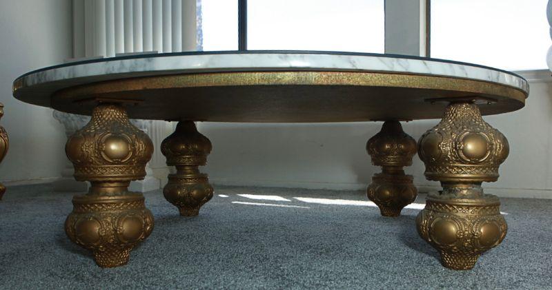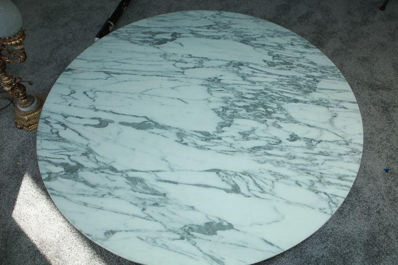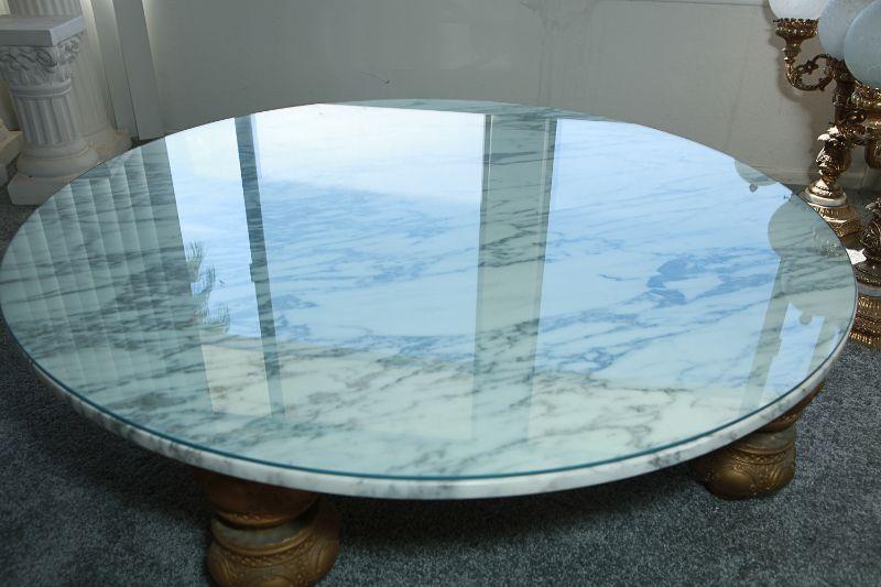 48" marble top round coffee table. Marble is white with grey veins. Piece of glass on top to protect the surface. Base is made of wood that has been painted gold. Ornate looking legs. Stands about 15" tall.