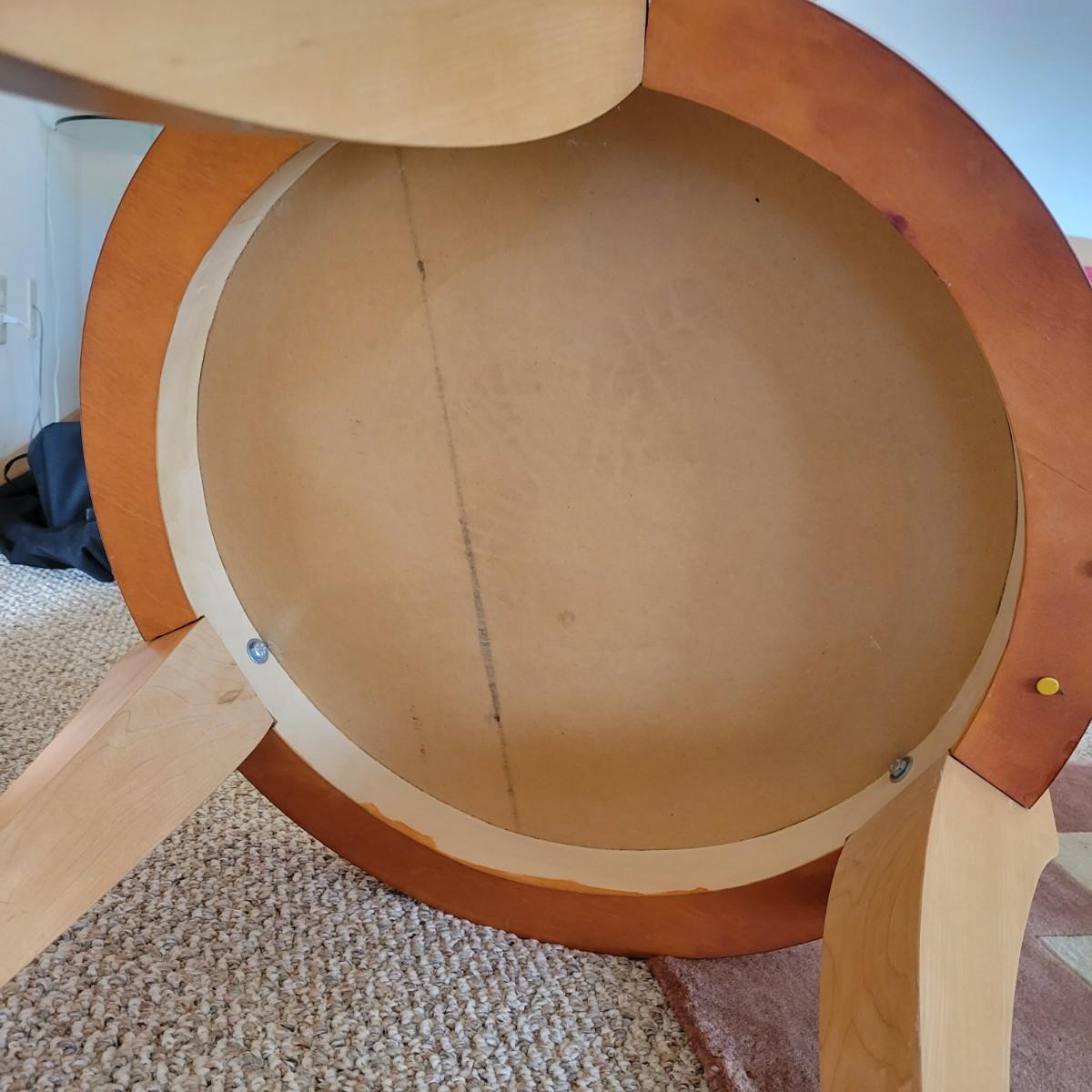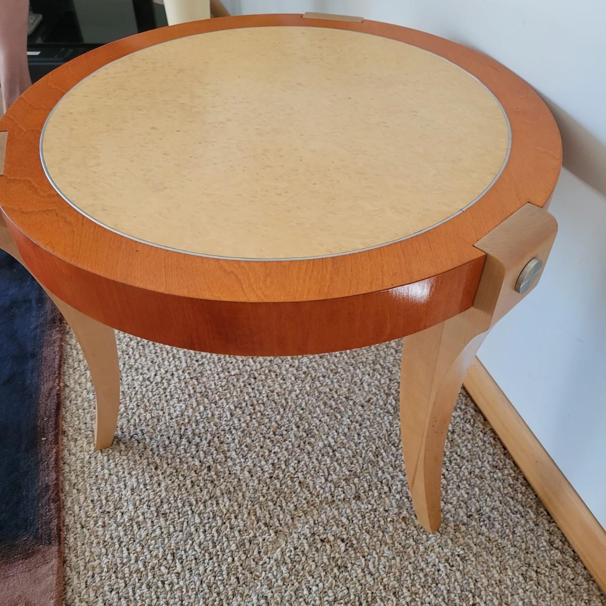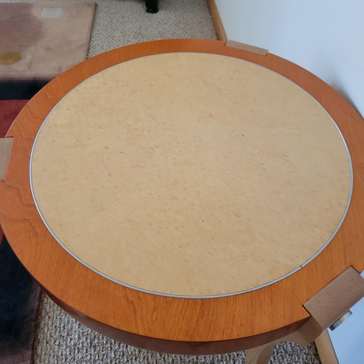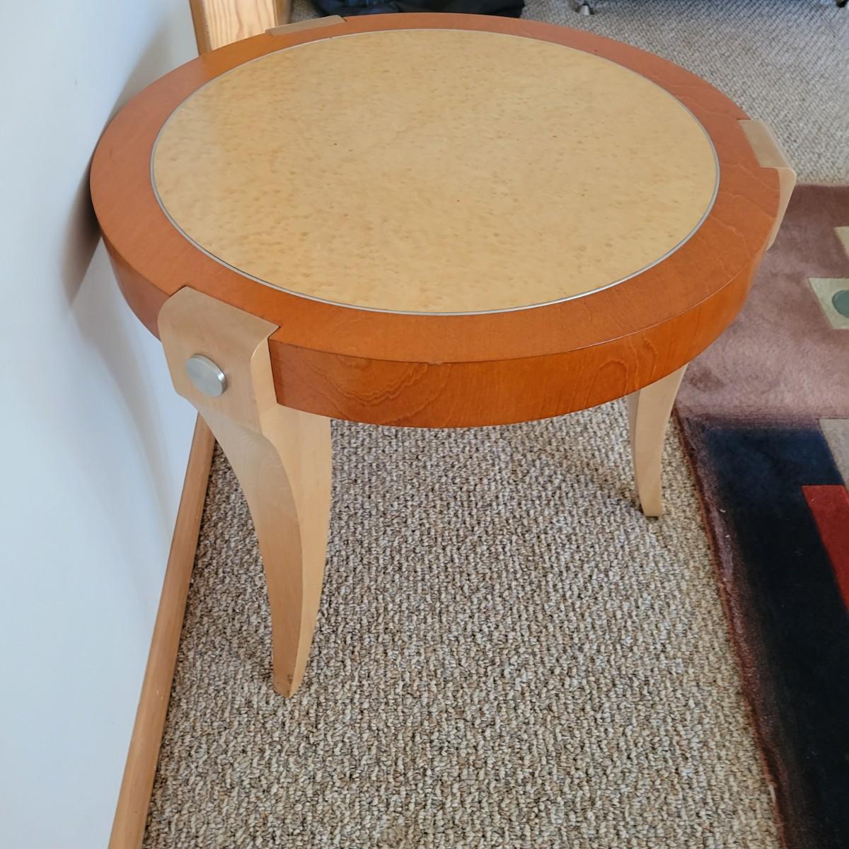 A contemporary round wooden side table that measures approximately 24"D x 21"H. It features multiple wood tones and what looks like a veneered birds eye maple center with a metal accent strip. Local pickup only.