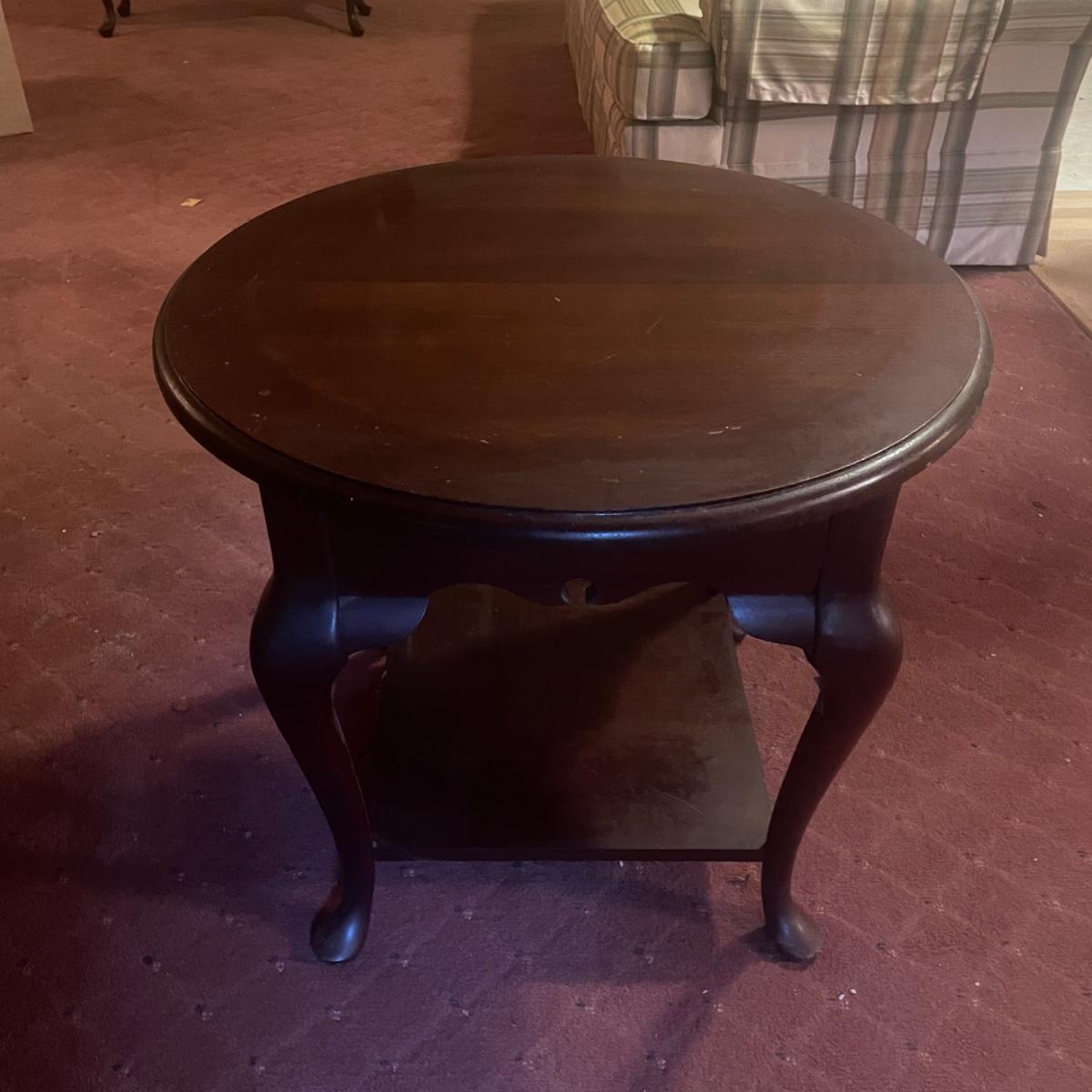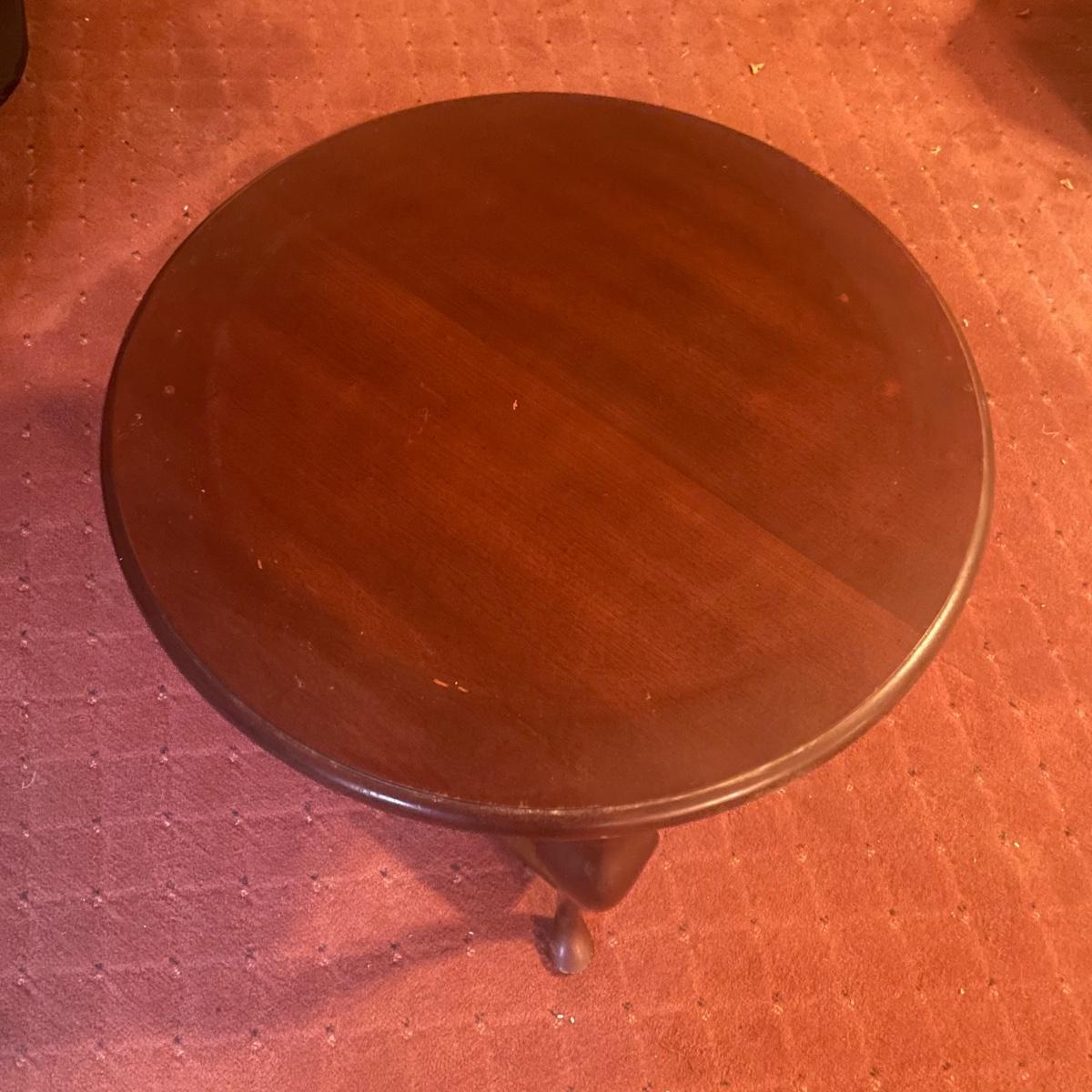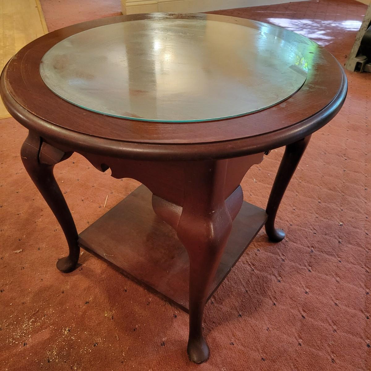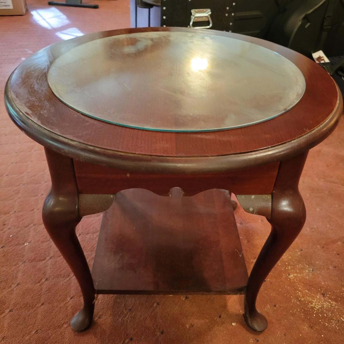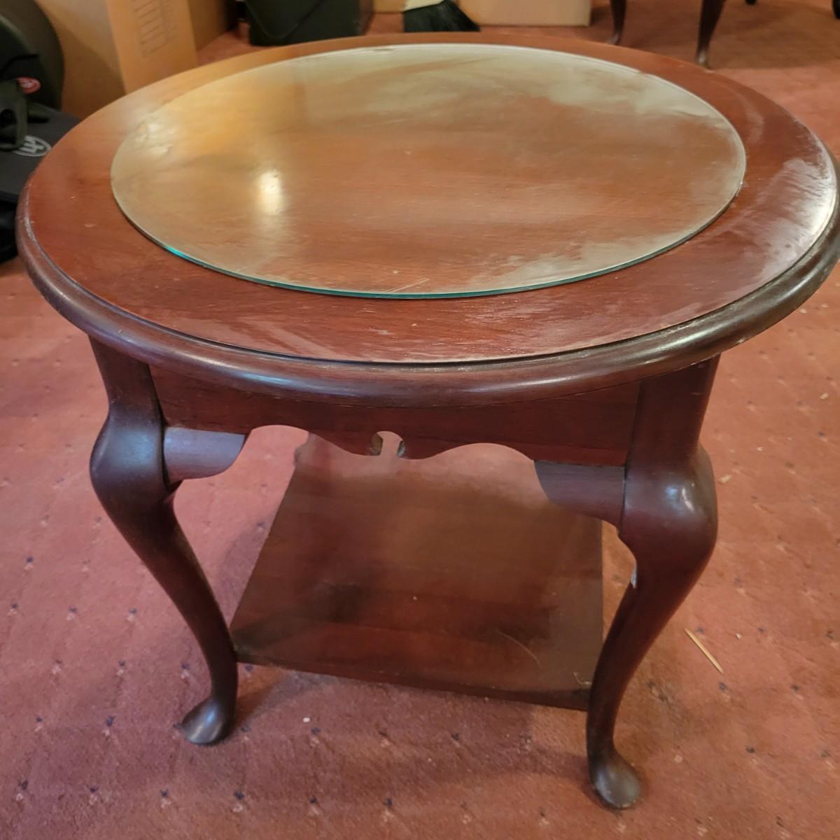 A wooden, round end table with a small glass topper in good condition with some minor blemishes and scratches. Glass top is removable and has some light scratches and is dirty. Table features a dark cherry stain and one shelf. Measures approximately 25" x 22.5". Local pickup only
