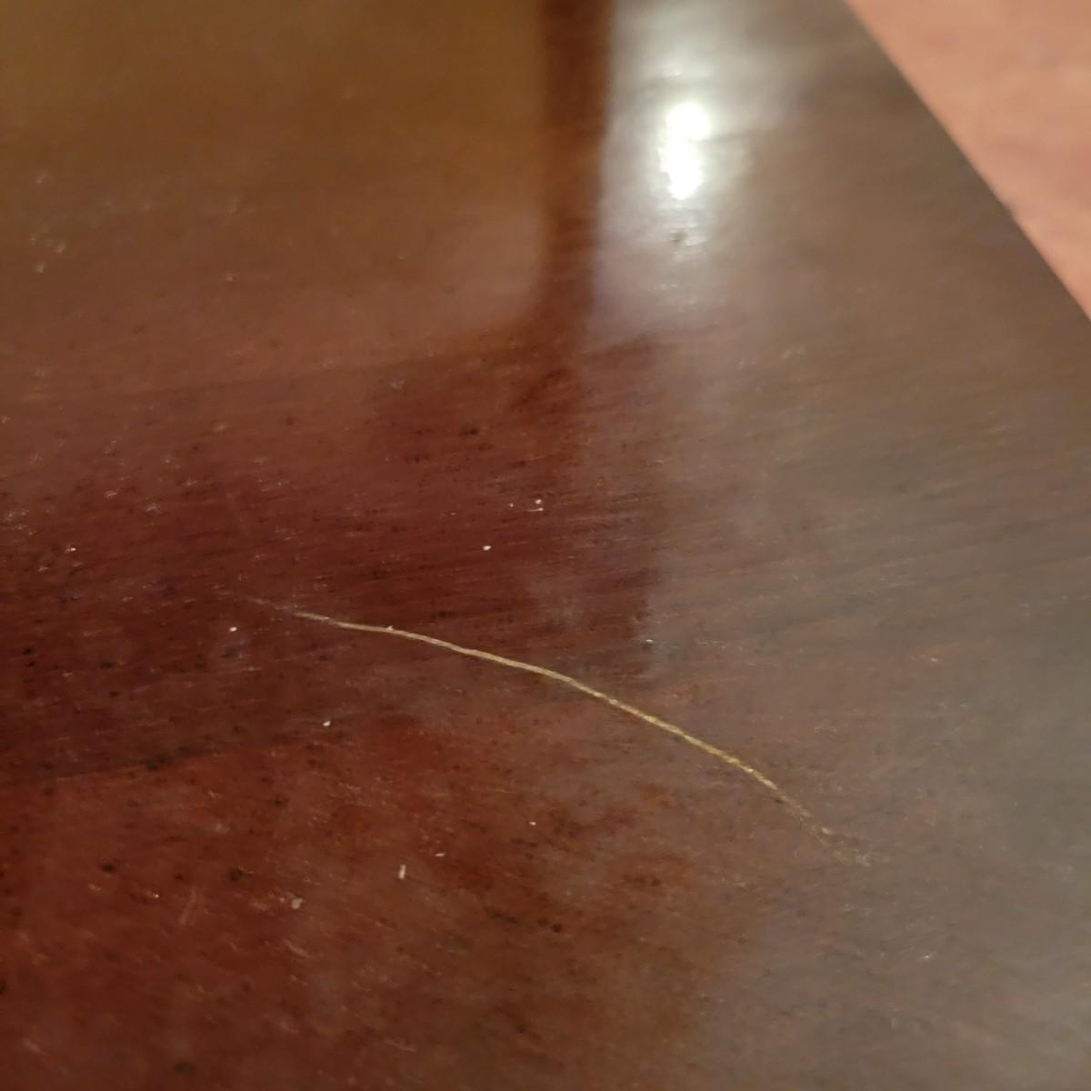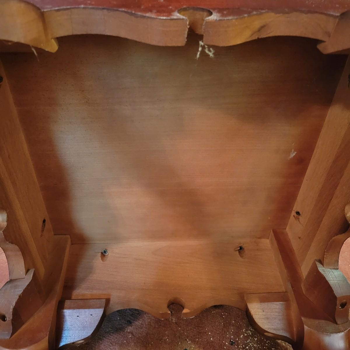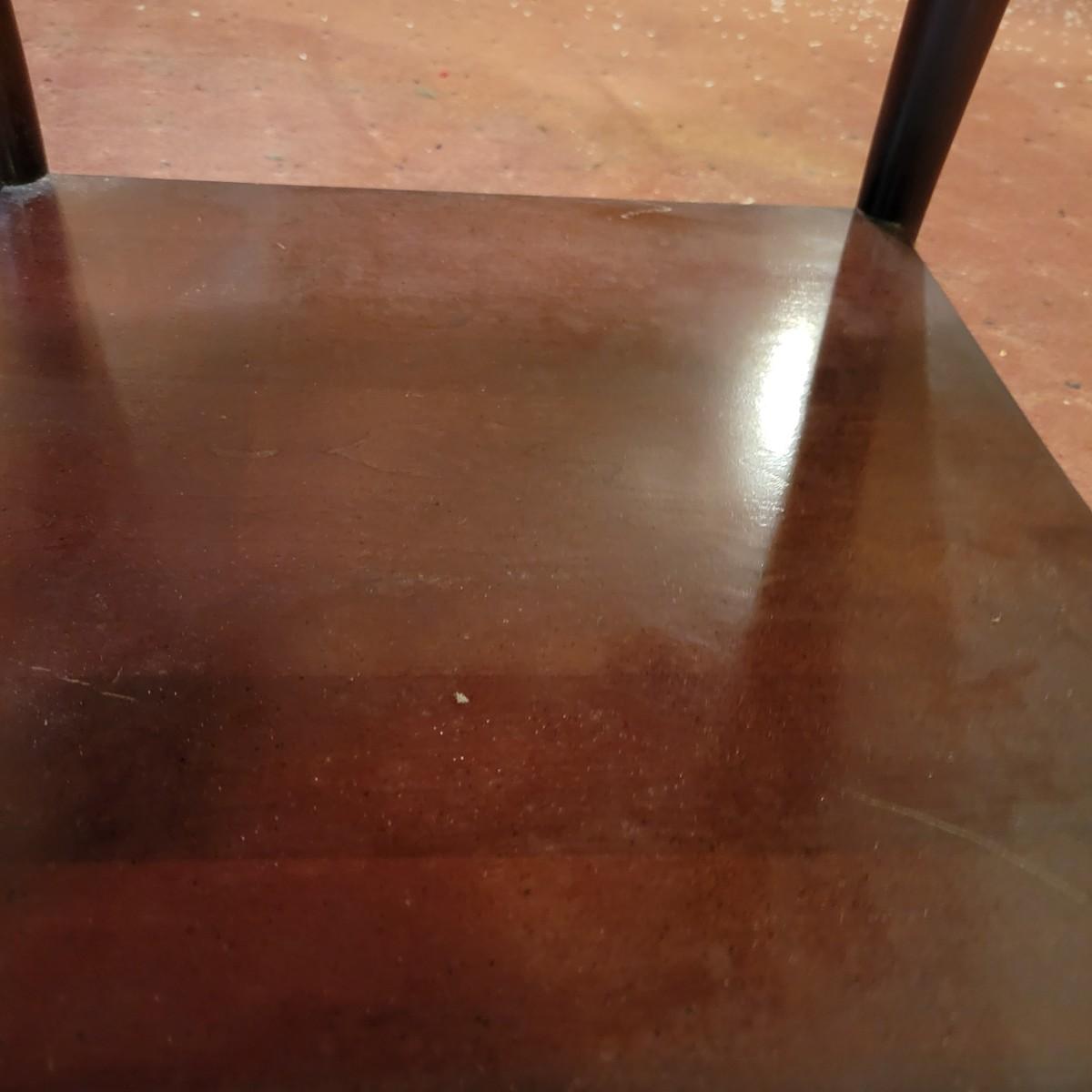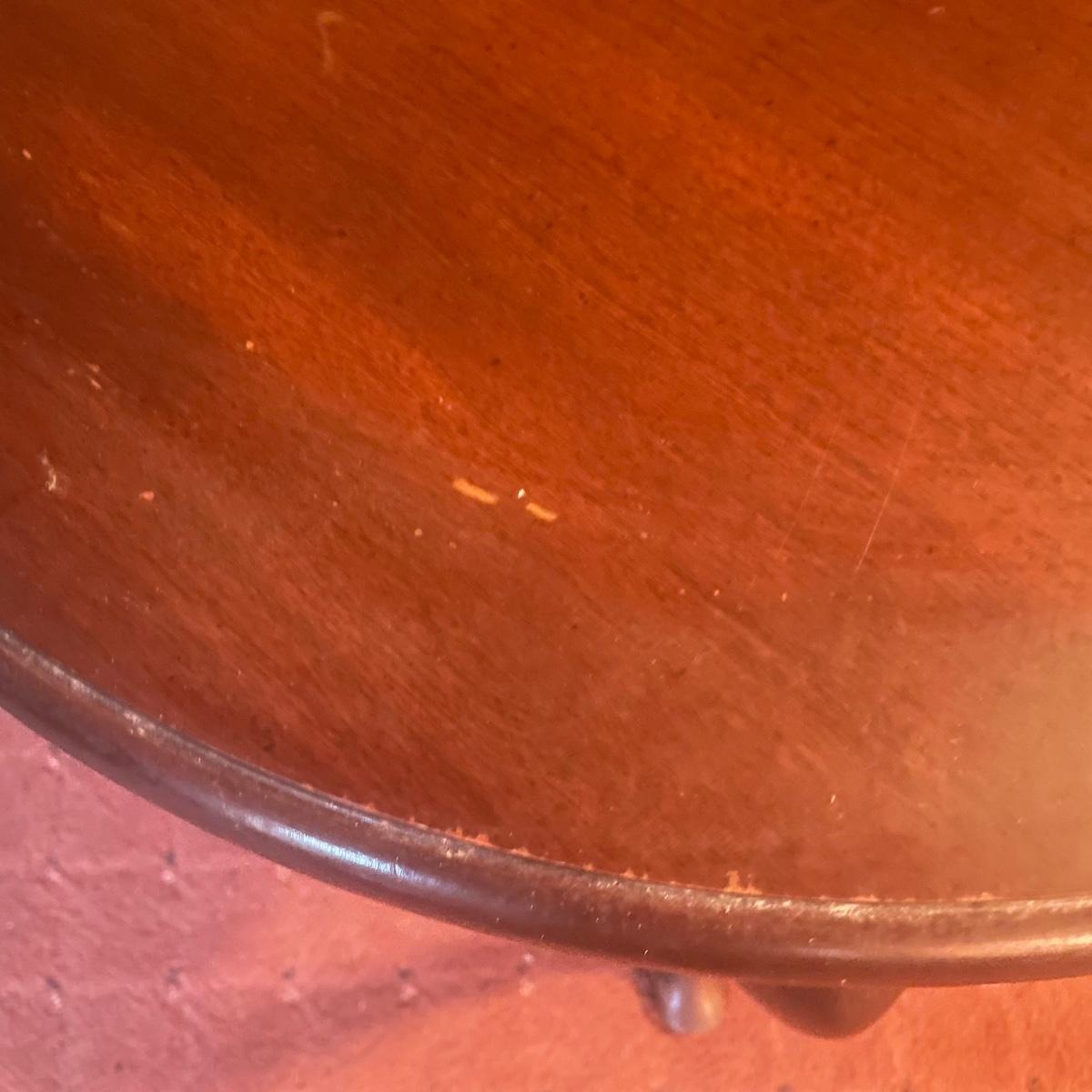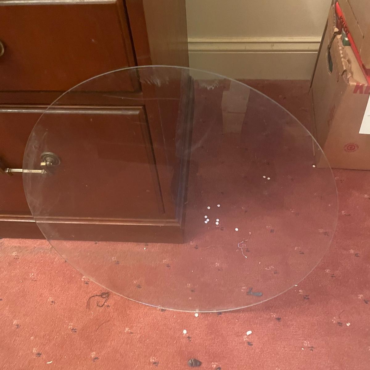 A wooden, round end table with a small glass topper in good condition with some minor blemishes and scratches. Glass top is removable and has some light scratches and is dirty. Table features a dark cherry stain and one shelf. Measures approximately 25" x 22.5". Local pickup only