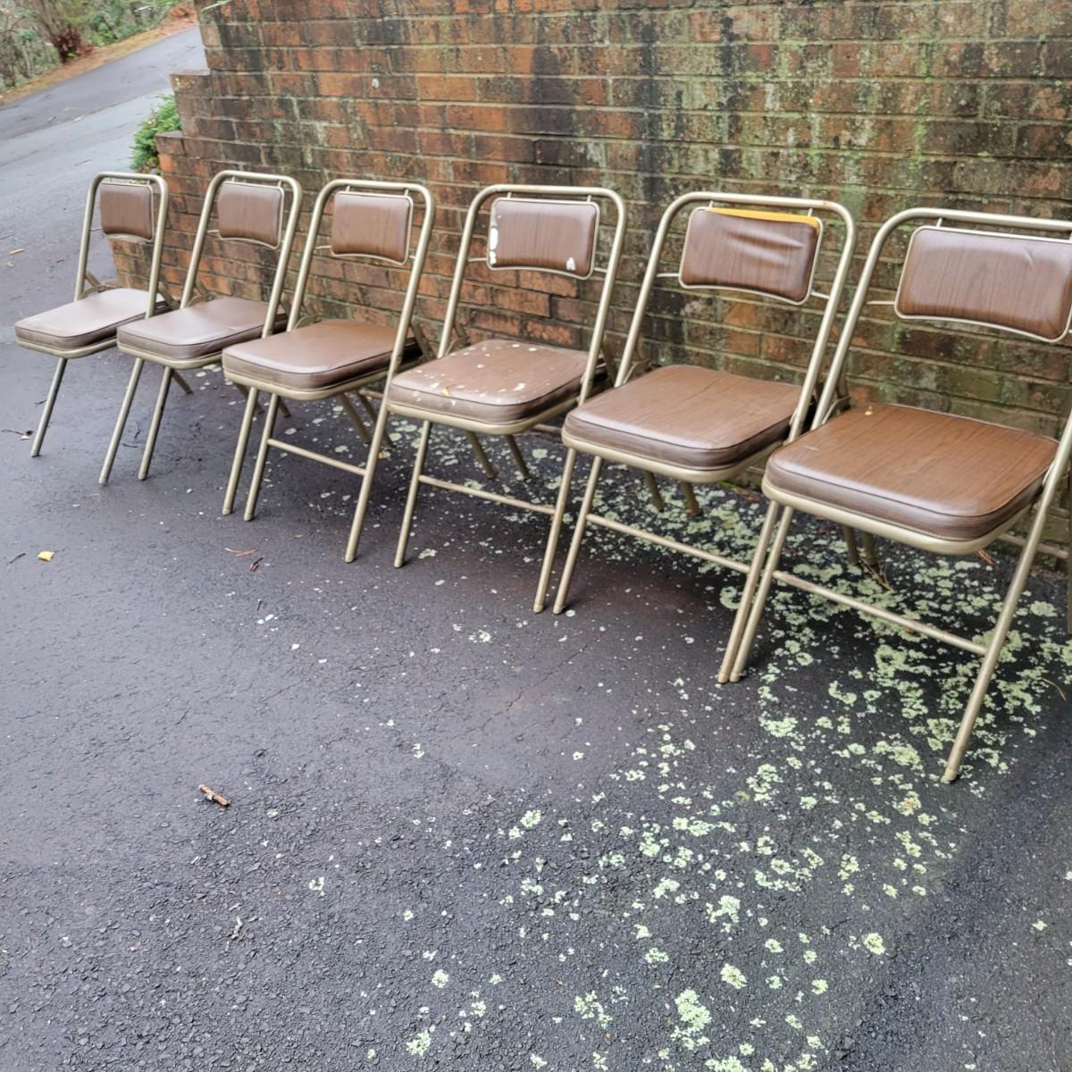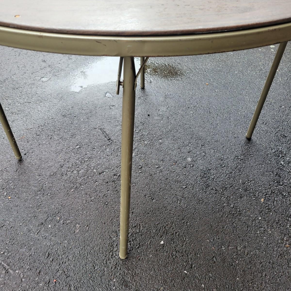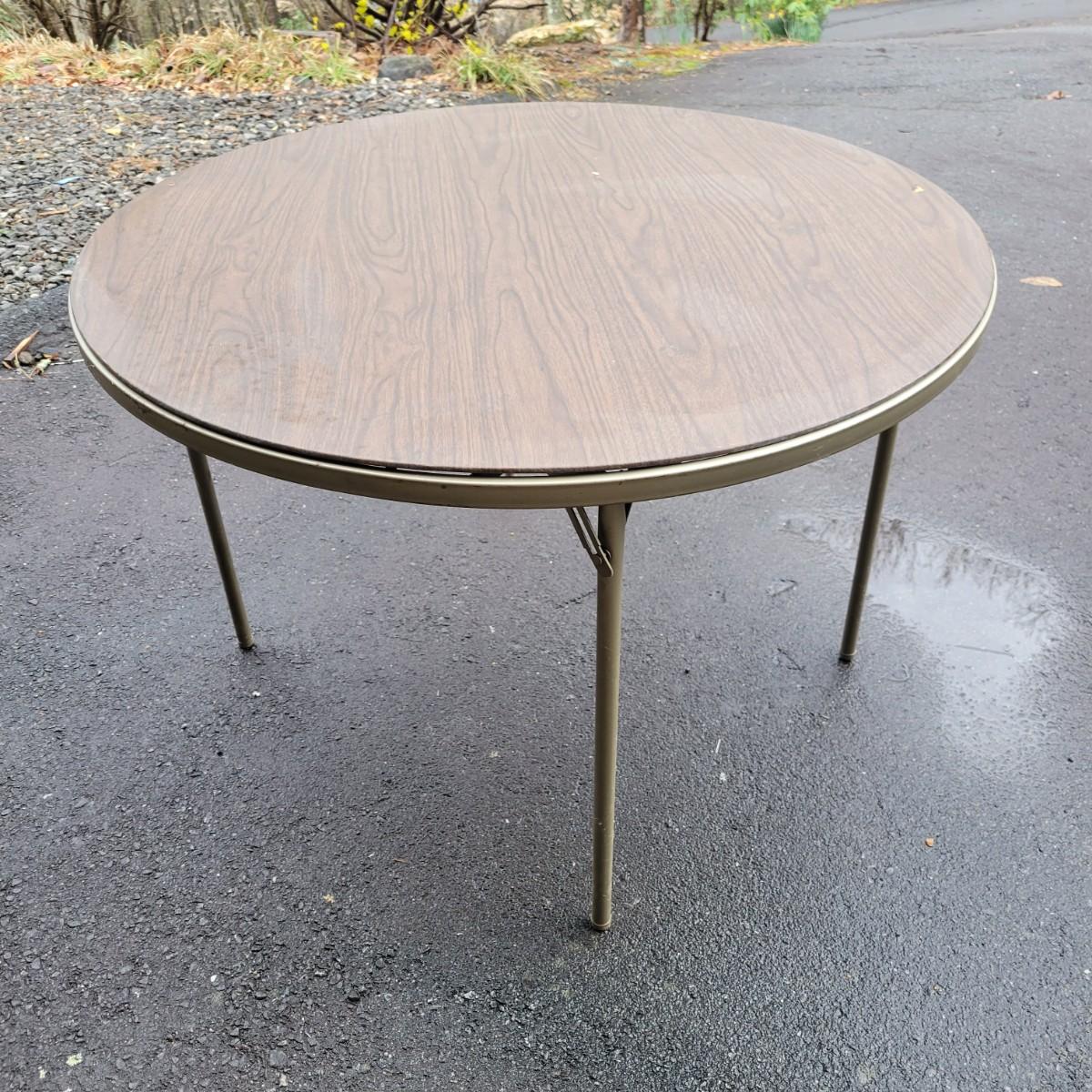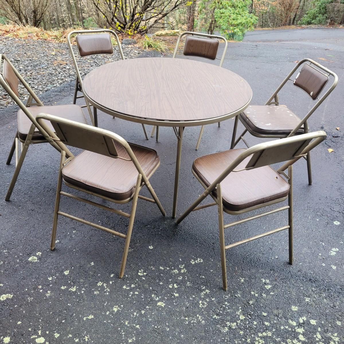 A round folding table and matching chairs that do have some blemishes and damage. This table has a metal frame with a vinyl wood grained top and measures approximately 40"D x 27"H. The six matching chairs measure approximately 17" x 19" x 30.5"H with a seat height of 18.5". Local pickup only