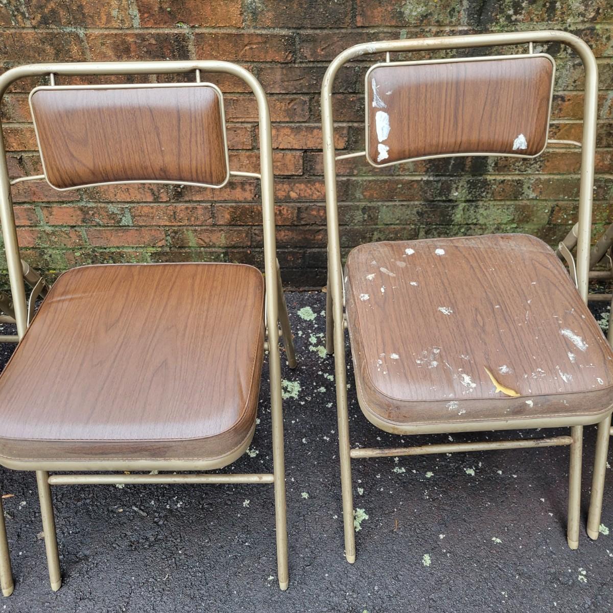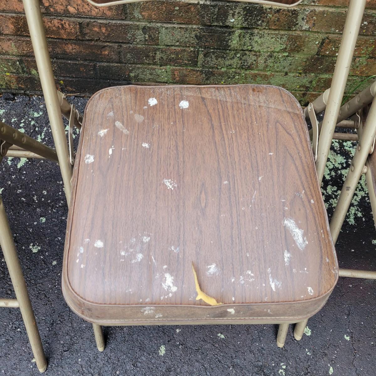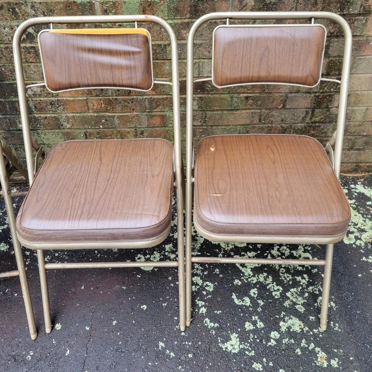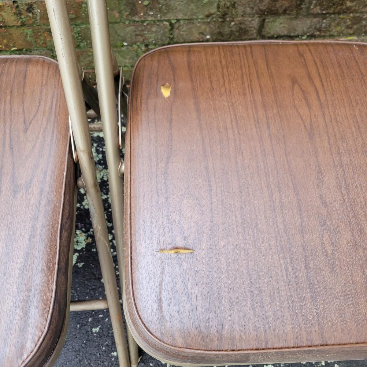 A round folding table and matching chairs that do have some blemishes and damage. This table has a metal frame with a vinyl wood grained top and measures approximately 40"D x 27"H. The six matching chairs measure approximately 17" x 19" x 30.5"H with a seat height of 18.5". Local pickup only