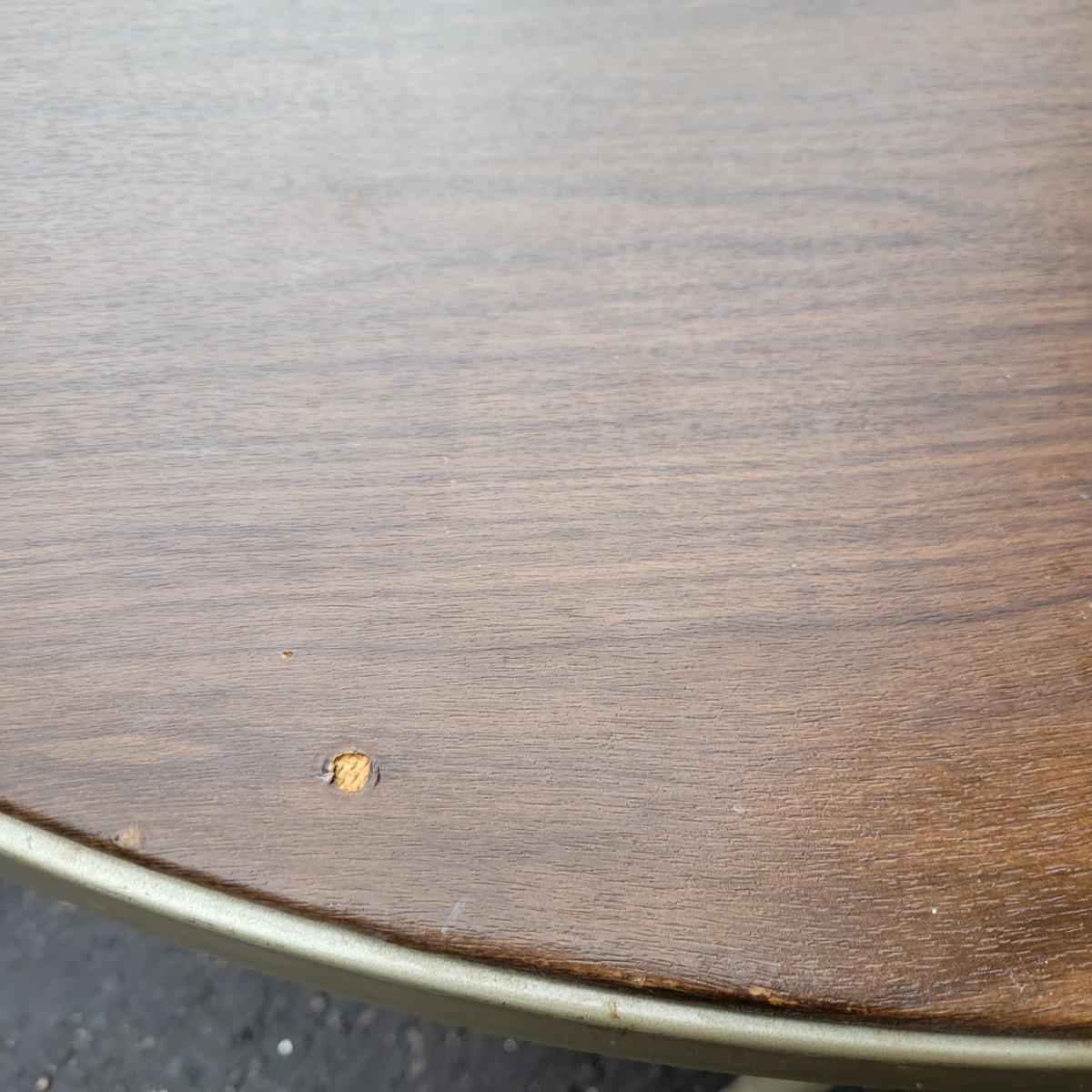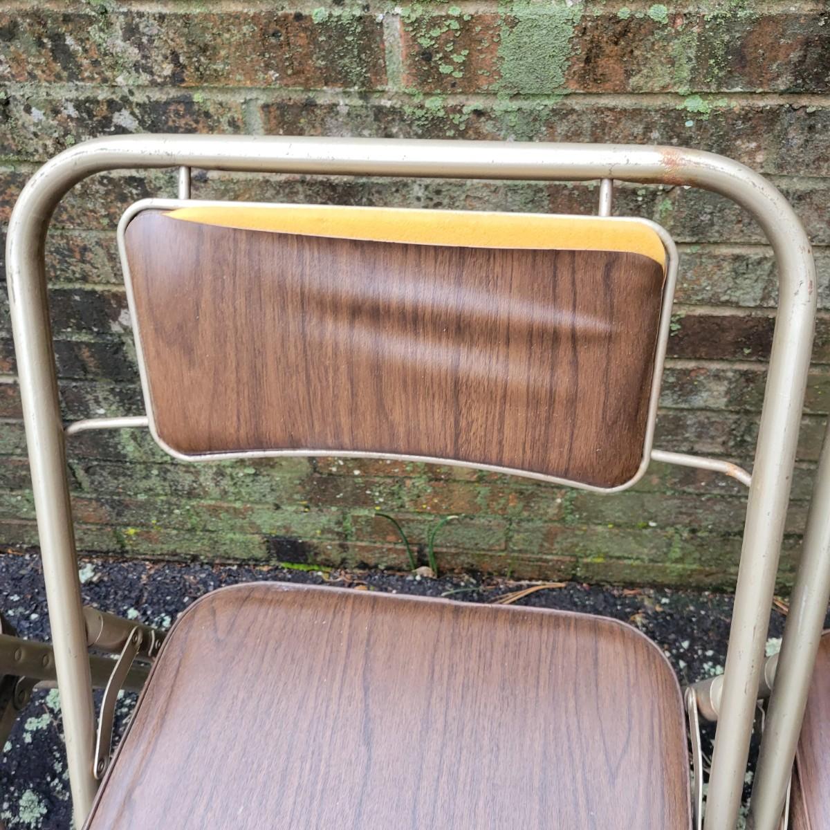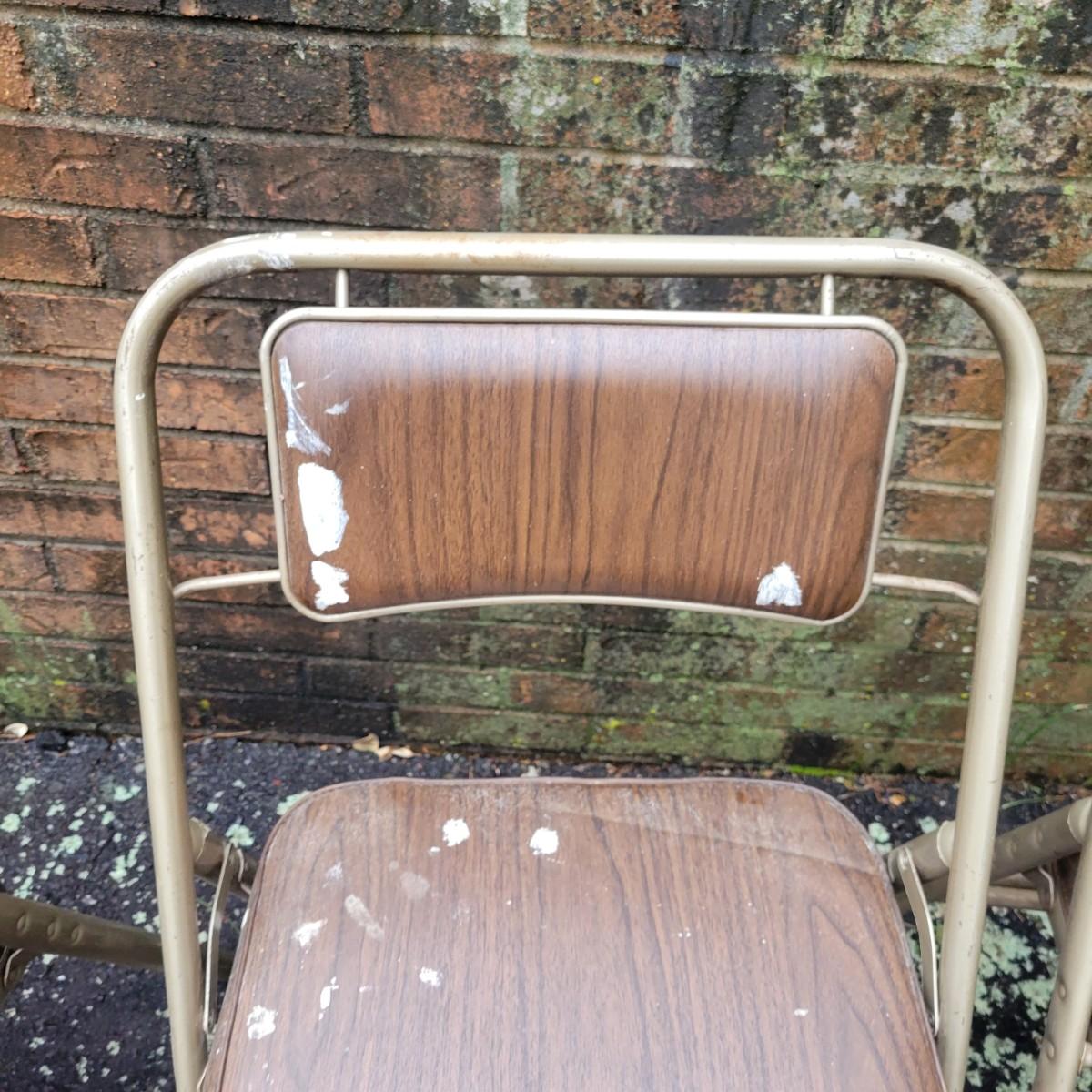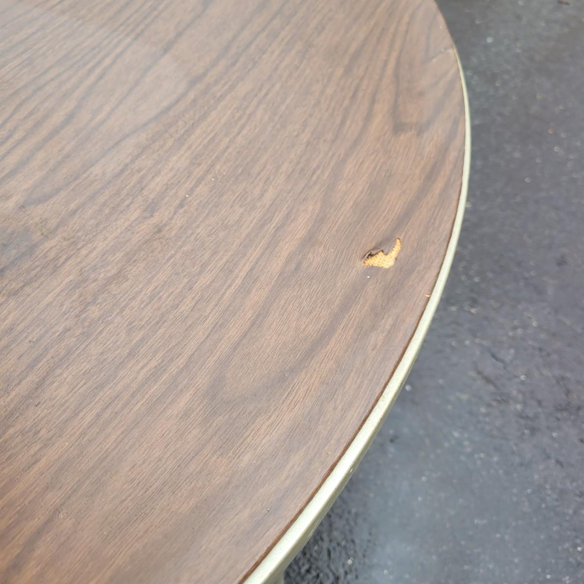 A round folding table and matching chairs that do have some blemishes and damage. This table has a metal frame with a vinyl wood grained top and measures approximately 40"D x 27"H. The six matching chairs measure approximately 17" x 19" x 30.5"H with a seat height of 18.5". Local pickup only
