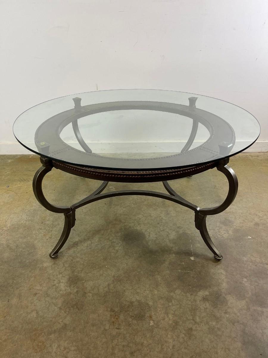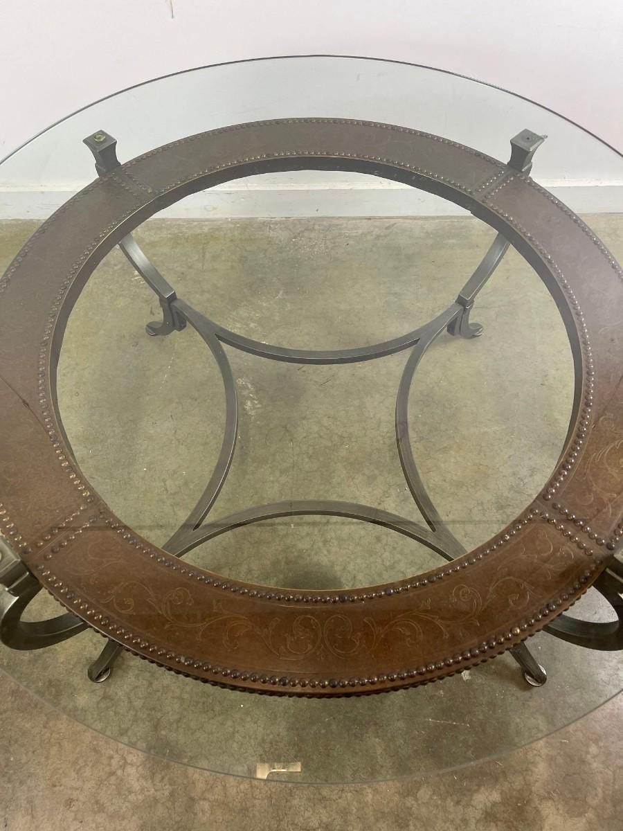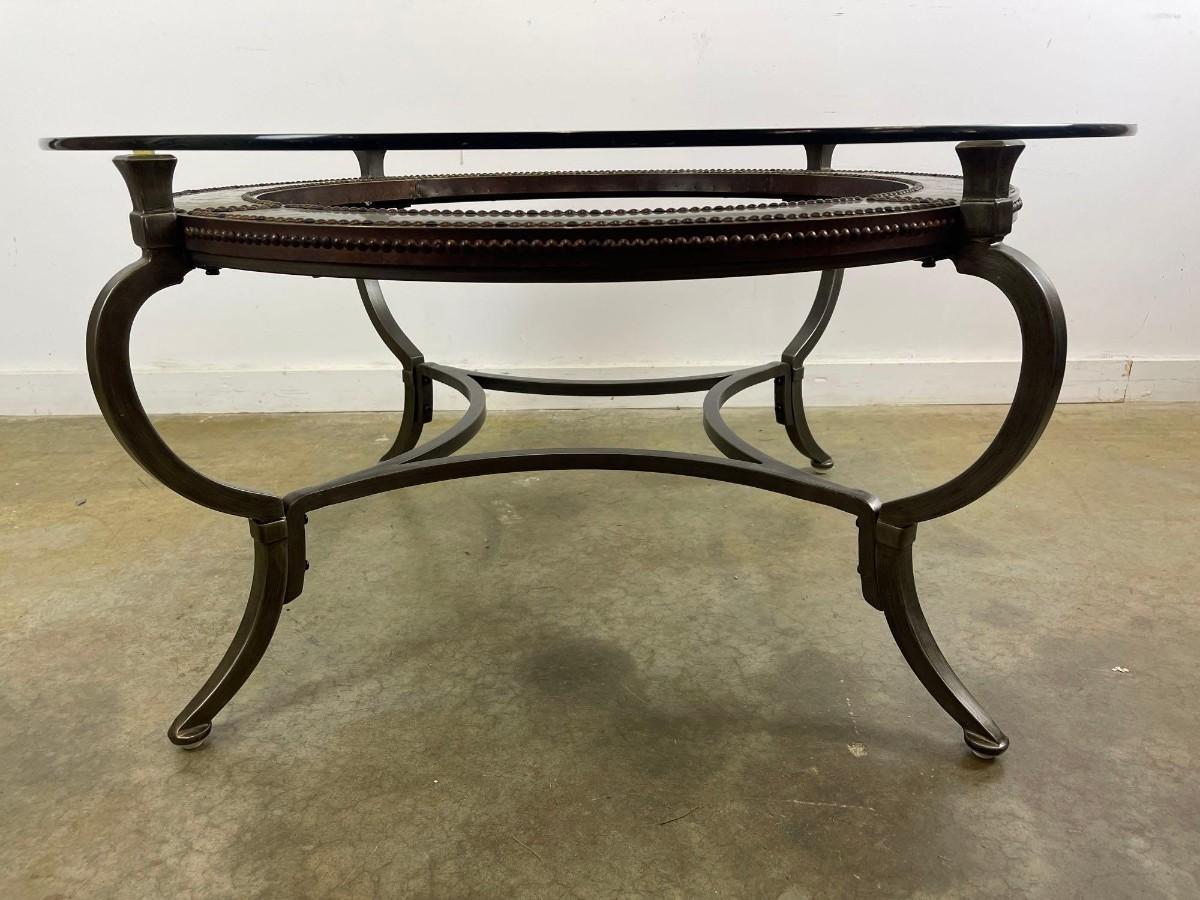 Round Glass Top Coffee Table with Metal Frame & Nail Head Trim. Very good condition, minimal signs of wear.