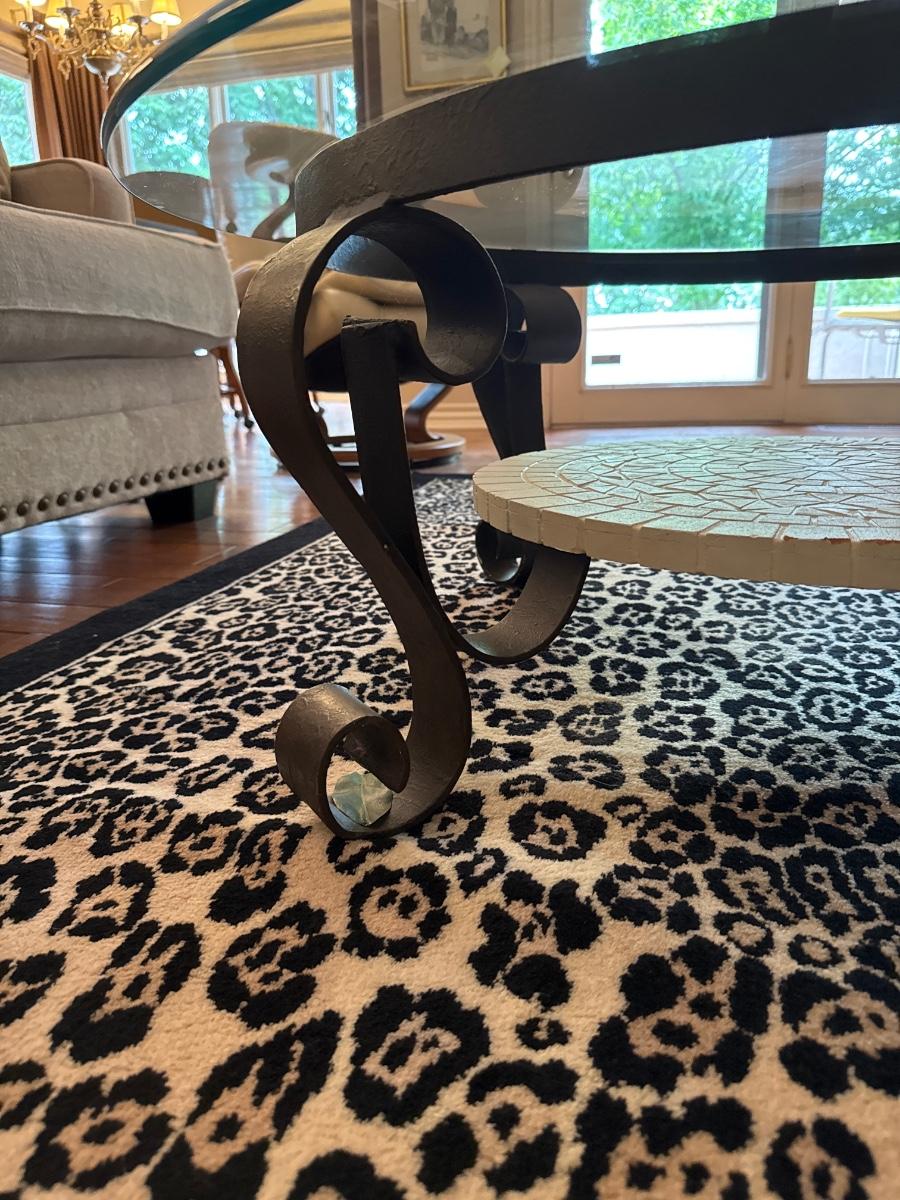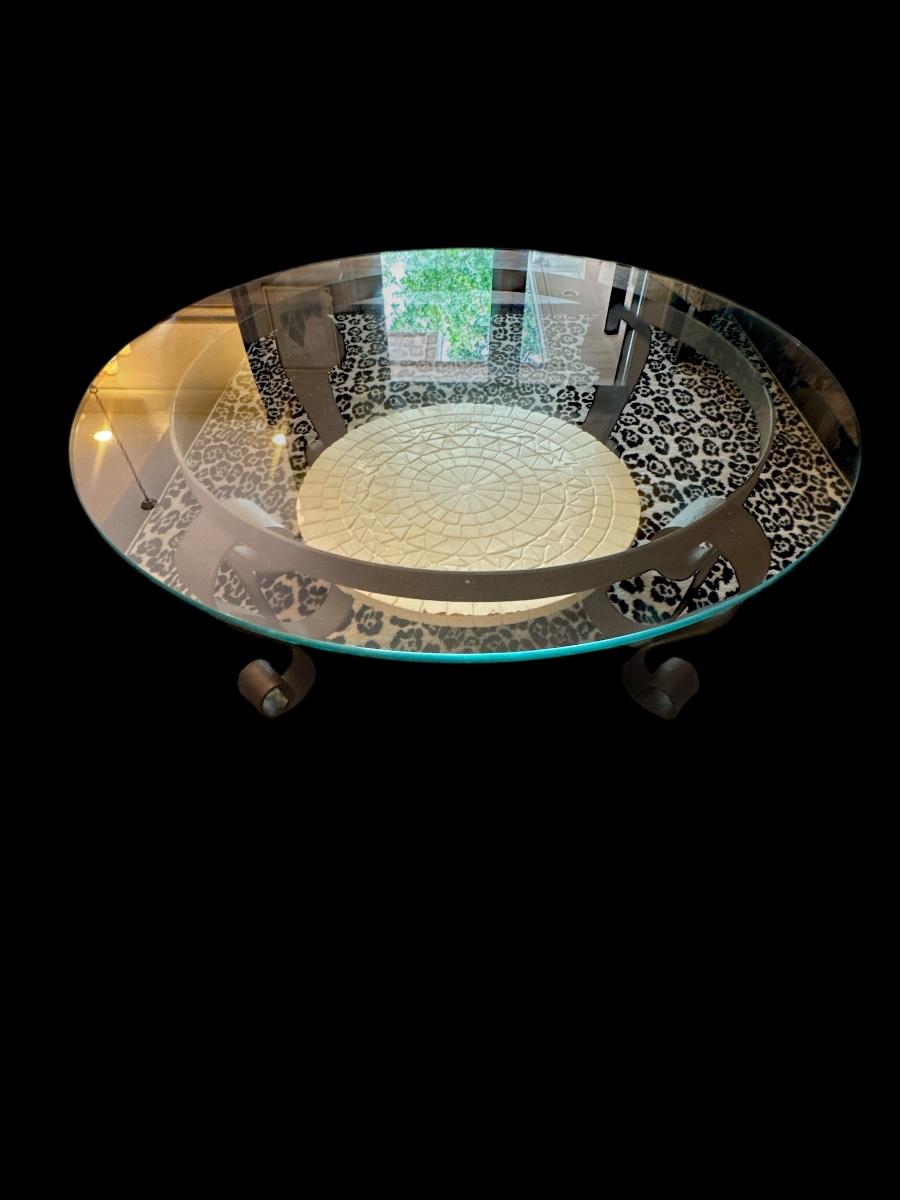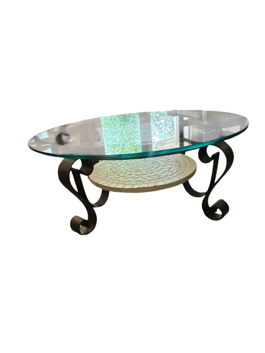 40” Diameter glass top coffee table with metal legs and ceramic bottom shelf