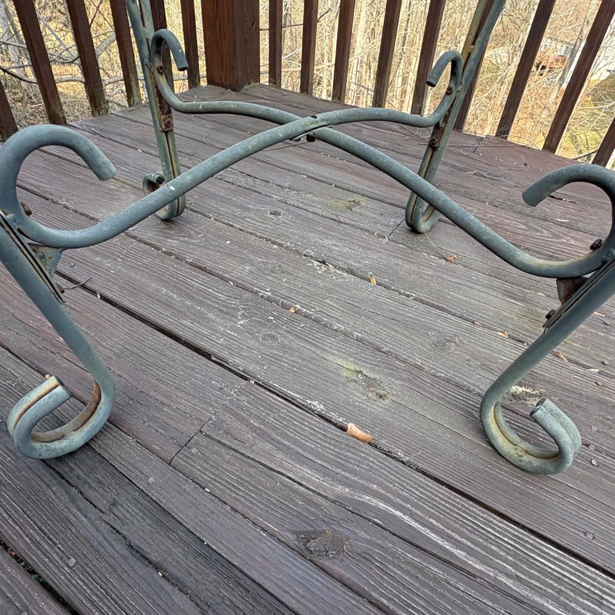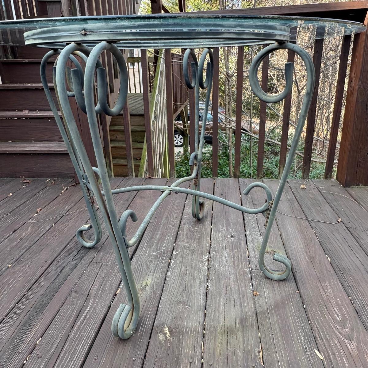 This glass-top wrought iron patio tables features a removable glass top and has measurements of approximately 42"D x 30"H