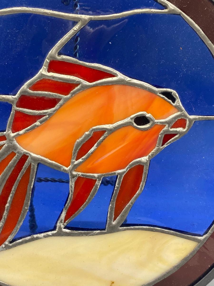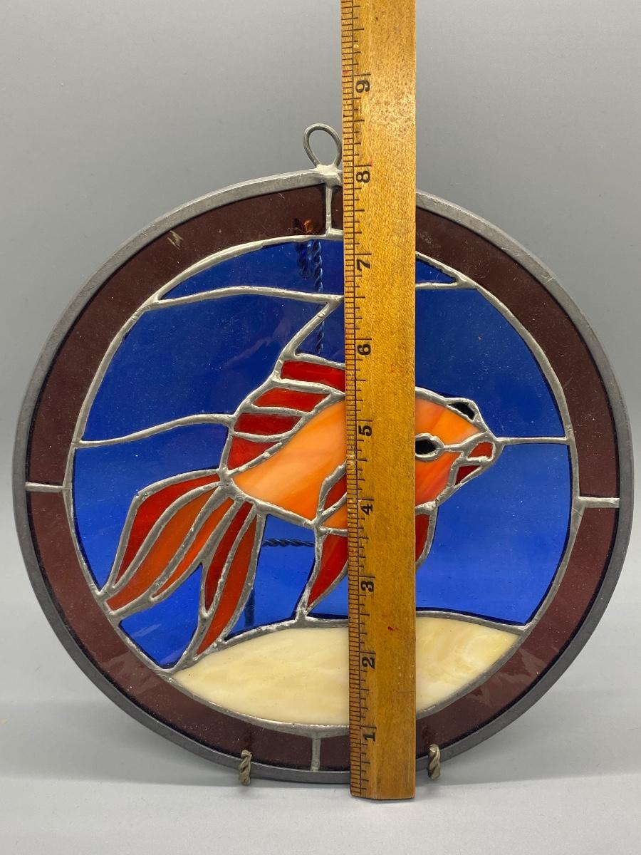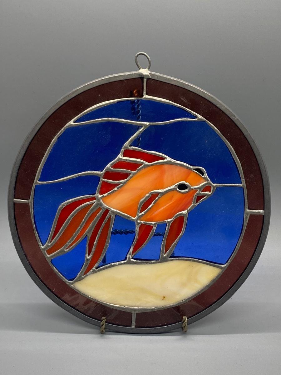 Round stained glass window art featuring a goldfish in the center. About 8" size. Good condition.