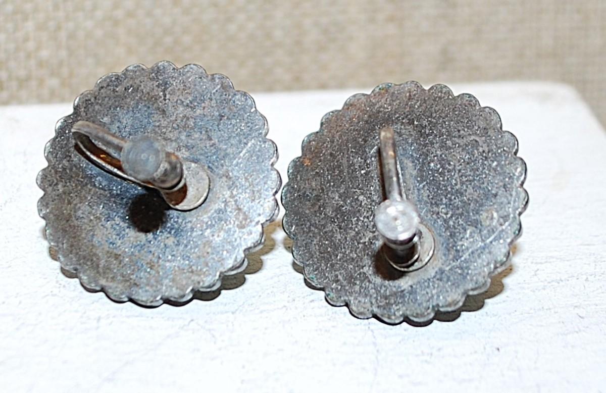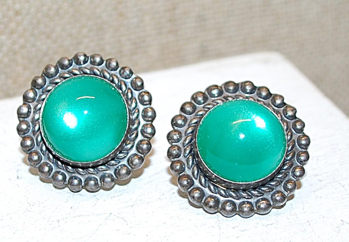 Round GREEN Glass Stone Earrings (1" Circ.) with Metal Globes Surround with a Screw-On Clasp