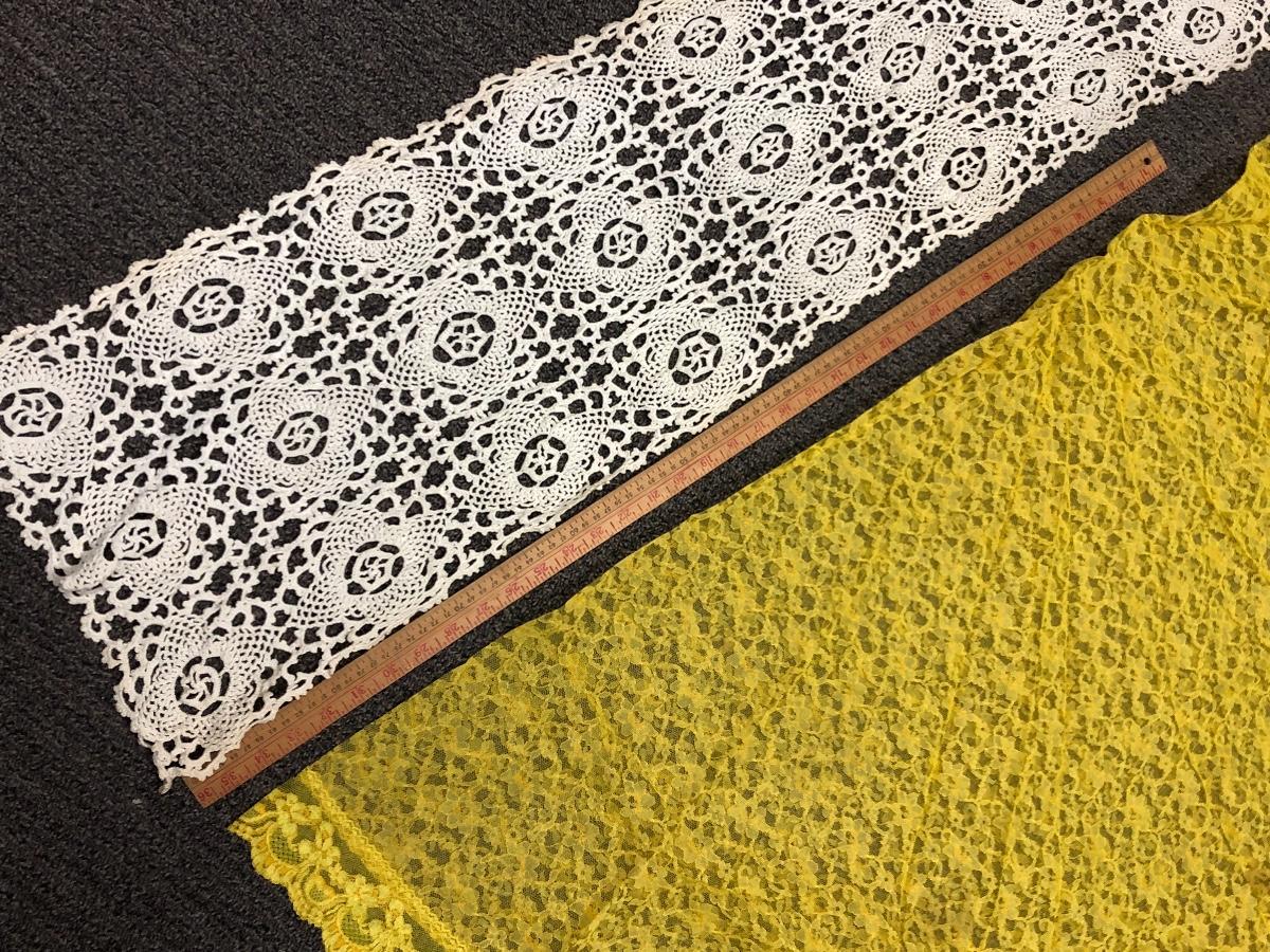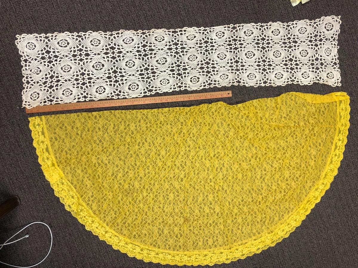Round lace tablecloth, Goldenrod Yellow color, and crocheted table runner. Yellow lace tablecloth about 62 inches round. Ivory colored table runner measures approx 12” x 55”. Both are in good vintage condition, may have some light stains but nothing bad.