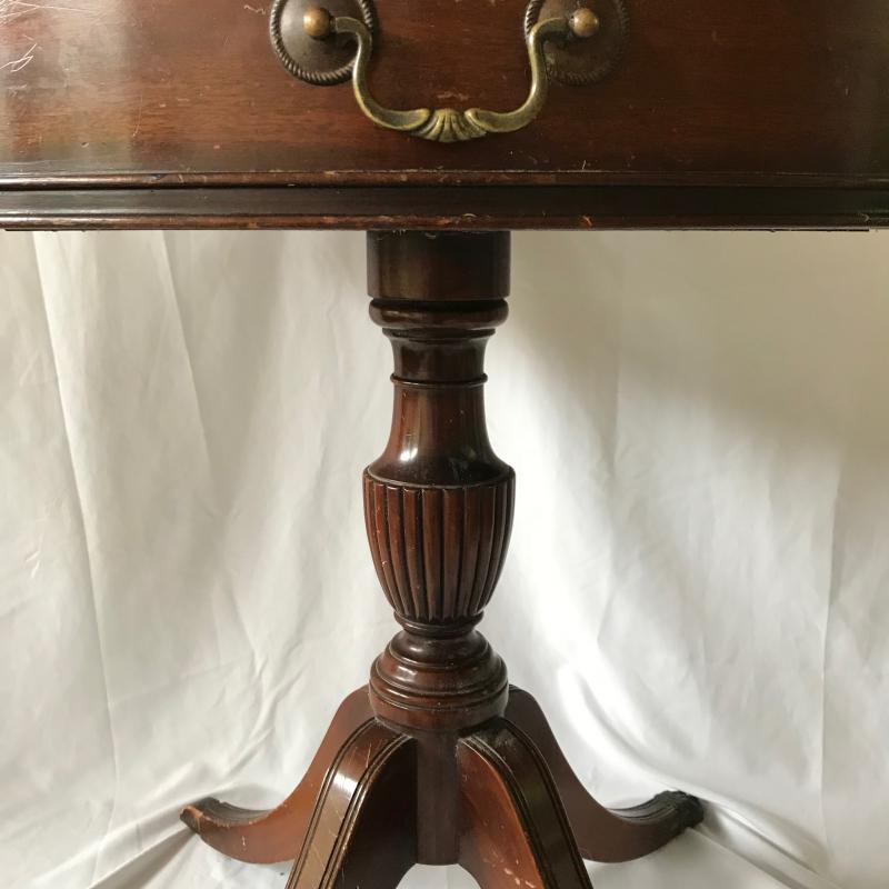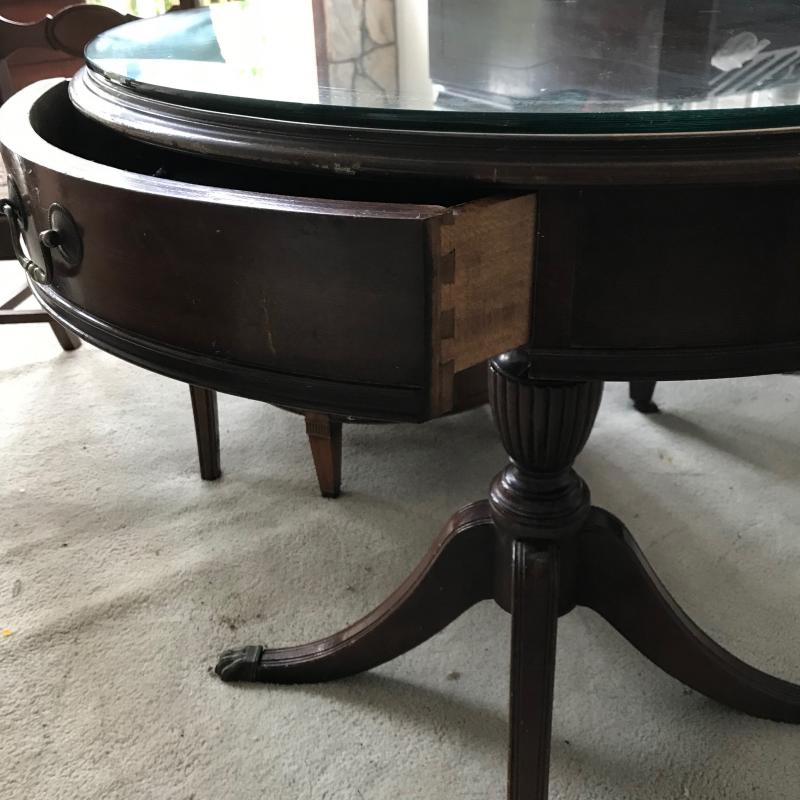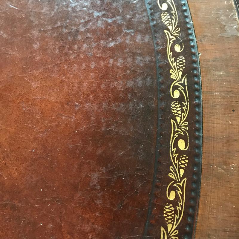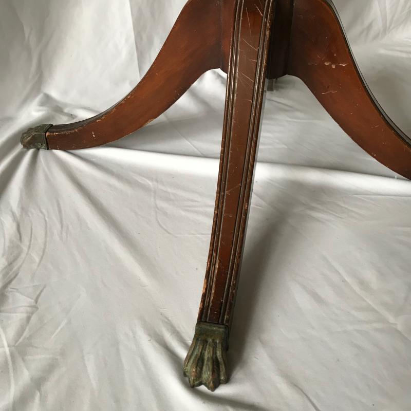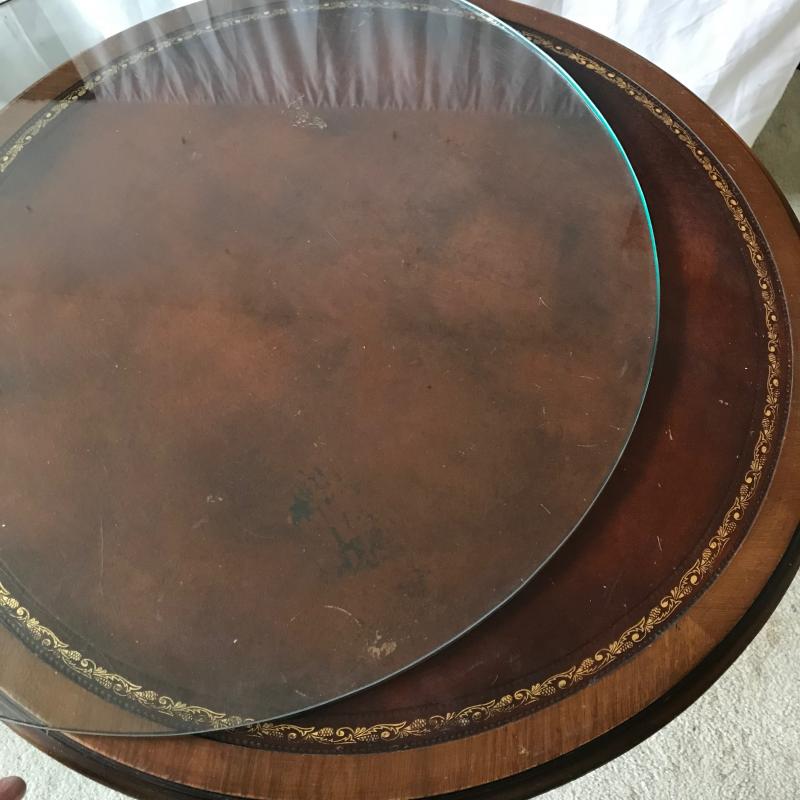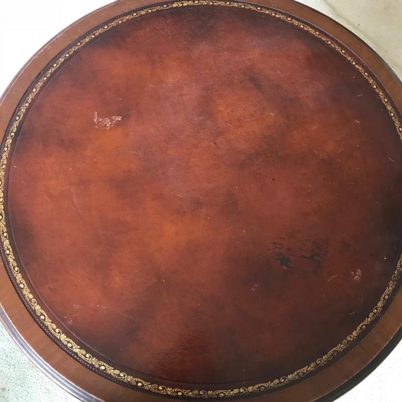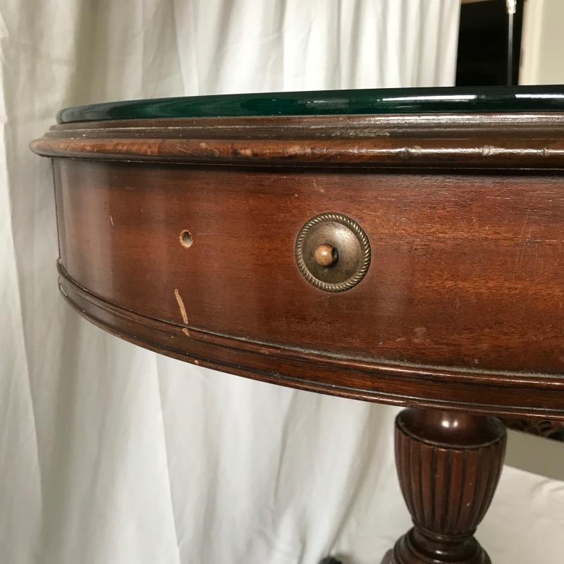 Leather top side table with one drawer and three faux drawers. One handle broken but can be fixed. Leather and Wood have markings. See photos. Metal claw feet. Glass top can be removed. 28” in diameter, 28” tall. No shipping available. Local pickup only in Hendersonville, NC.