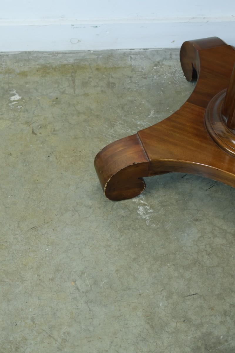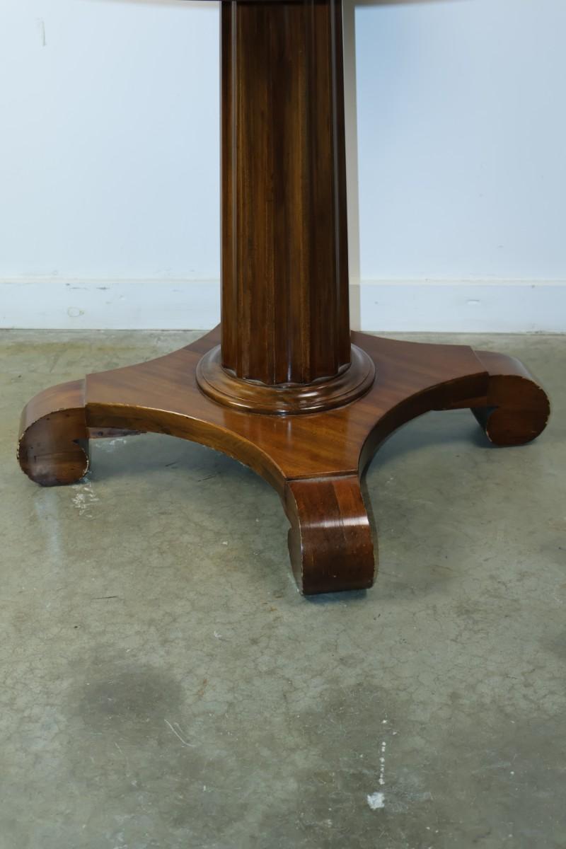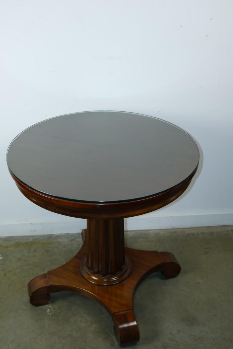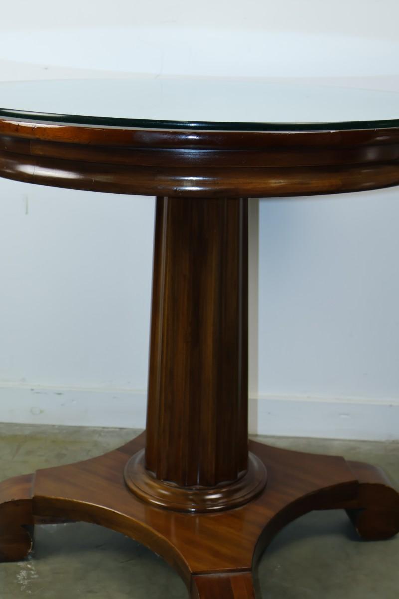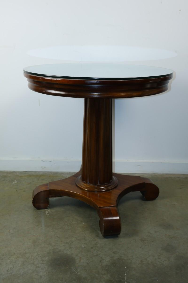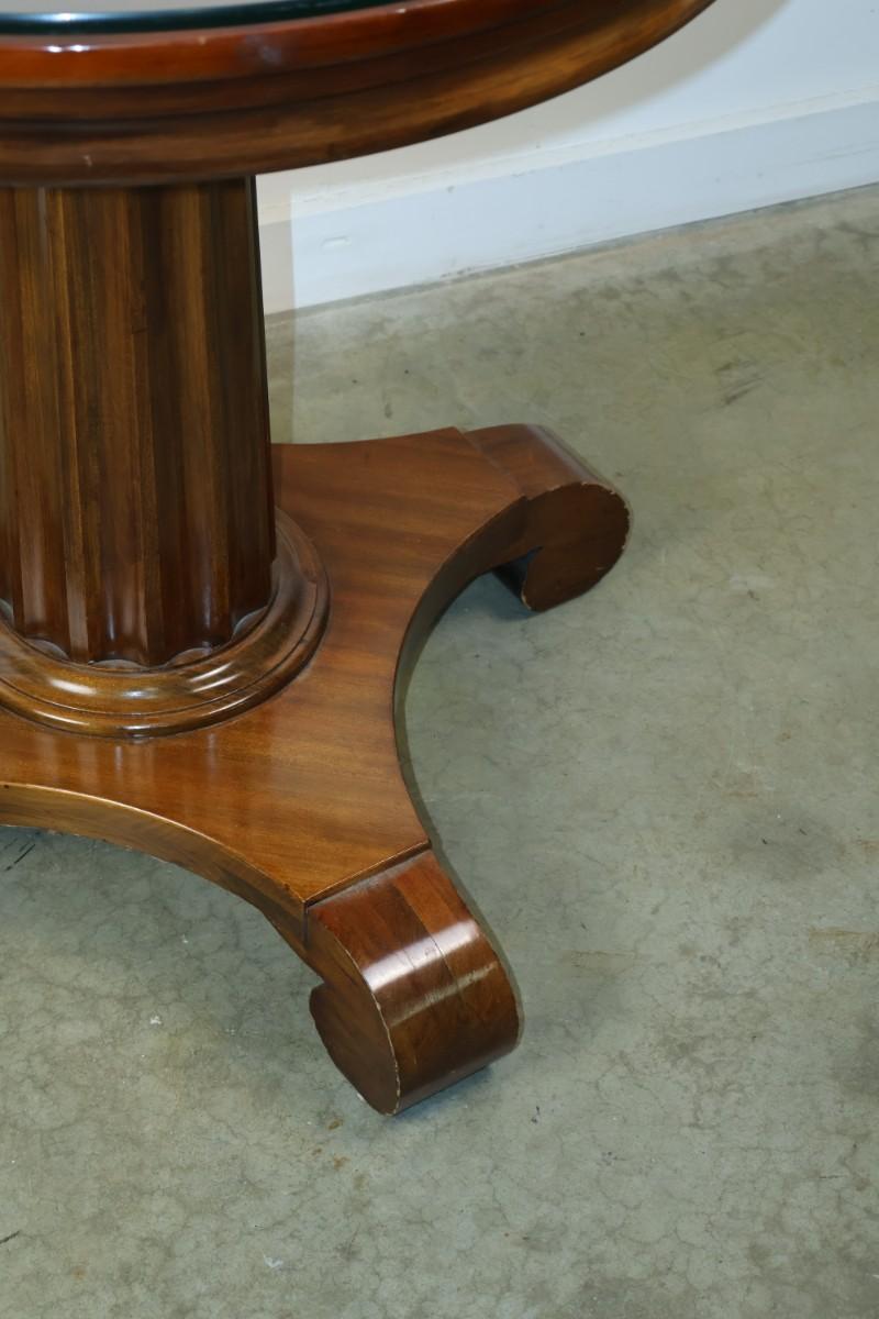 Round mahogany pedestal table. Comes with glass top. 30" round.