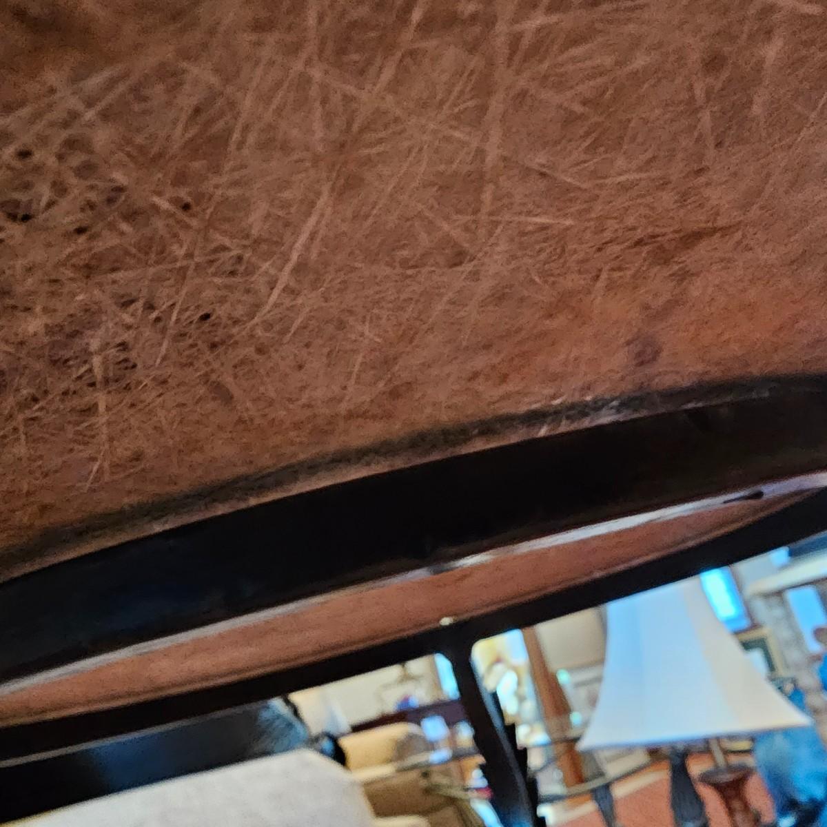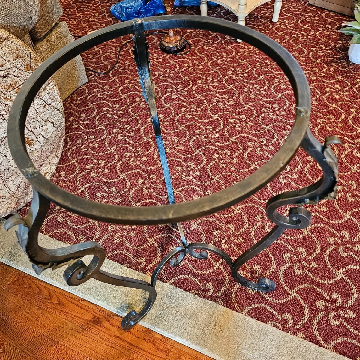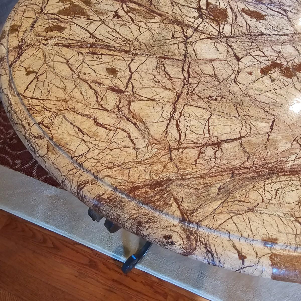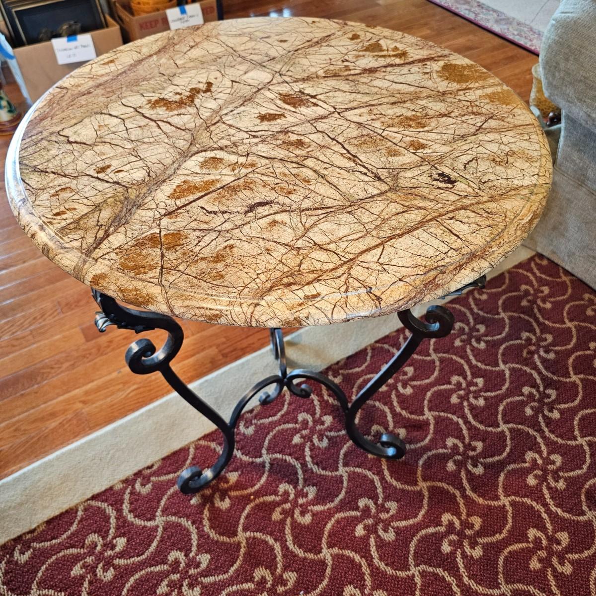 Brown/tan faux marble table with cast iron tripod base. Beveled edge on top, measures 24'D x 28.5"H. Top is fiberglass reinforced underneath. Base has swirled design and leaves on uprights. See photos for details. Local pickup only.