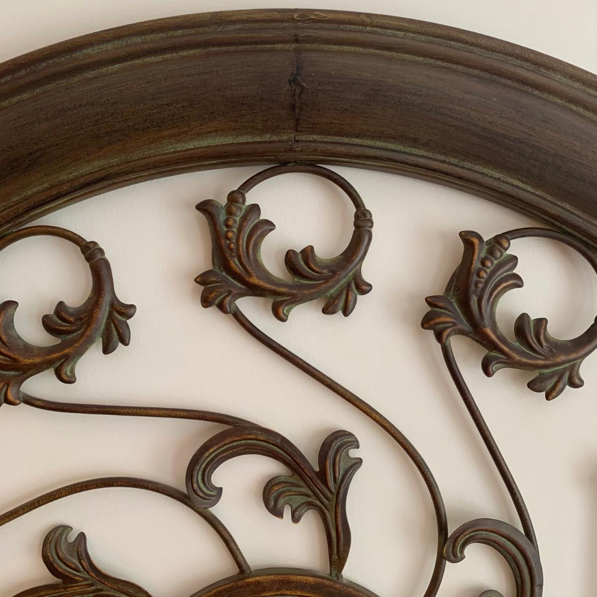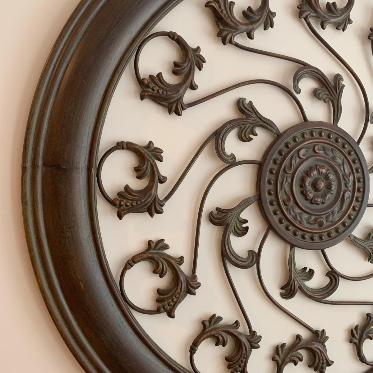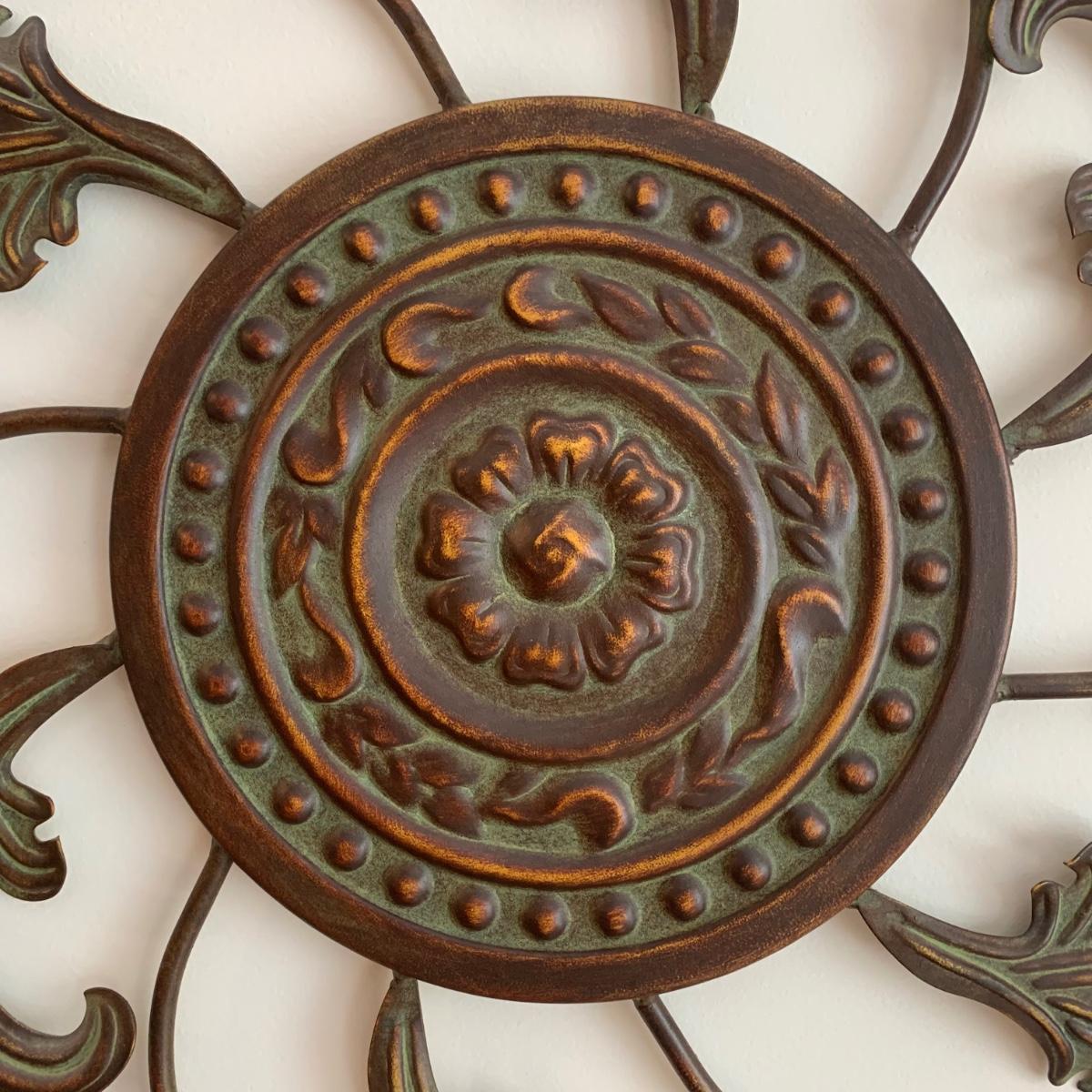 This large round metal wall hanging is a lovely focal point for any room. It features a flower in the center, with intricate scrollwork radiating from the center. It is a dark brown color with distressed green accents. It measures 38” in diameter. The back has holes to hang on screws on a wall. It is fairly heavy. Local pickup only.
