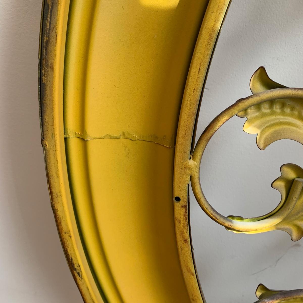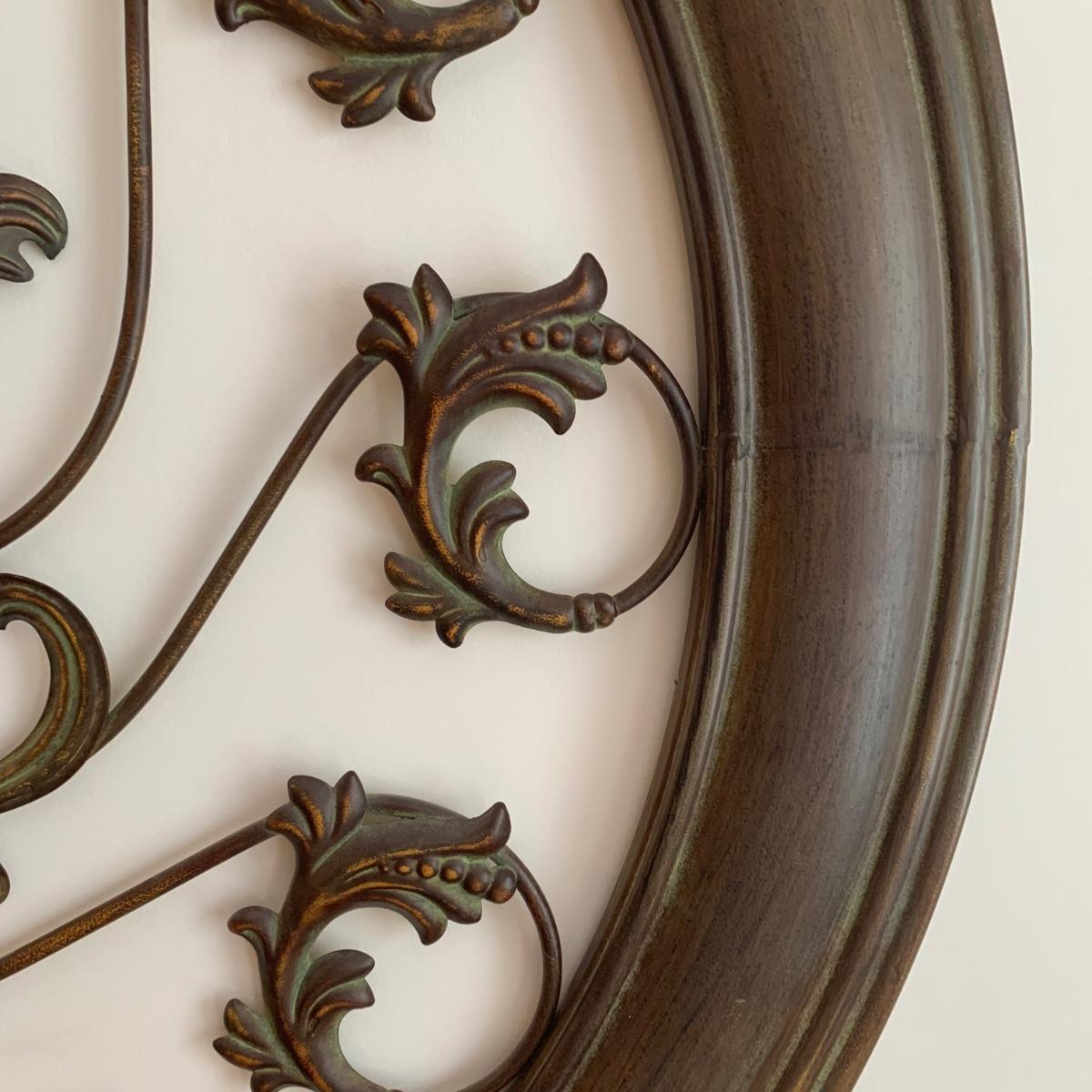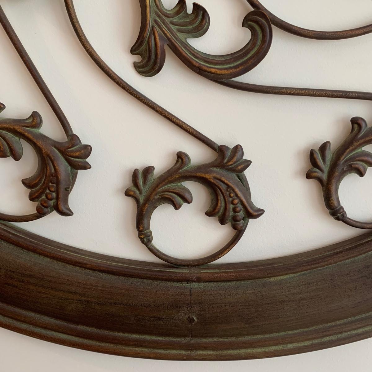 This large round metal wall hanging is a lovely focal point for any room. It features a flower in the center, with intricate scrollwork radiating from the center. It is a dark brown color with distressed green accents. It measures 38” in diameter. The back has holes to hang on screws on a wall. It is fairly heavy. Local pickup only.