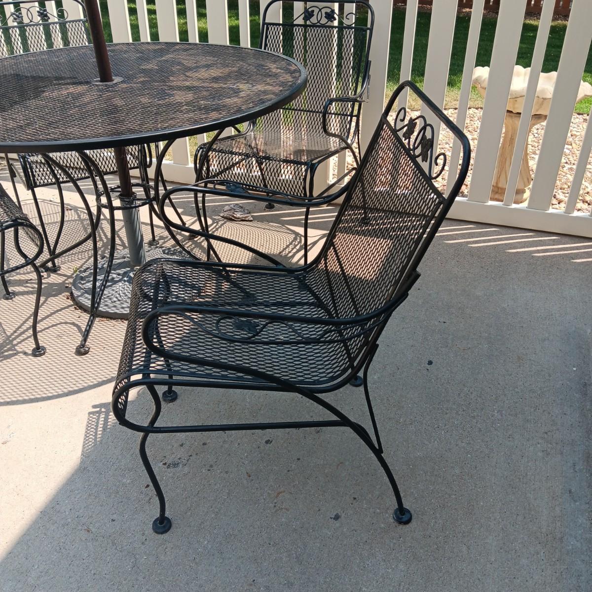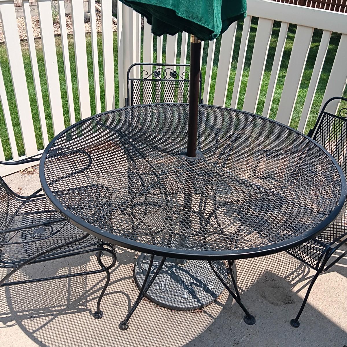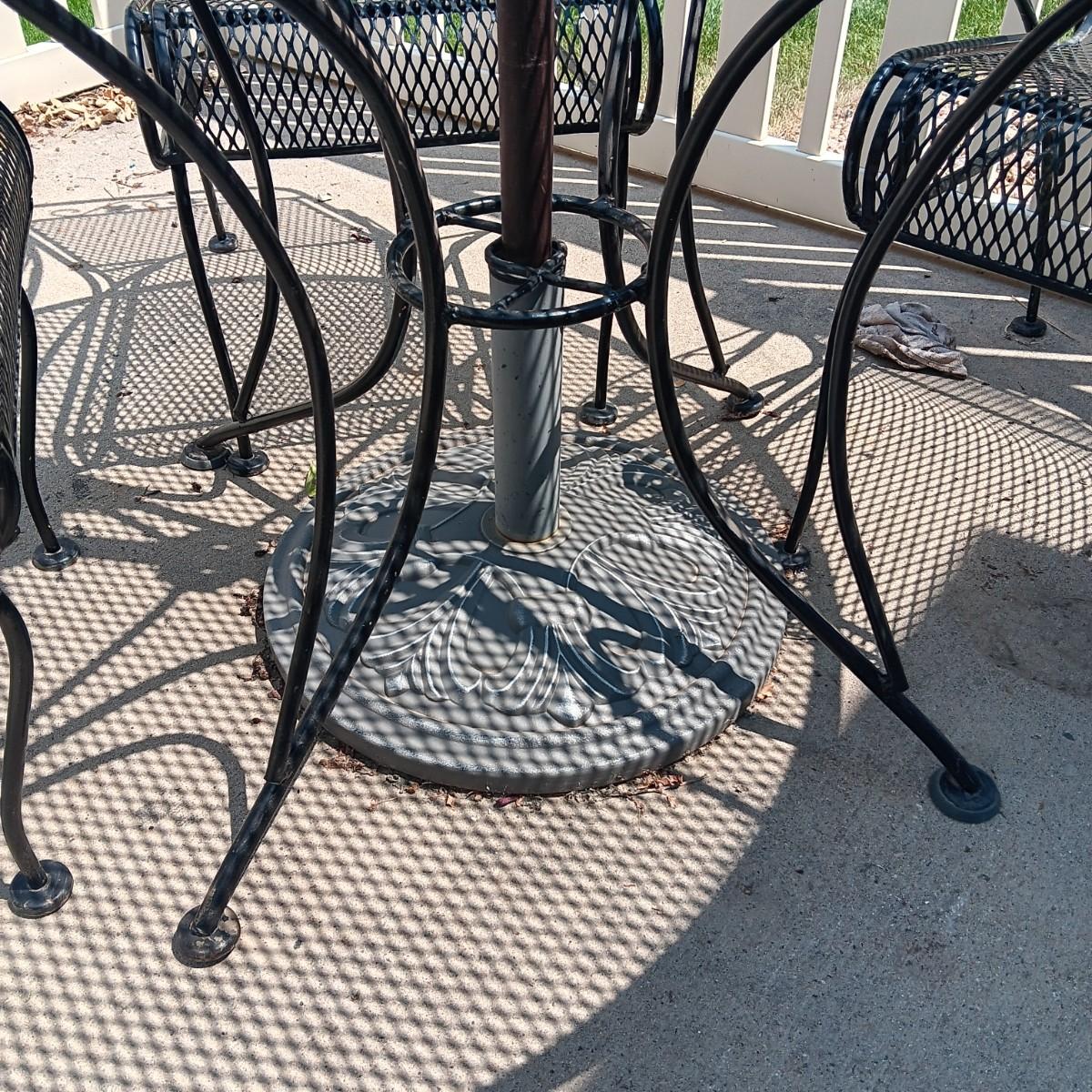 ROUND METAL MESH PATIO TABLE WITH 4 CHAIRS, UMBRELLA STAND AND UMBRELLA