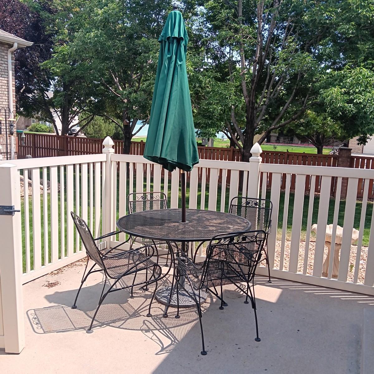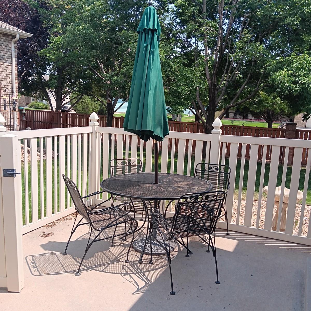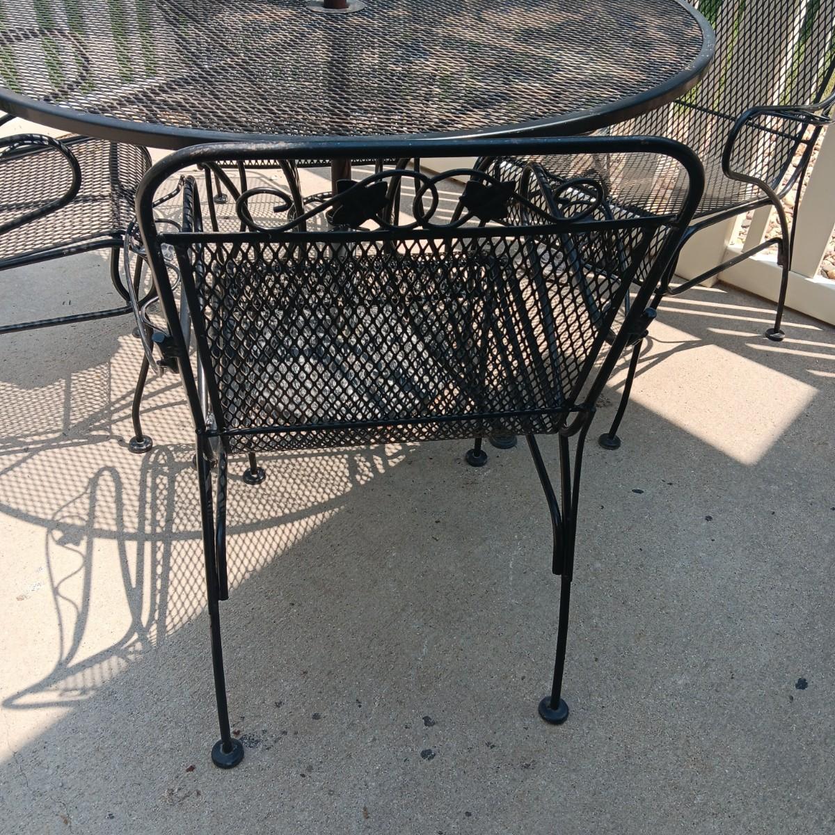 ROUND METAL MESH PATIO TABLE WITH 4 CHAIRS, UMBRELLA STAND AND UMBRELLA