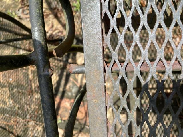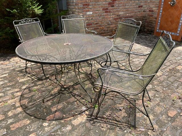 Round metal mesh Patio table with 4 chairs & umbrella hole. One chair needs 2 small welds.