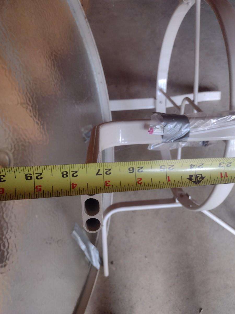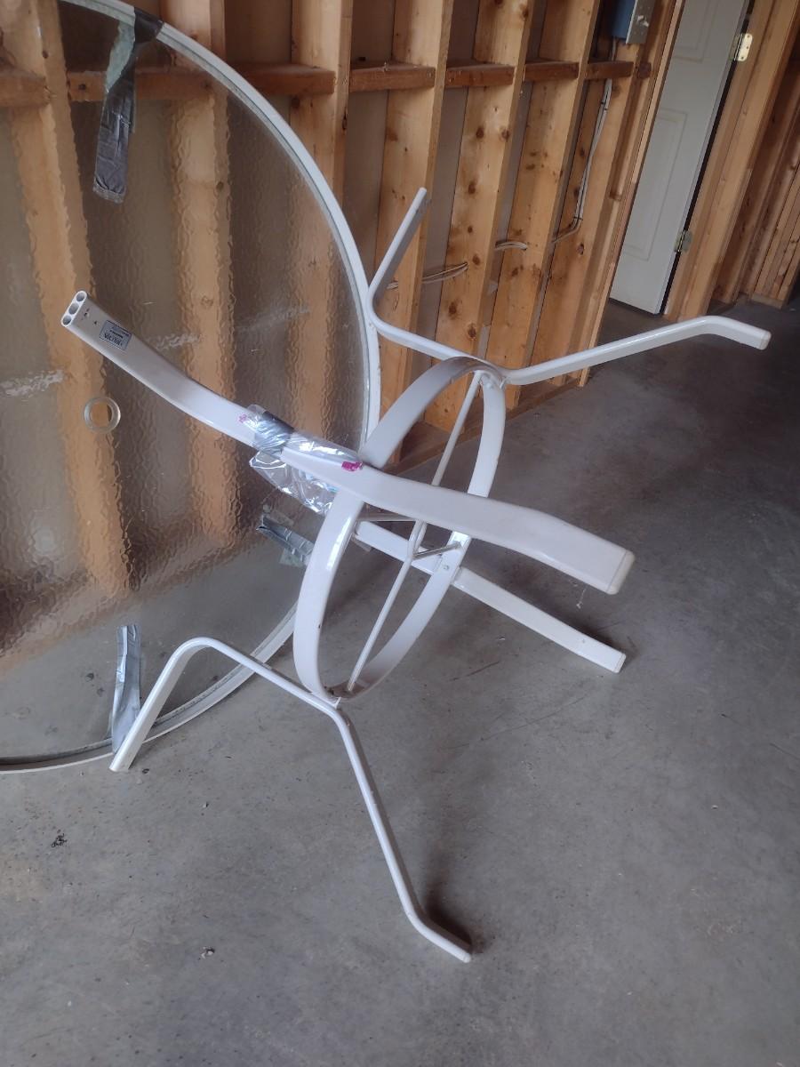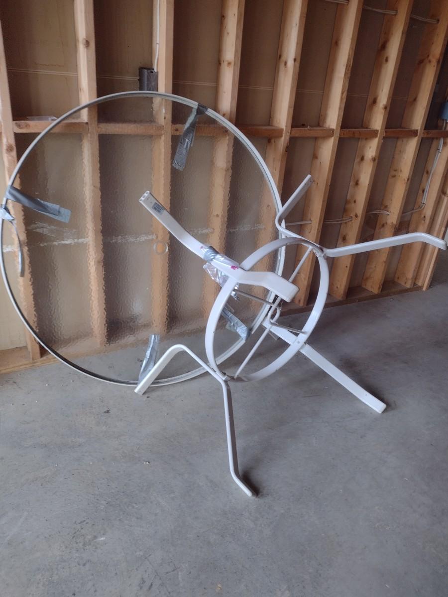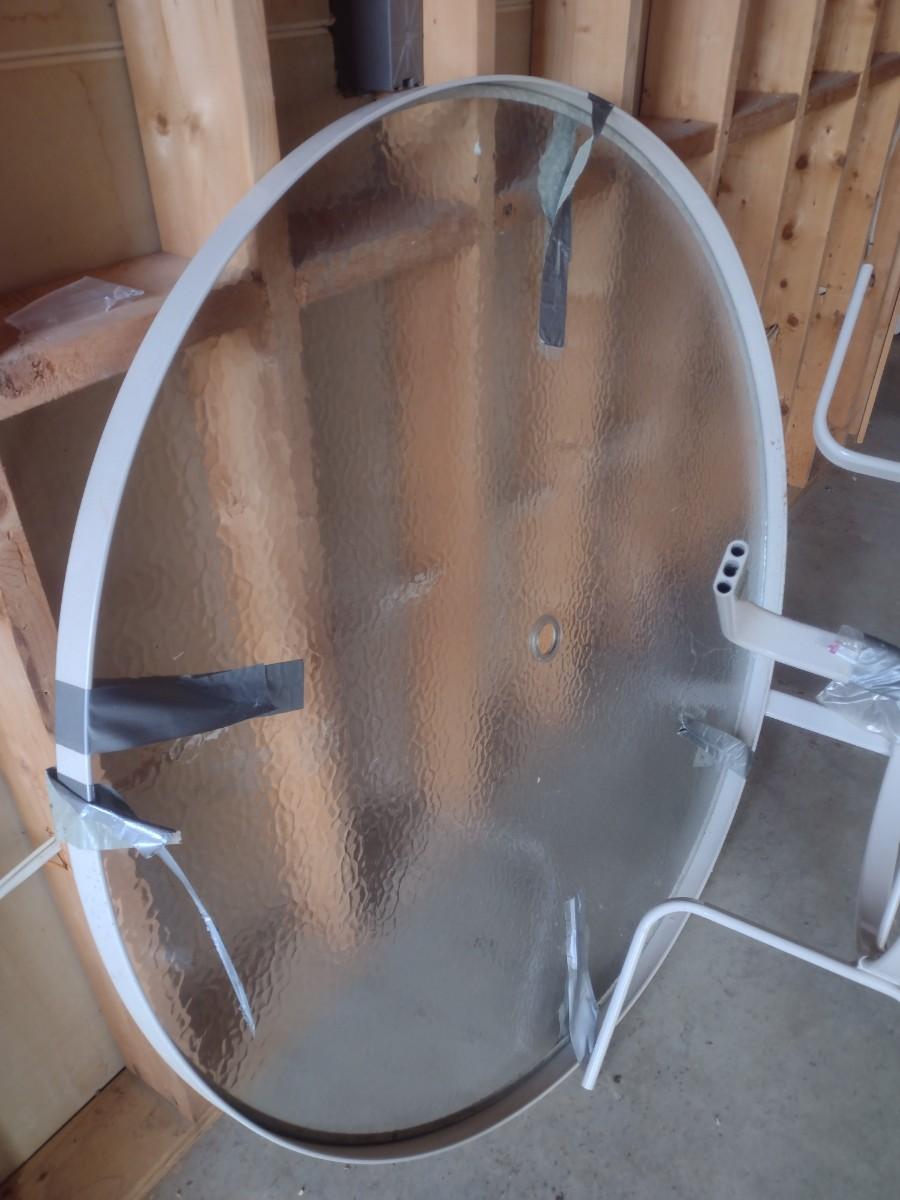 Round Metal Patio Table with Glass Top. Downstairs item. Table will have to be brought to main floor.