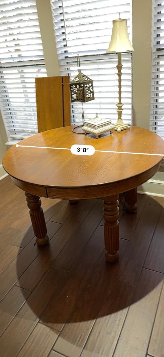 Round Oak Kitchen table with 2 leaves, lamp, candle & box