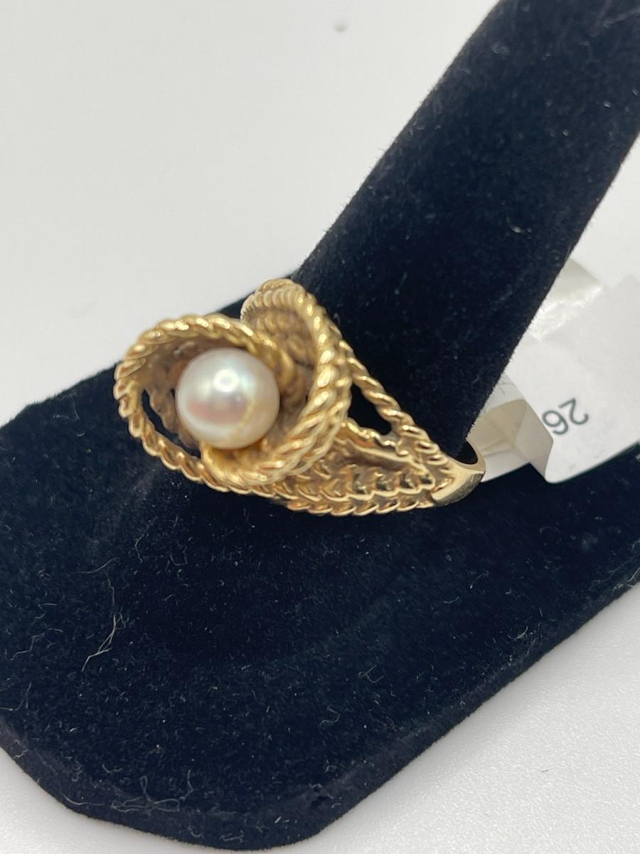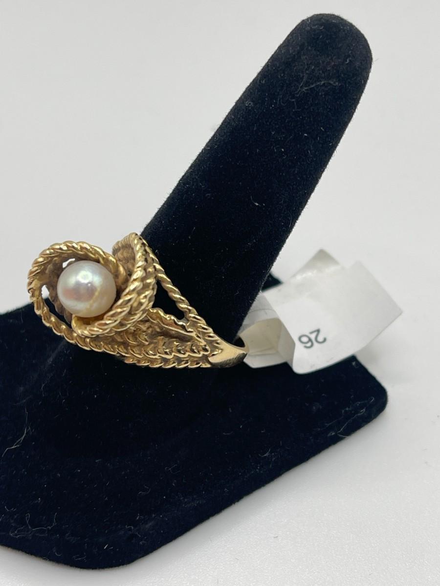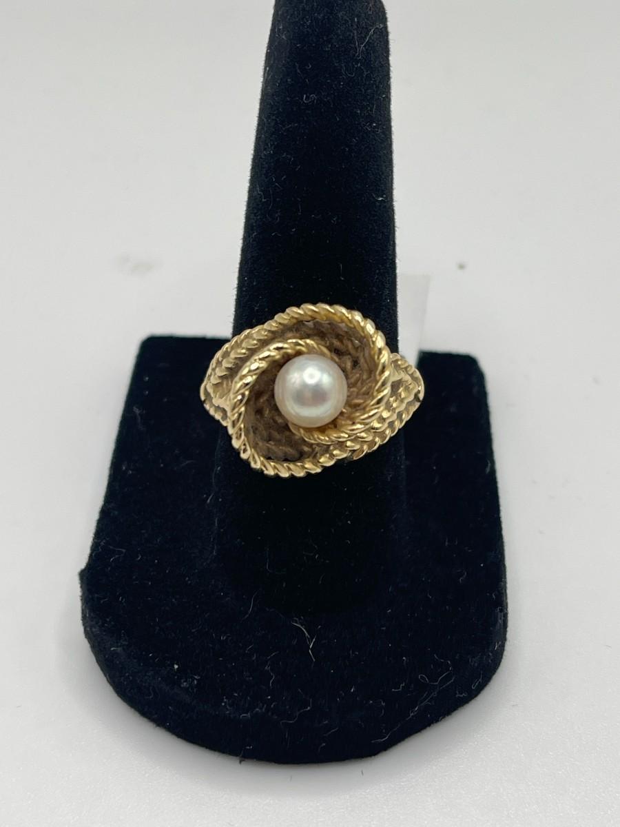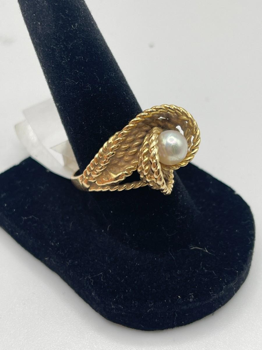 Round pearl ring with 14K yellow gold twisted rope design. 8.21 total grams. Size 8. Condiiton is fair: bent shank and some wear to the sides.