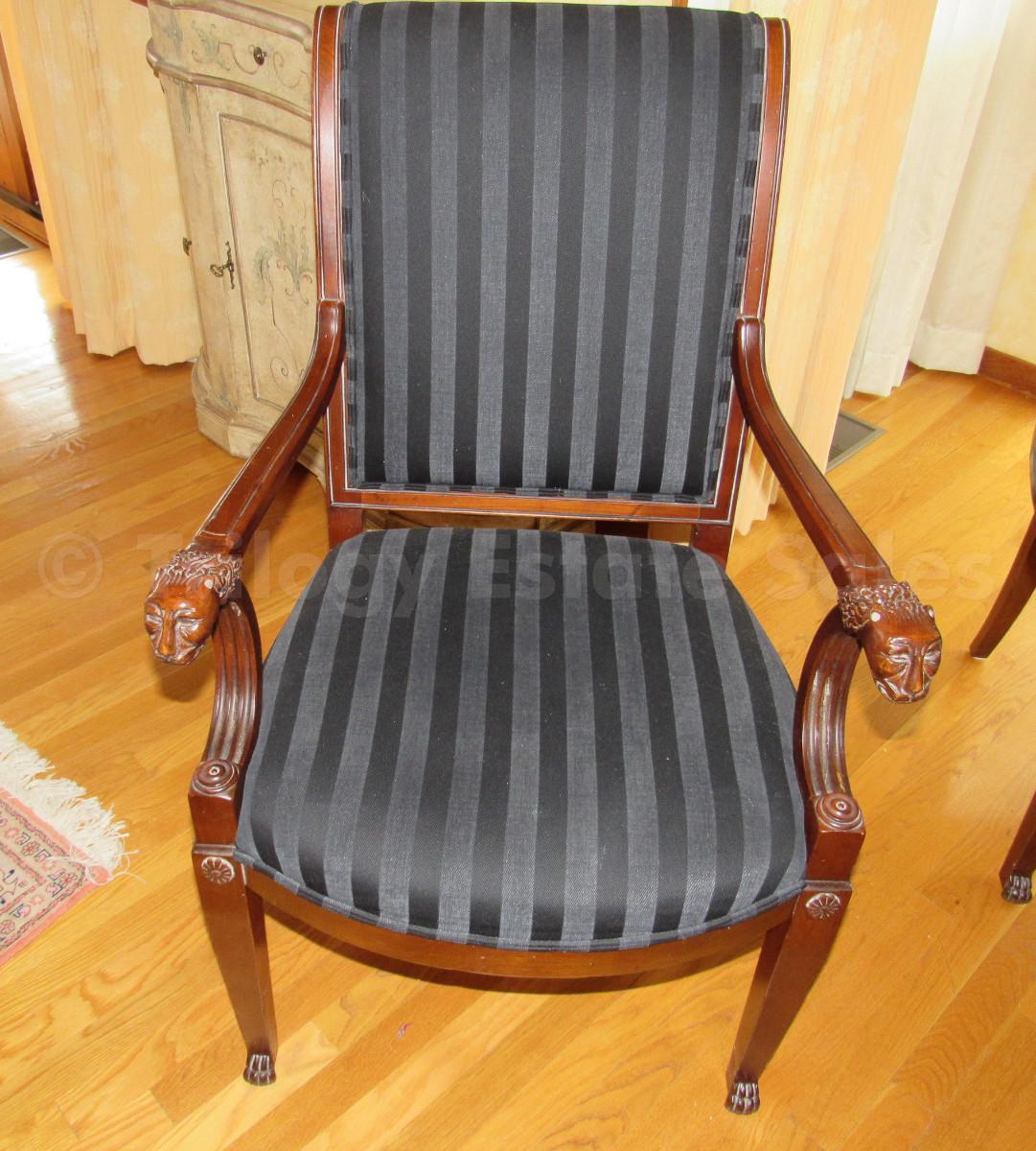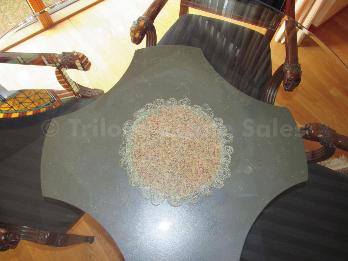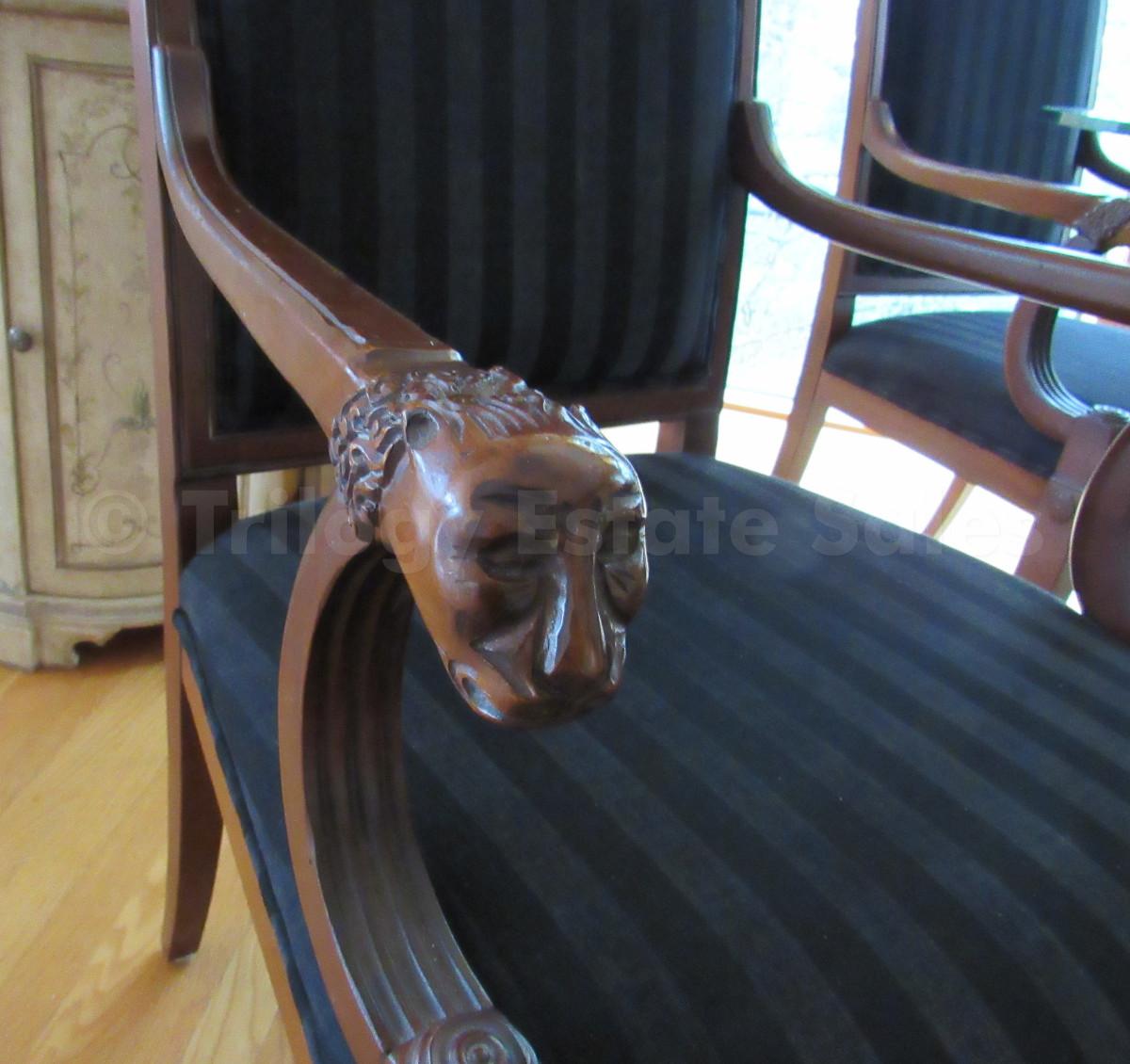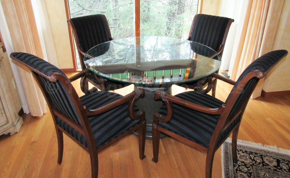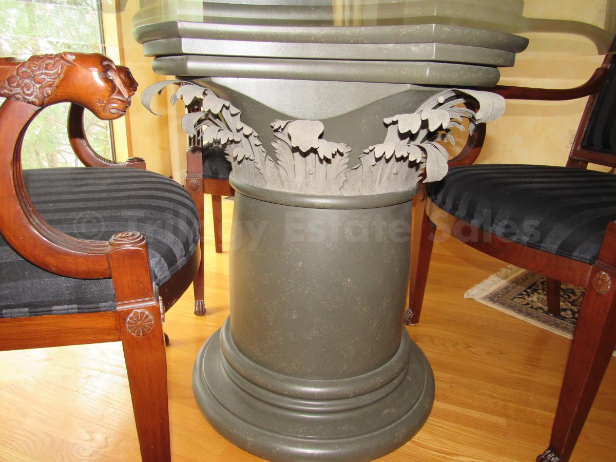 Pedestal round glass dining table 48” diameter, Includes four tone-on-tone upholstered chairs. Chairs have ball and claw feet and feature lion heads on the arms.