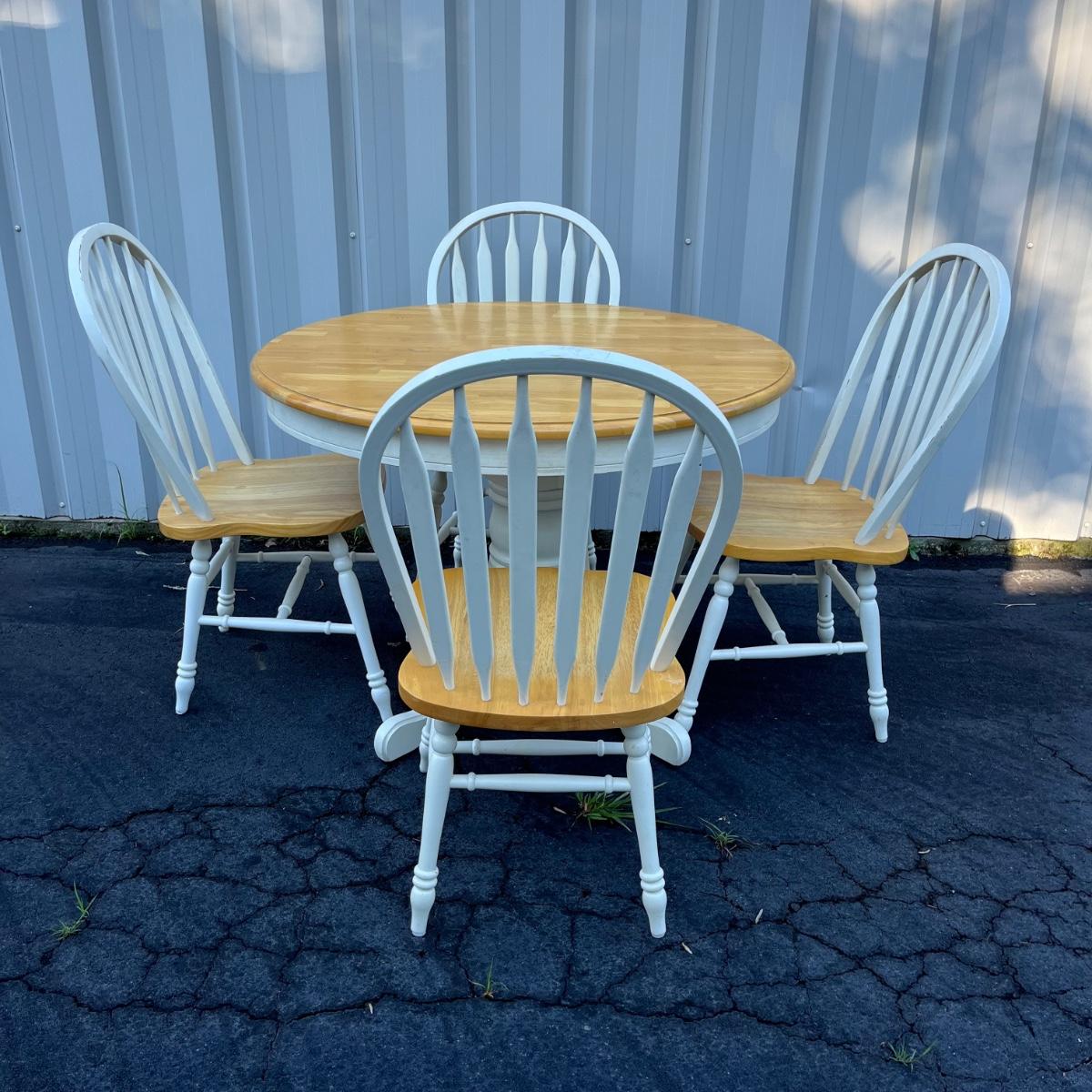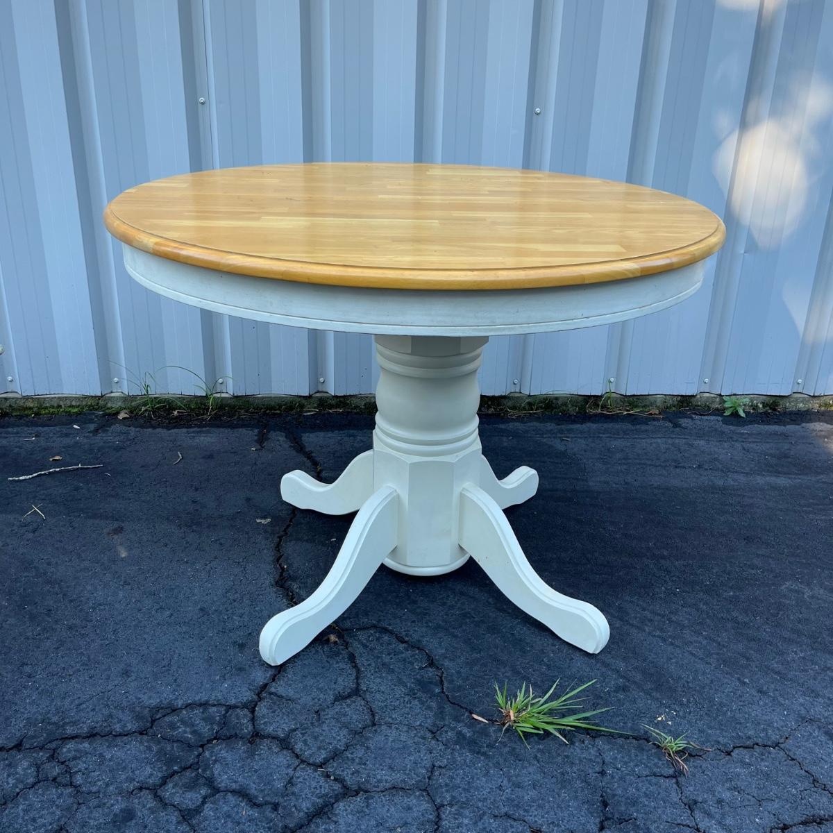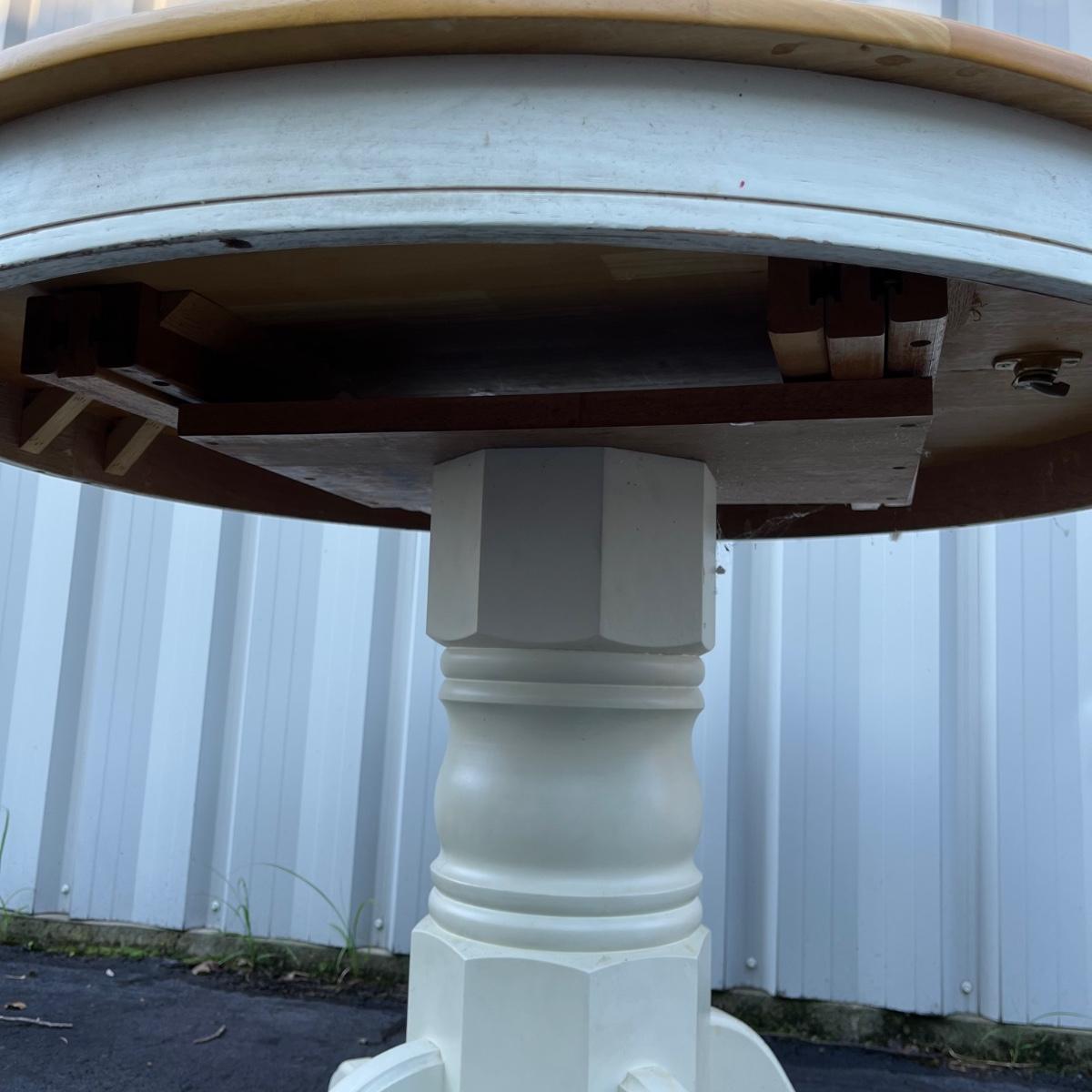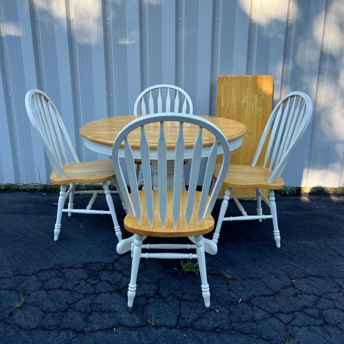 Lot includes a round wooden white and honey colored pedestal table with matching leaf and four chairs. Table measures 42”D x 29.5” tall with a 18” leaf and chairs measure 18” x 18” x 38” with a 18” seat height.