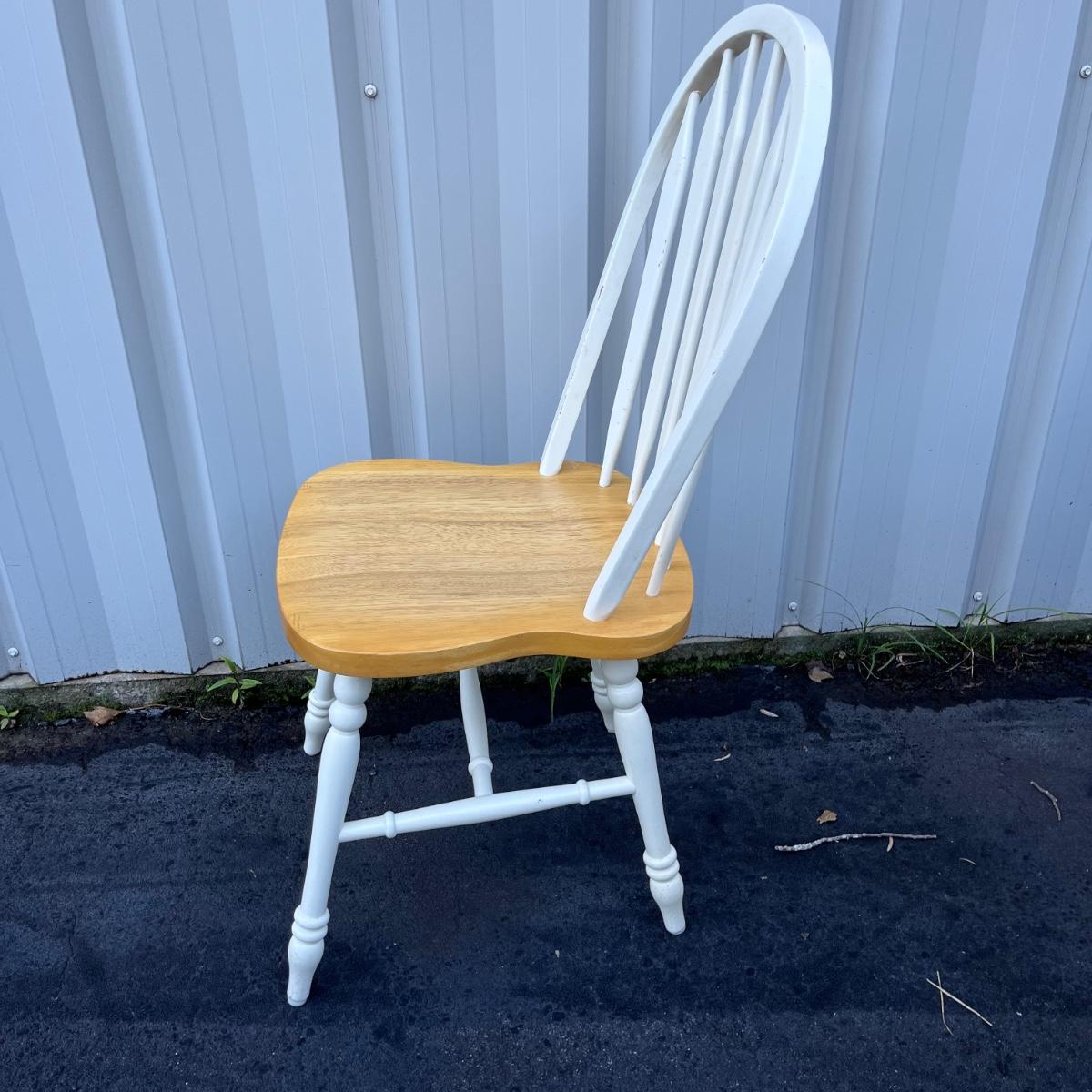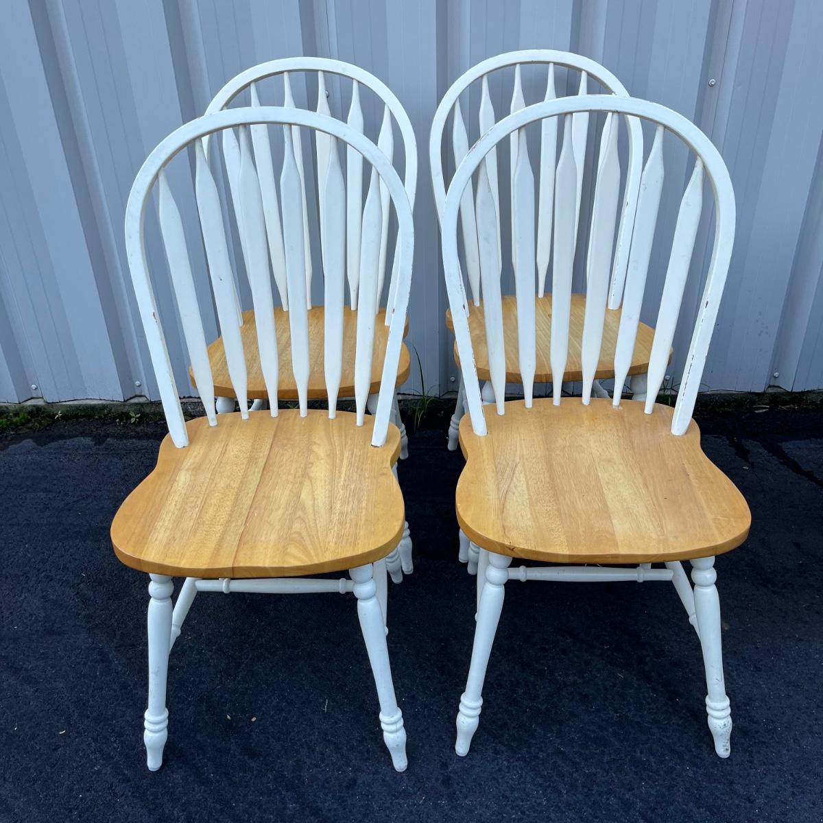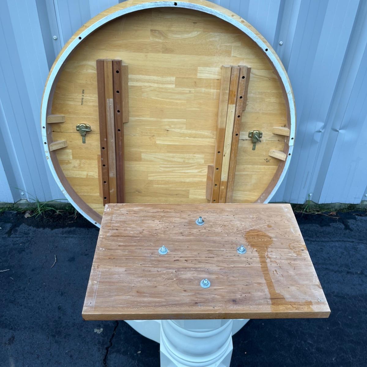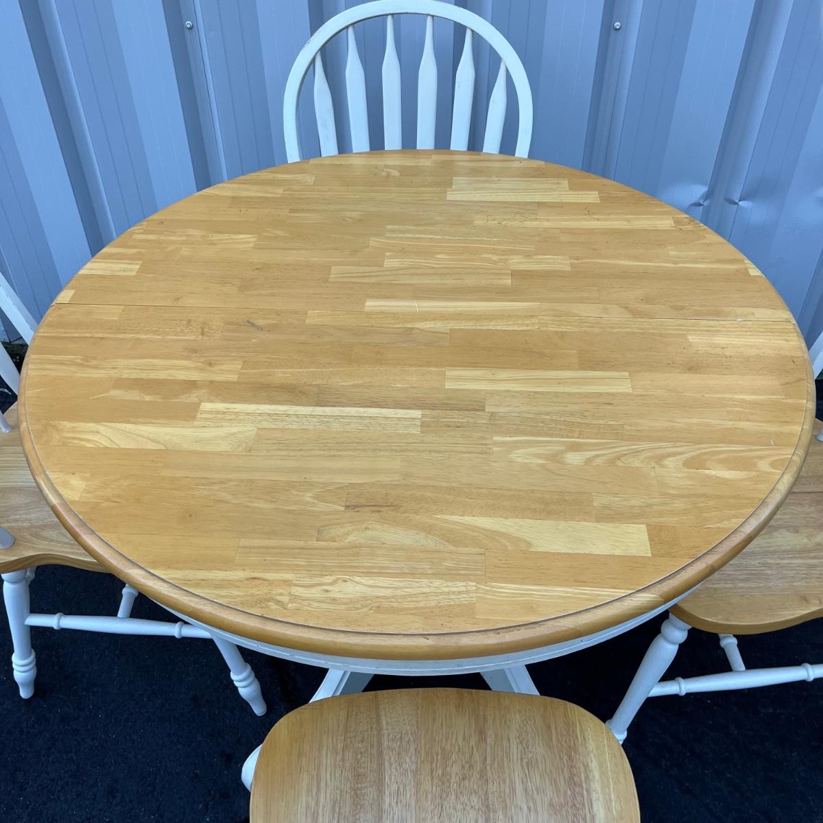 Lot includes a round wooden white and honey colored pedestal table with matching leaf and four chairs. Table measures 42”D x 29.5” tall with a 18” leaf and chairs measure 18” x 18” x 38” with a 18” seat height.