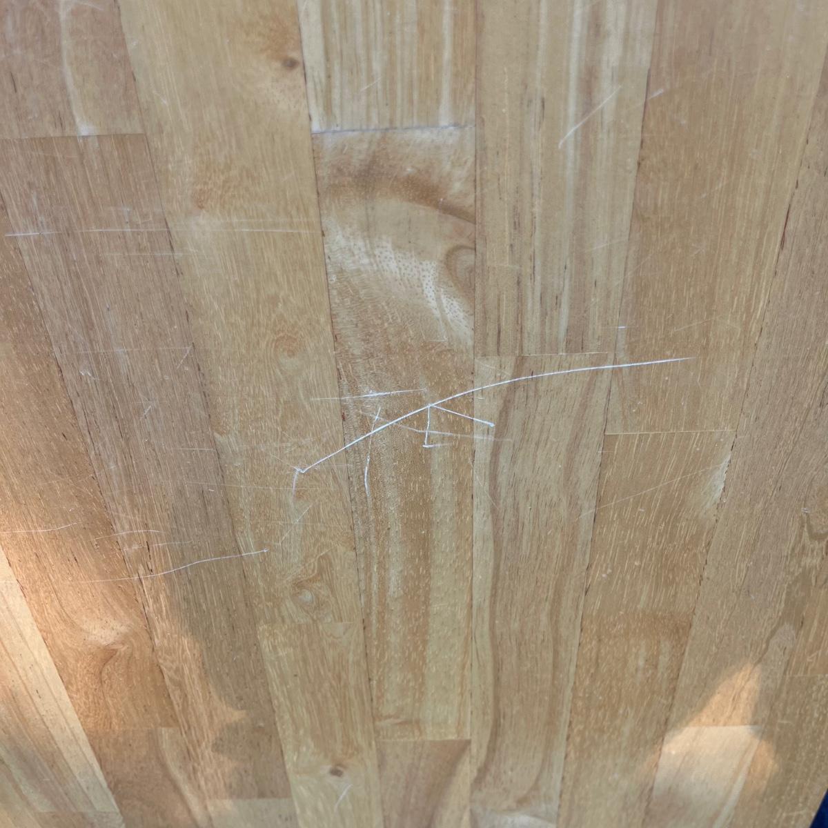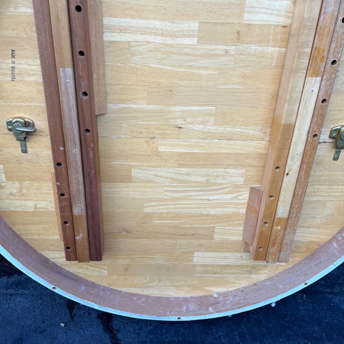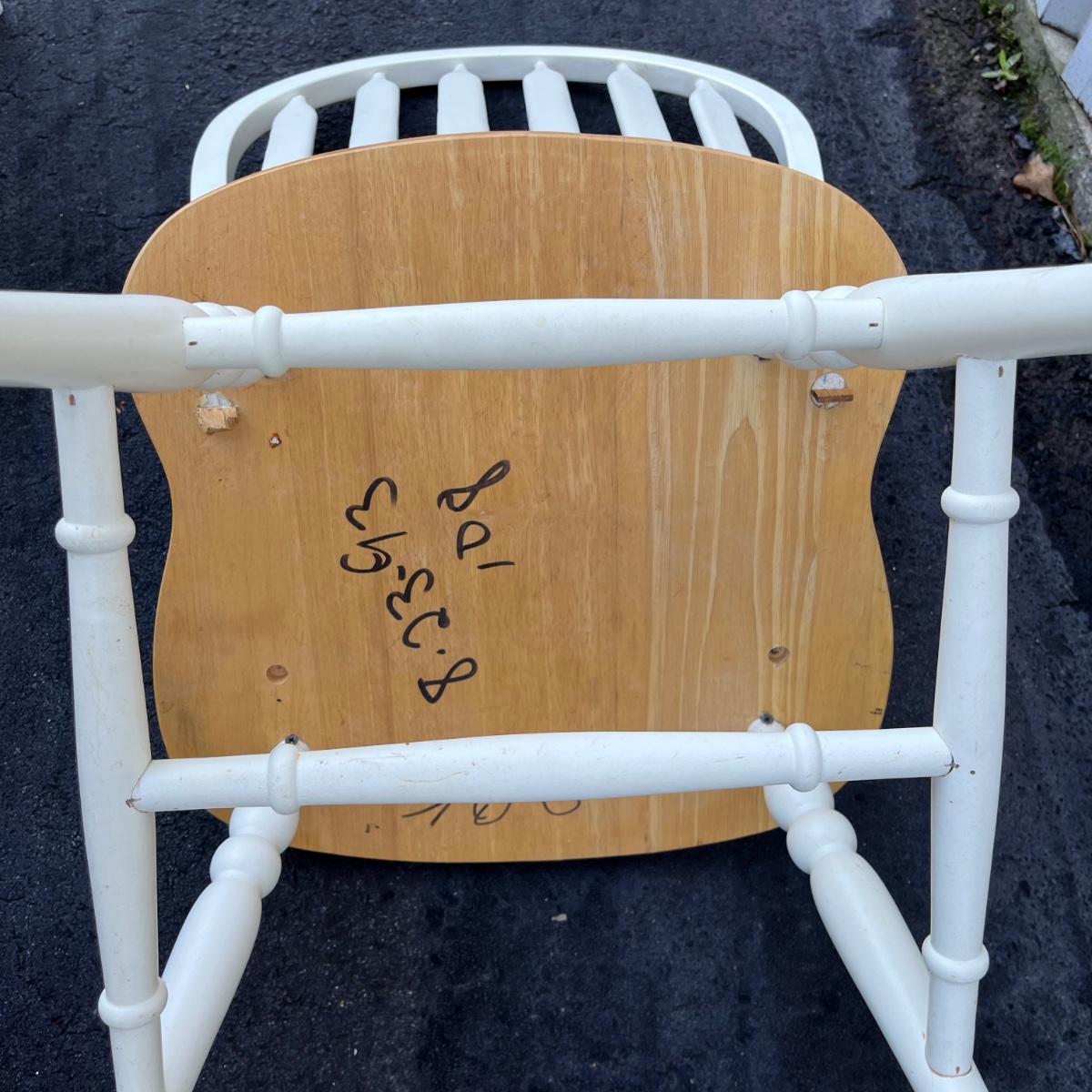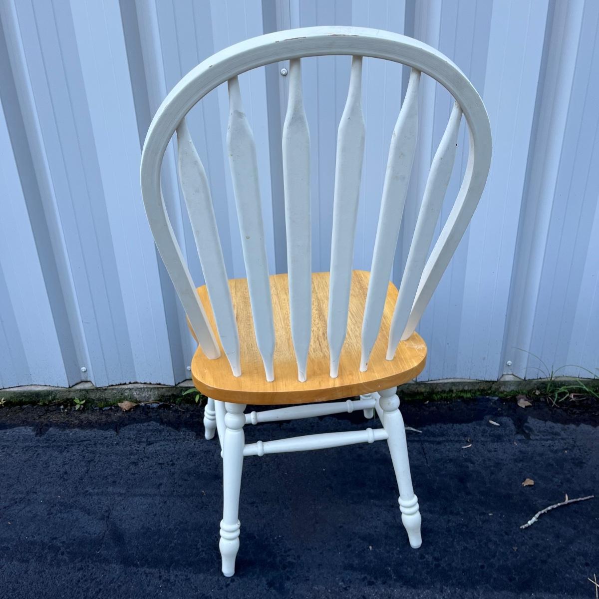 Lot includes a round wooden white and honey colored pedestal table with matching leaf and four chairs. Table measures 42”D x 29.5” tall with a 18” leaf and chairs measure 18” x 18” x 38” with a 18” seat height.