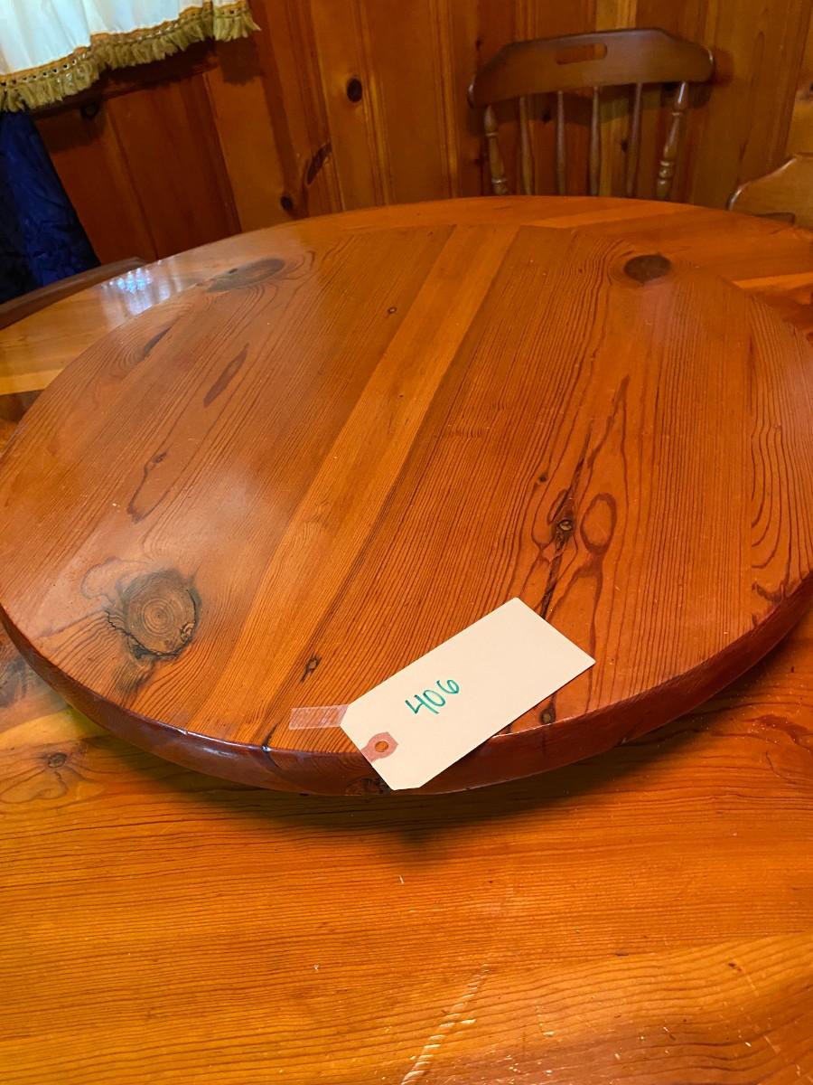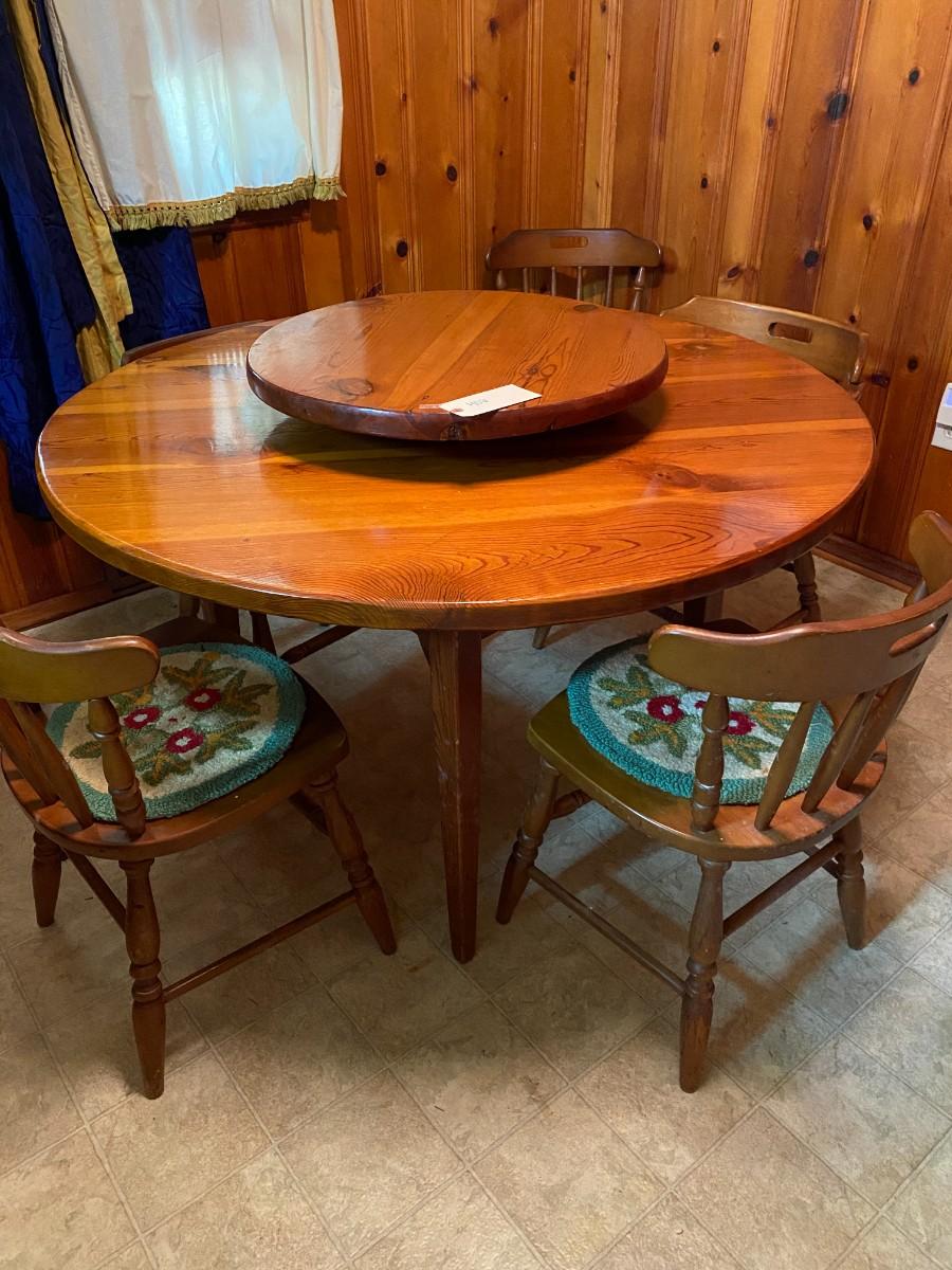 LOT 406 Round Pine Farm Table w/ 5 Maple Captains Chairs Table:47x47x30, Has Detachable Lazy Susan