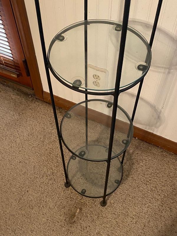 Tall black metal and glass plat stand. 47” tall, 9” wide. Three glass shelves.