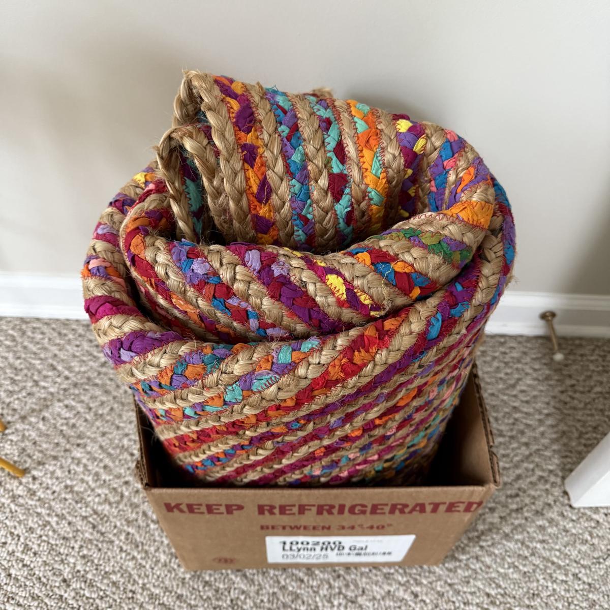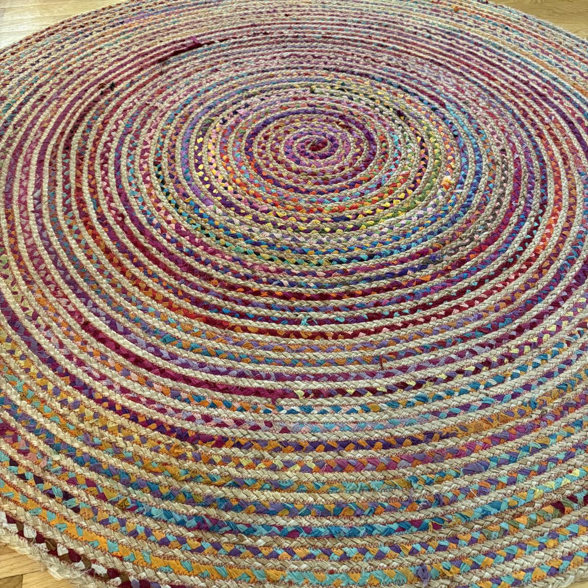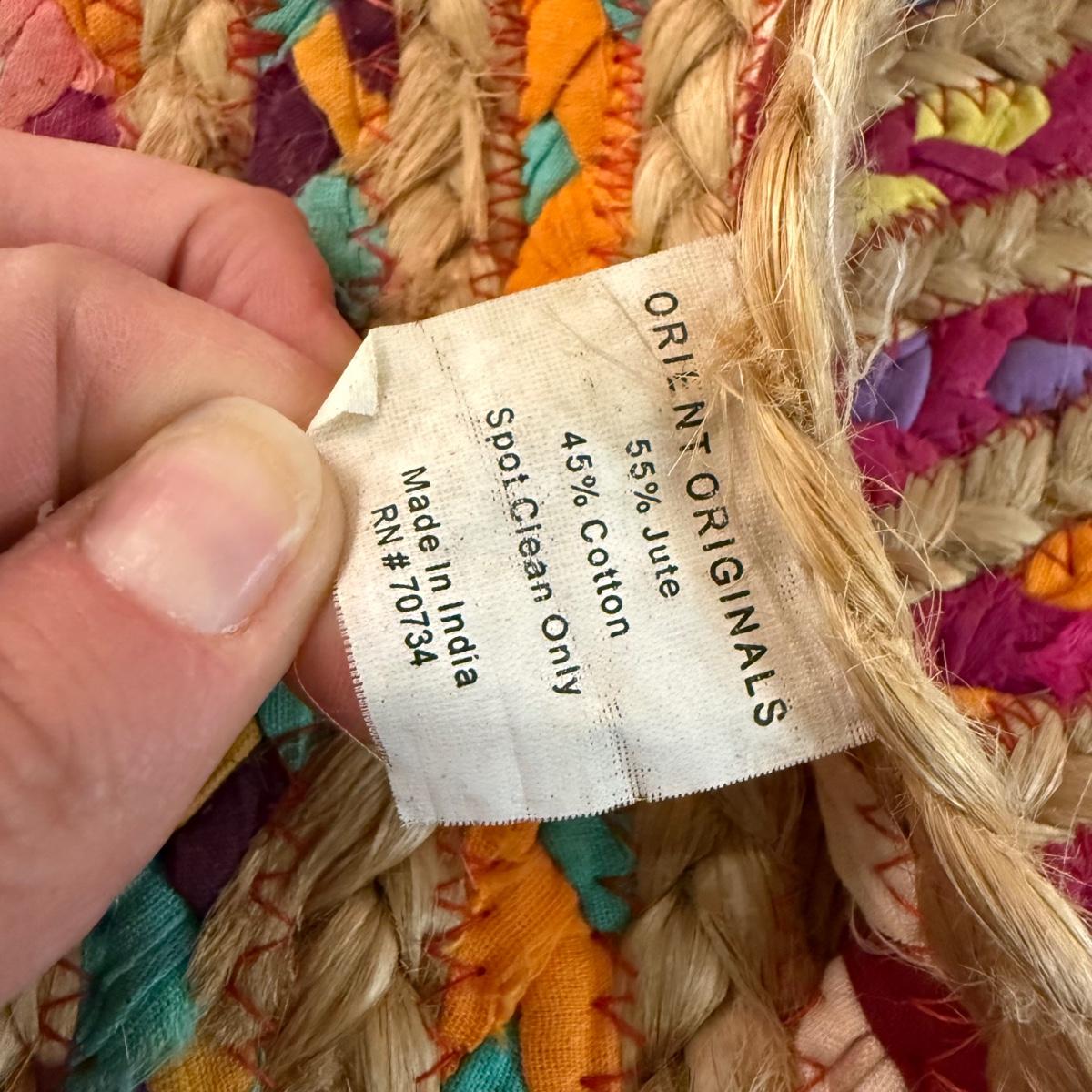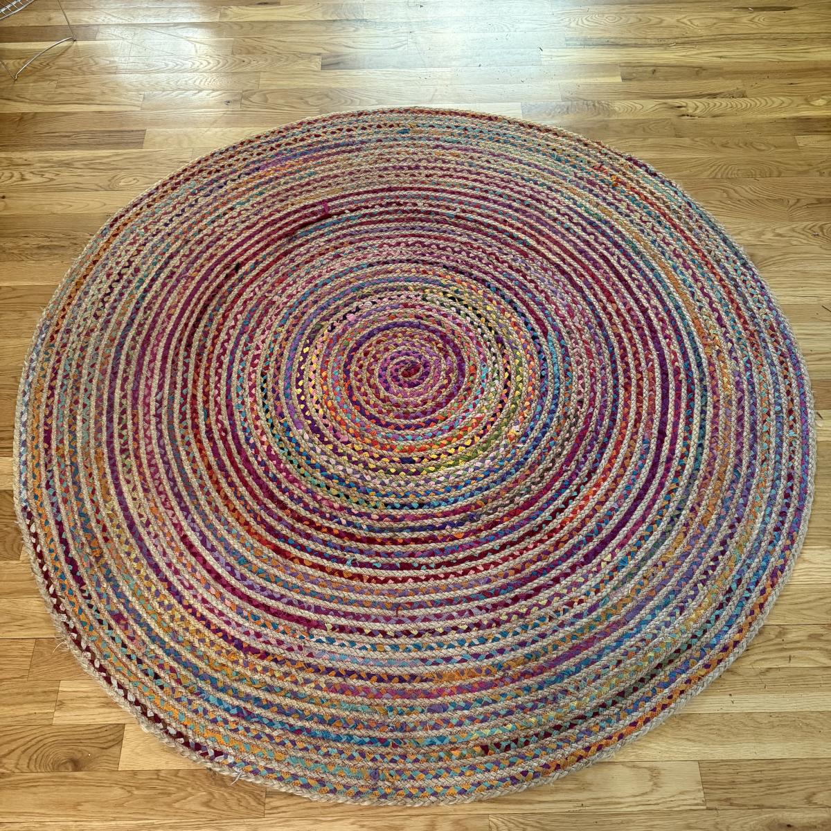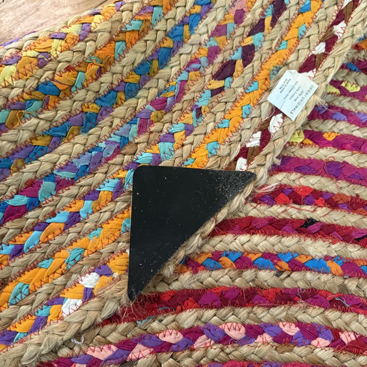 Fun bright rainbow colored “rag” rug, made of jute and cotton. Rug measures 73.5”D, just slightly over 6’. There is one area where one coil has detached; it is reparable. There was some Velcro and sticky rug grippers on the bottom side; some are still attached. Tag states the rug is by Orient Originals. This rug can be folded so it can be shipped, see pictures for details.