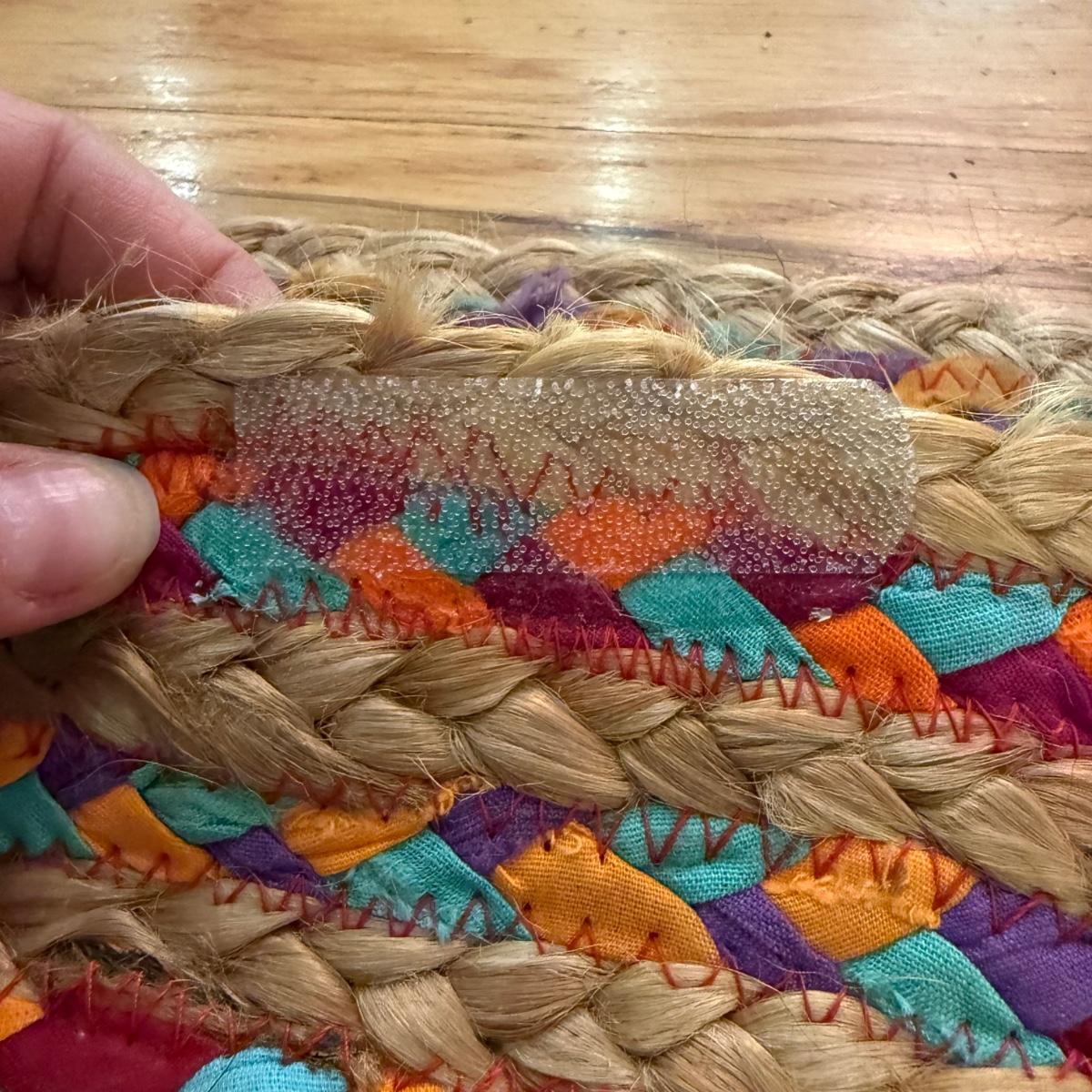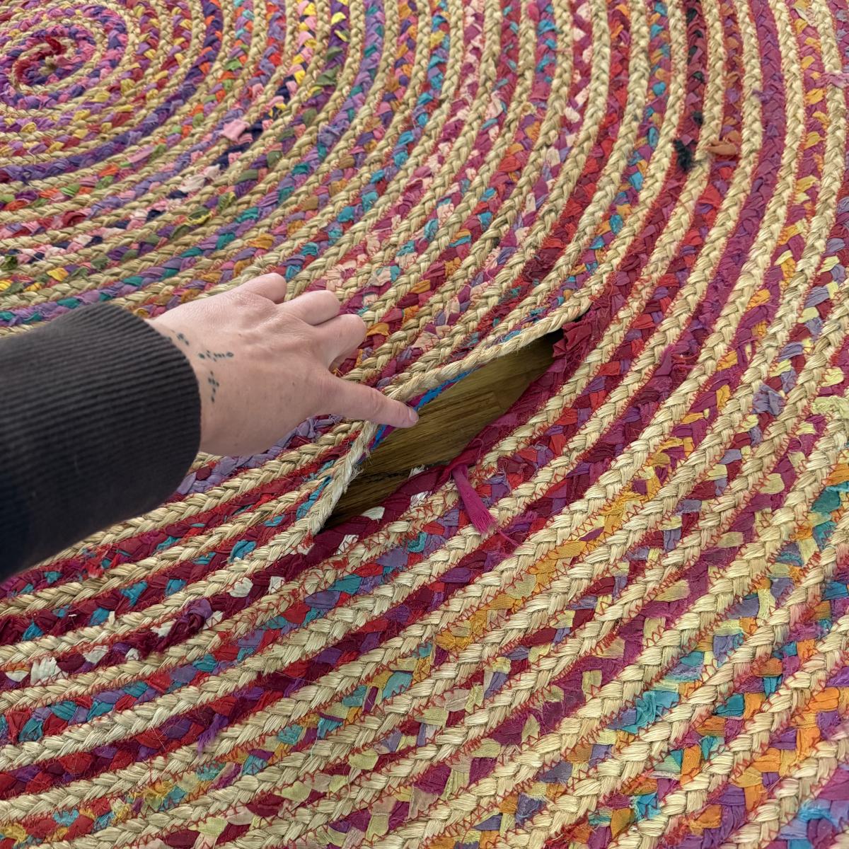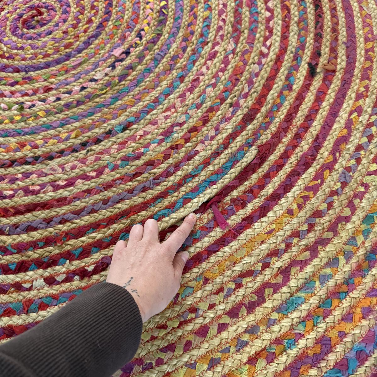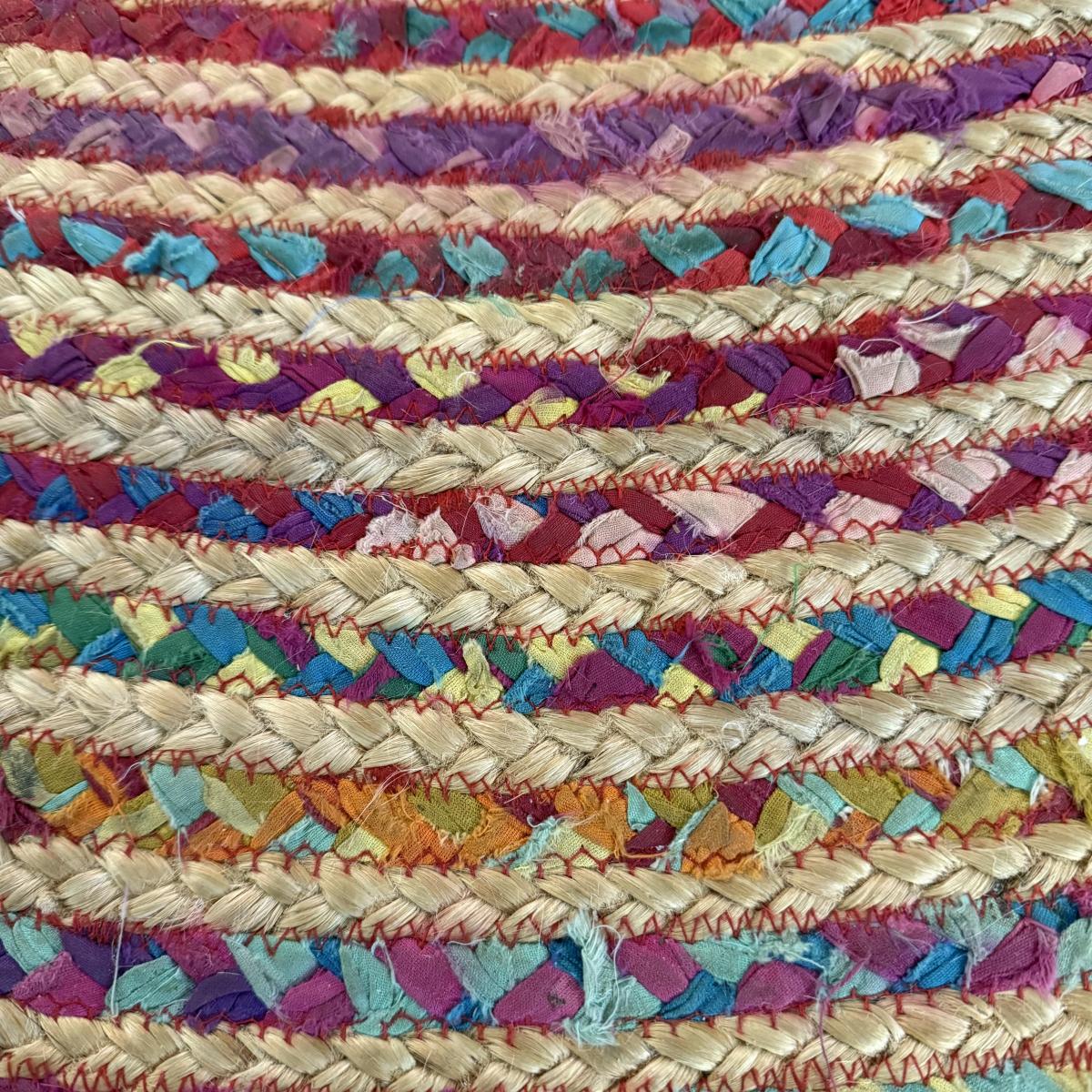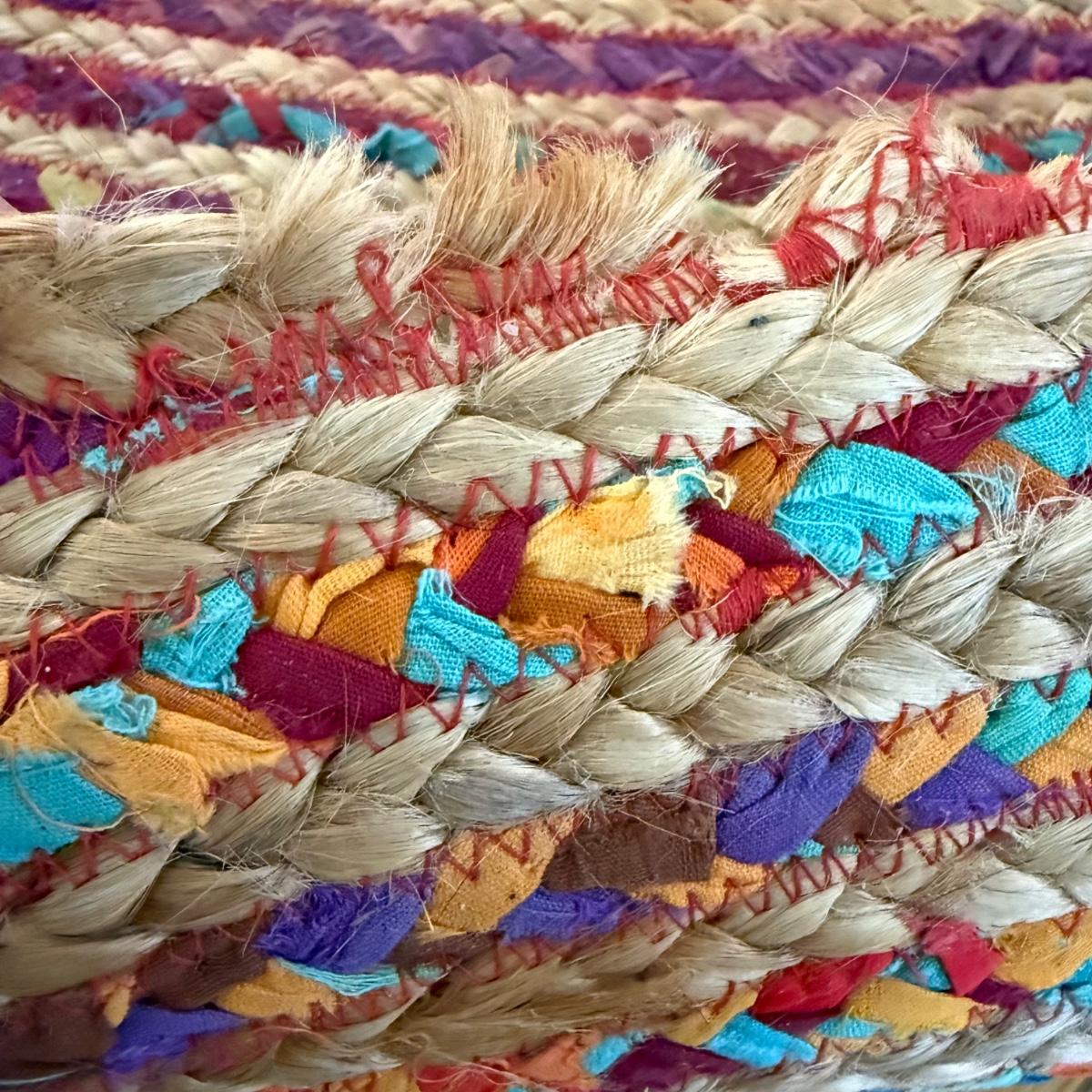 Fun bright rainbow colored “rag” rug, made of jute and cotton. Rug measures 73.5”D, just slightly over 6’. There is one area where one coil has detached; it is reparable. There was some Velcro and sticky rug grippers on the bottom side; some are still attached. Tag states the rug is by Orient Originals. This rug can be folded so it can be shipped, see pictures for details.