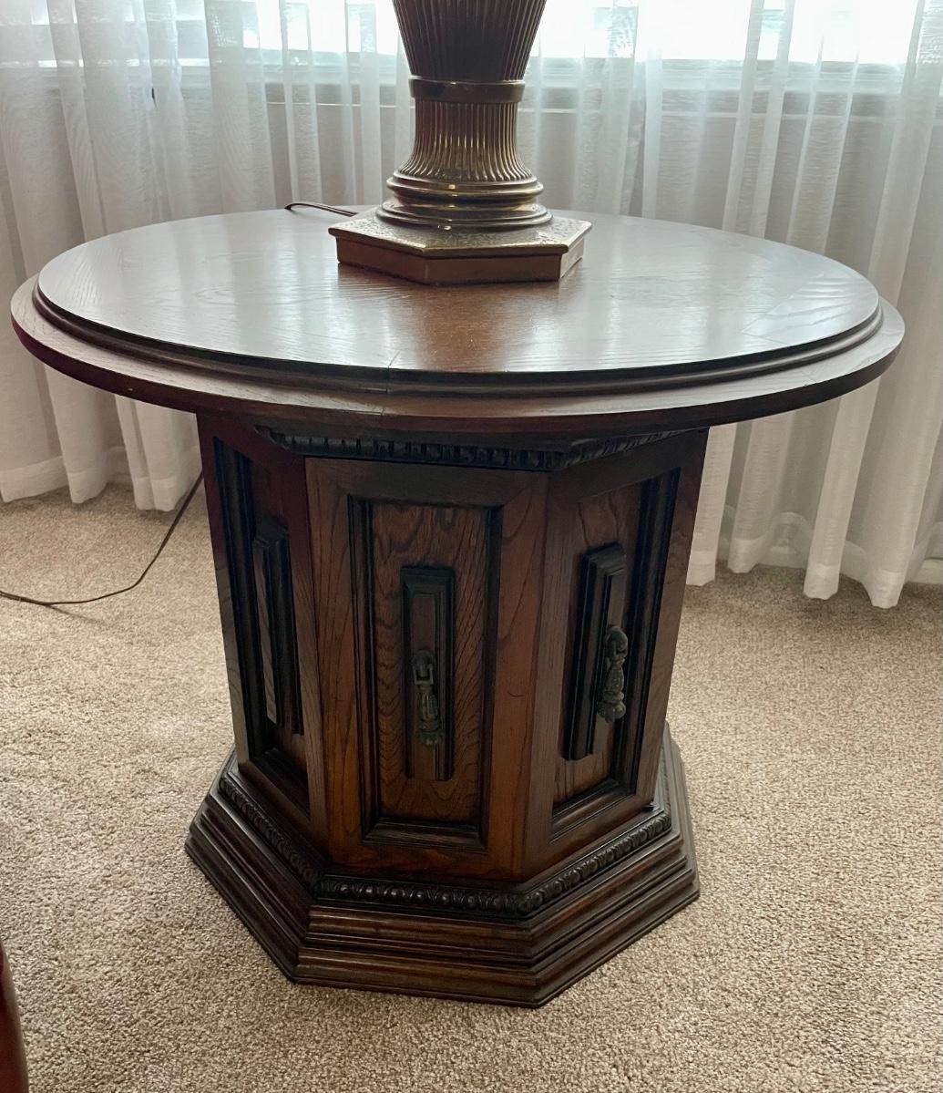 Round Wood End Table. Approx. 22”tall x 24” across the top.