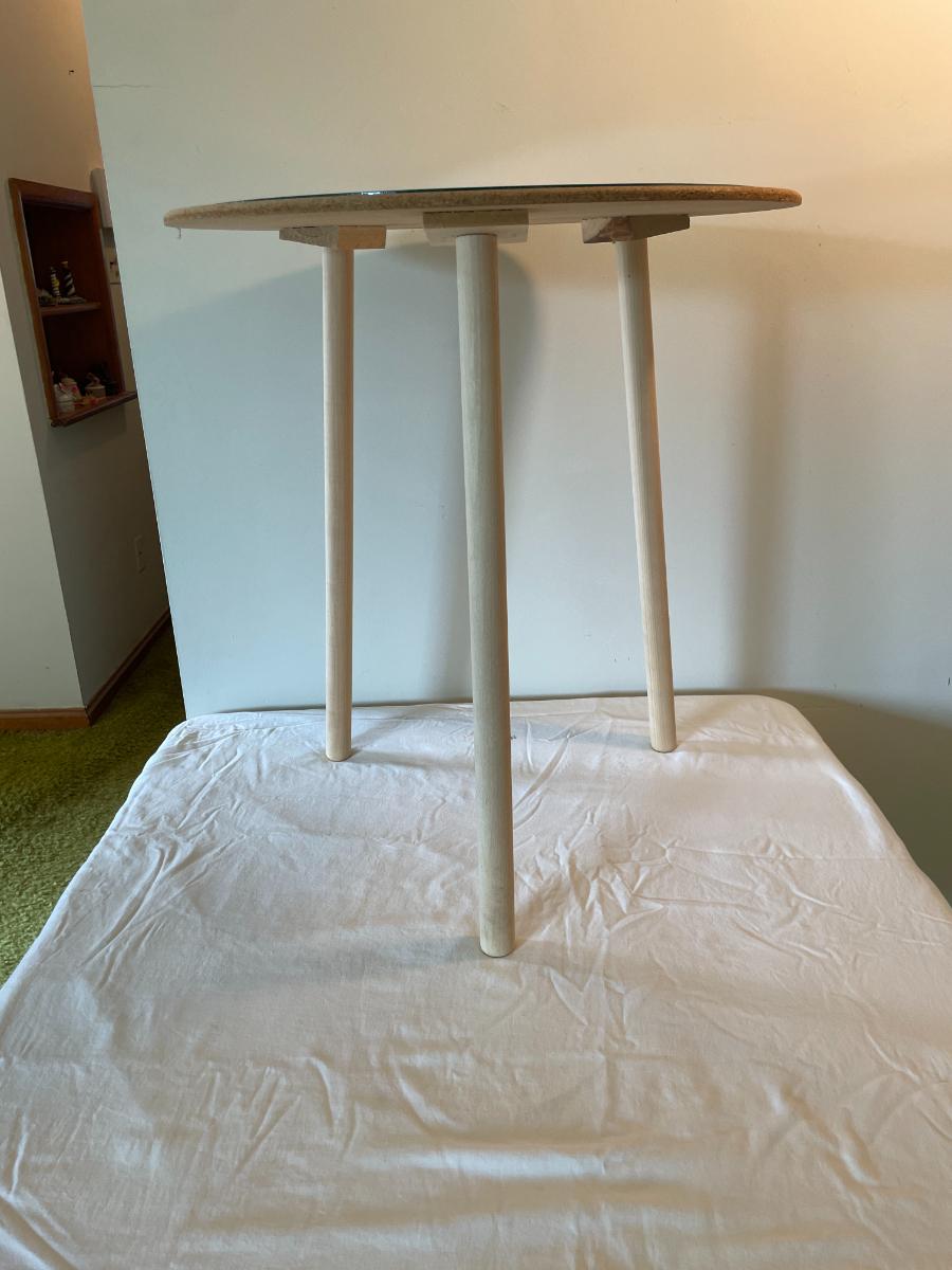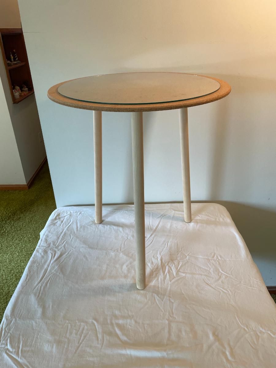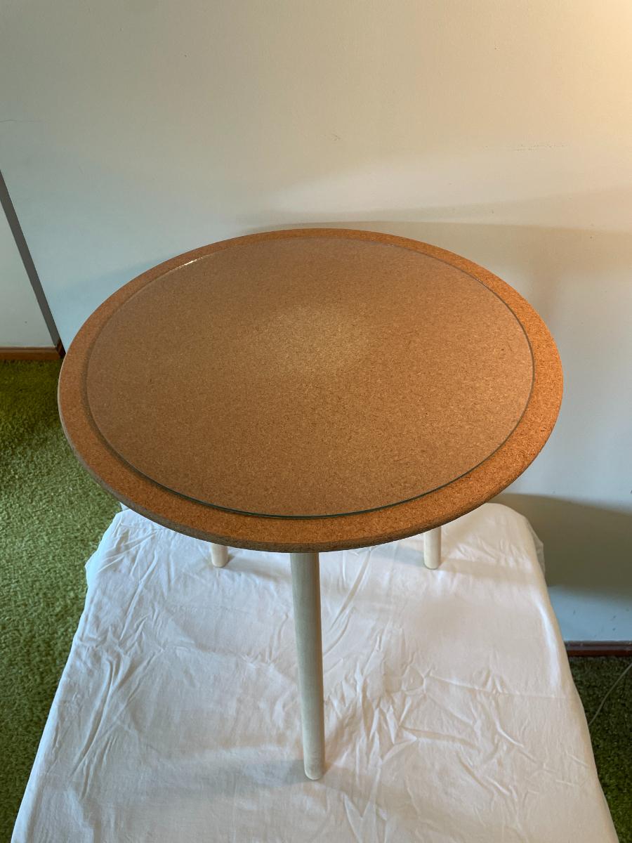 Round side table featuring a natural cork top with a diameter of 21 inches. The table is supported by three white-painted wooden legs, providing a minimalist and functional design. It measures a height of 24.25 inches. The piece is versatile for various spaces and appears to be in good condition.
