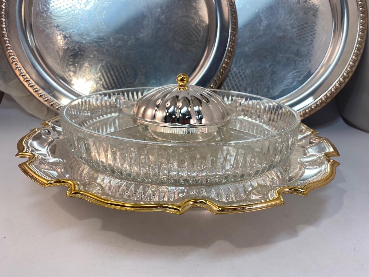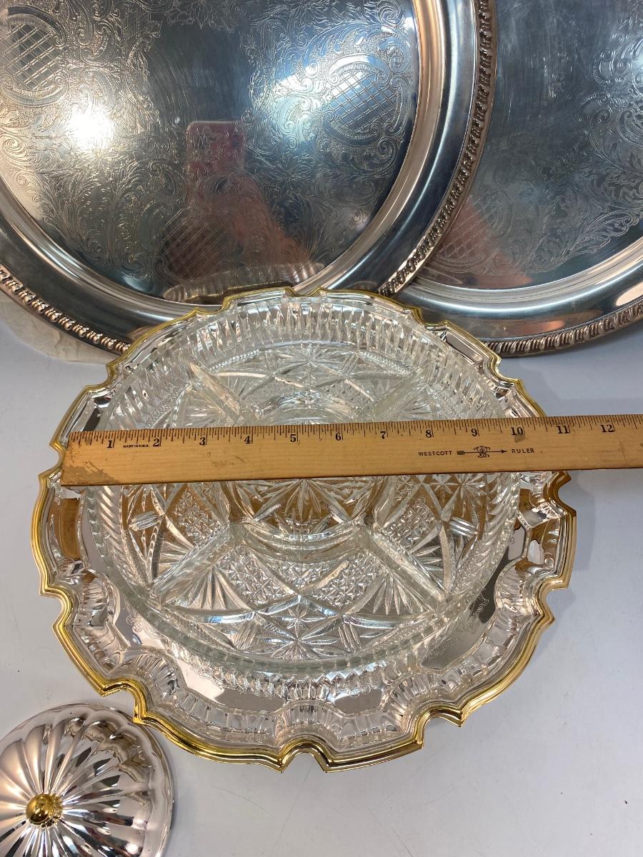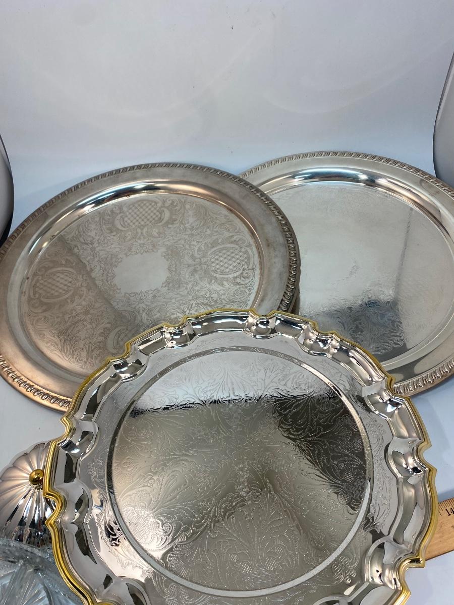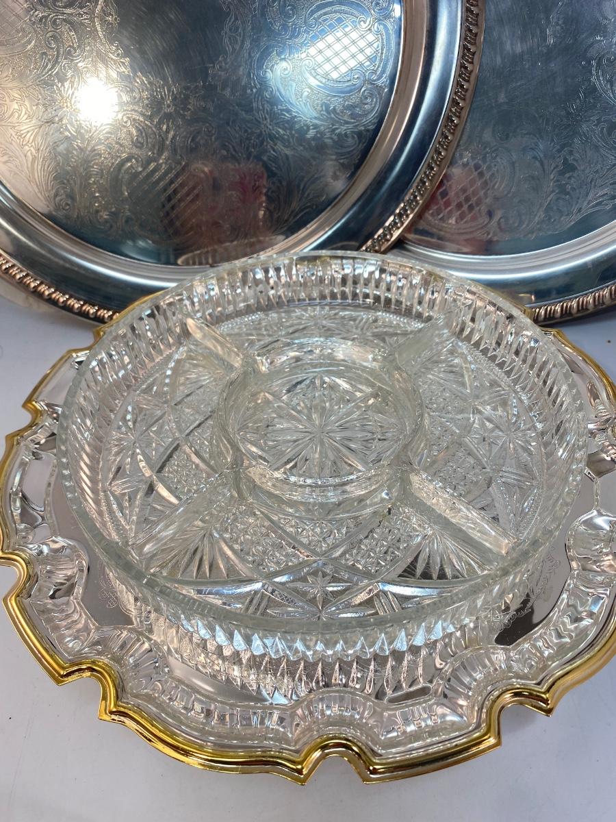 Round Silver Plate Serving Trays and Glass Divided Pedestal Tray