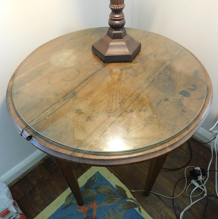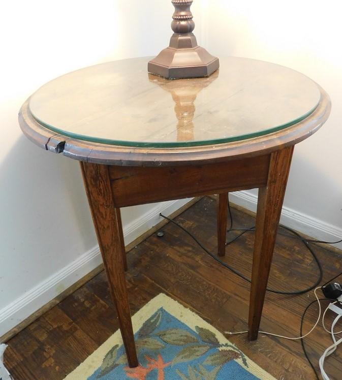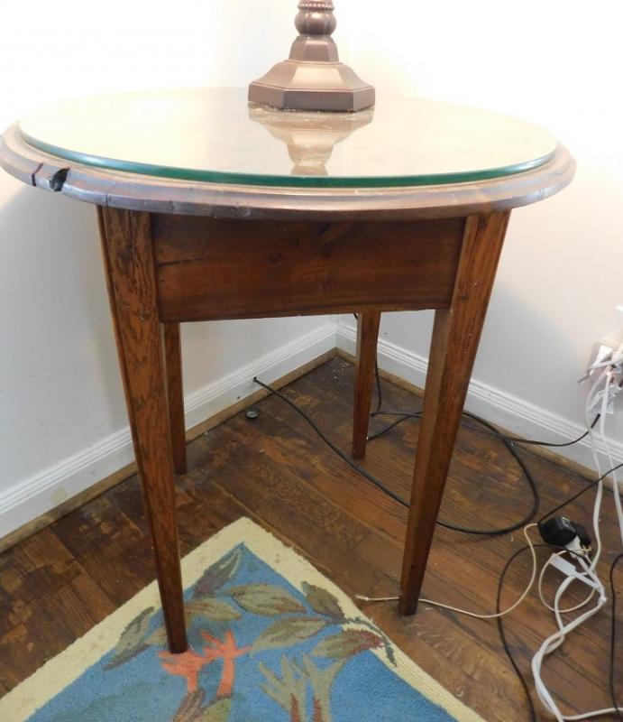 Round Solid Oak Wood Lamp Table with Glass Top has some wear to surface and a dry knot area on edge that provide nice character.