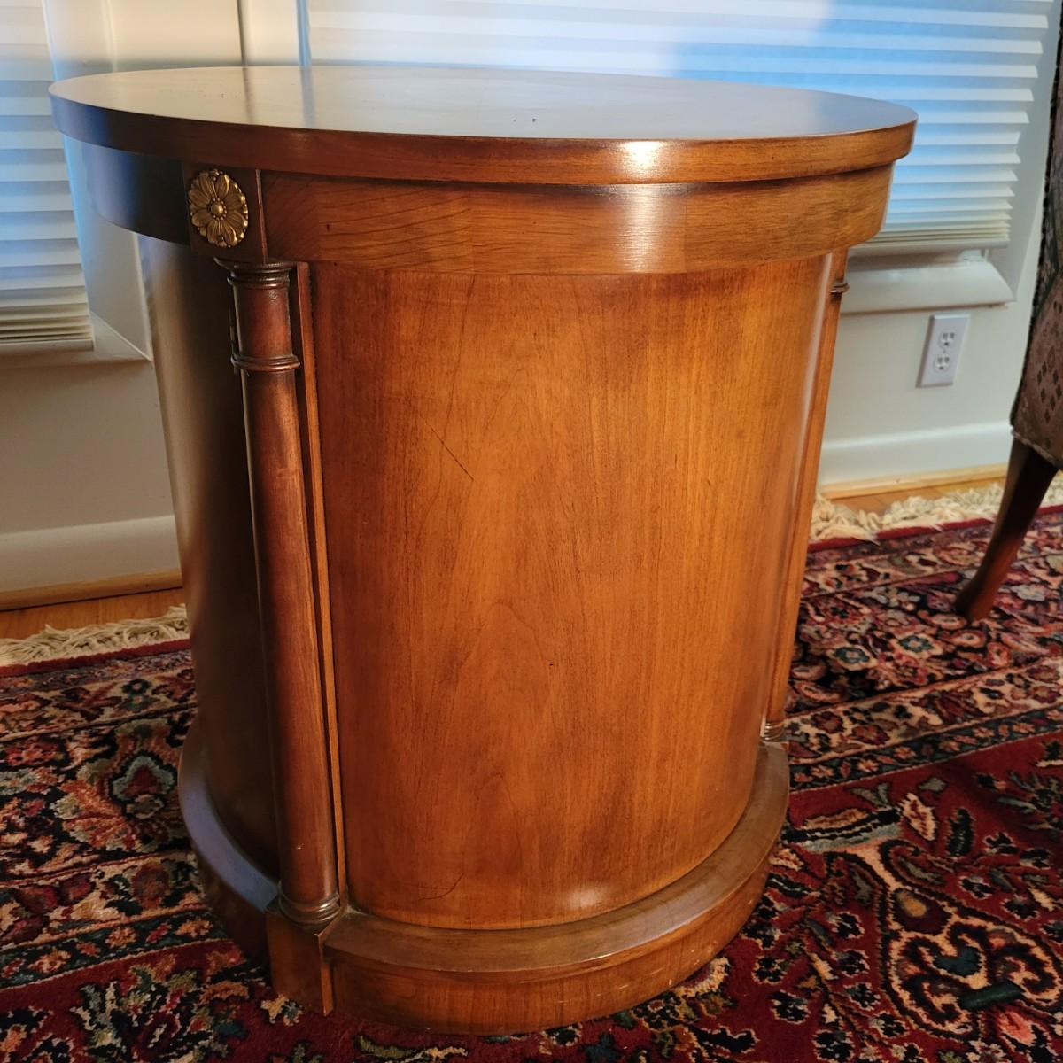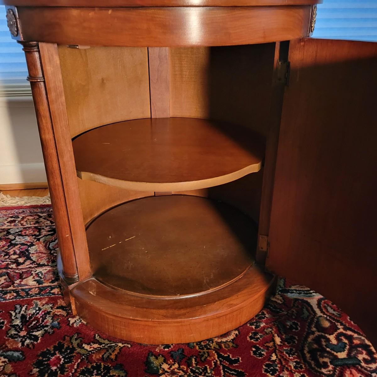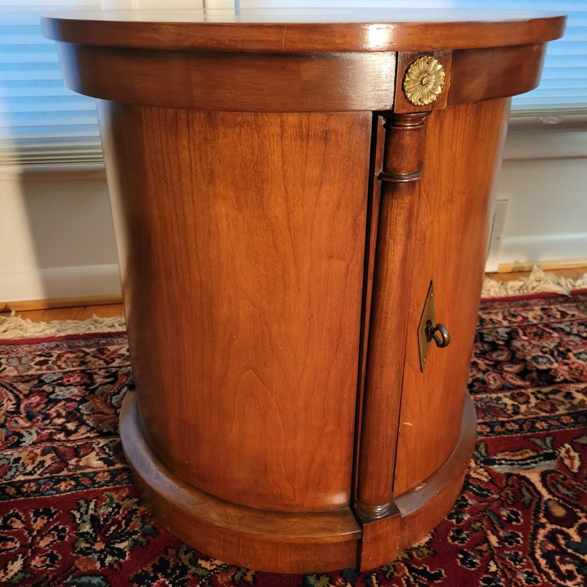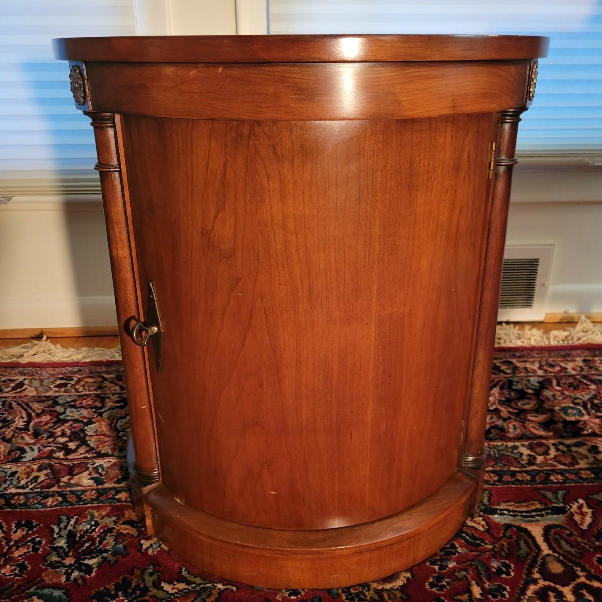 A round solid wood end table in good condition with some minor scratches. This table features one shelf in the cabinet. The door has brass hardware and there are gold colored decorative pieces. Measures approximately 22"d x 24"h. Local pickup only