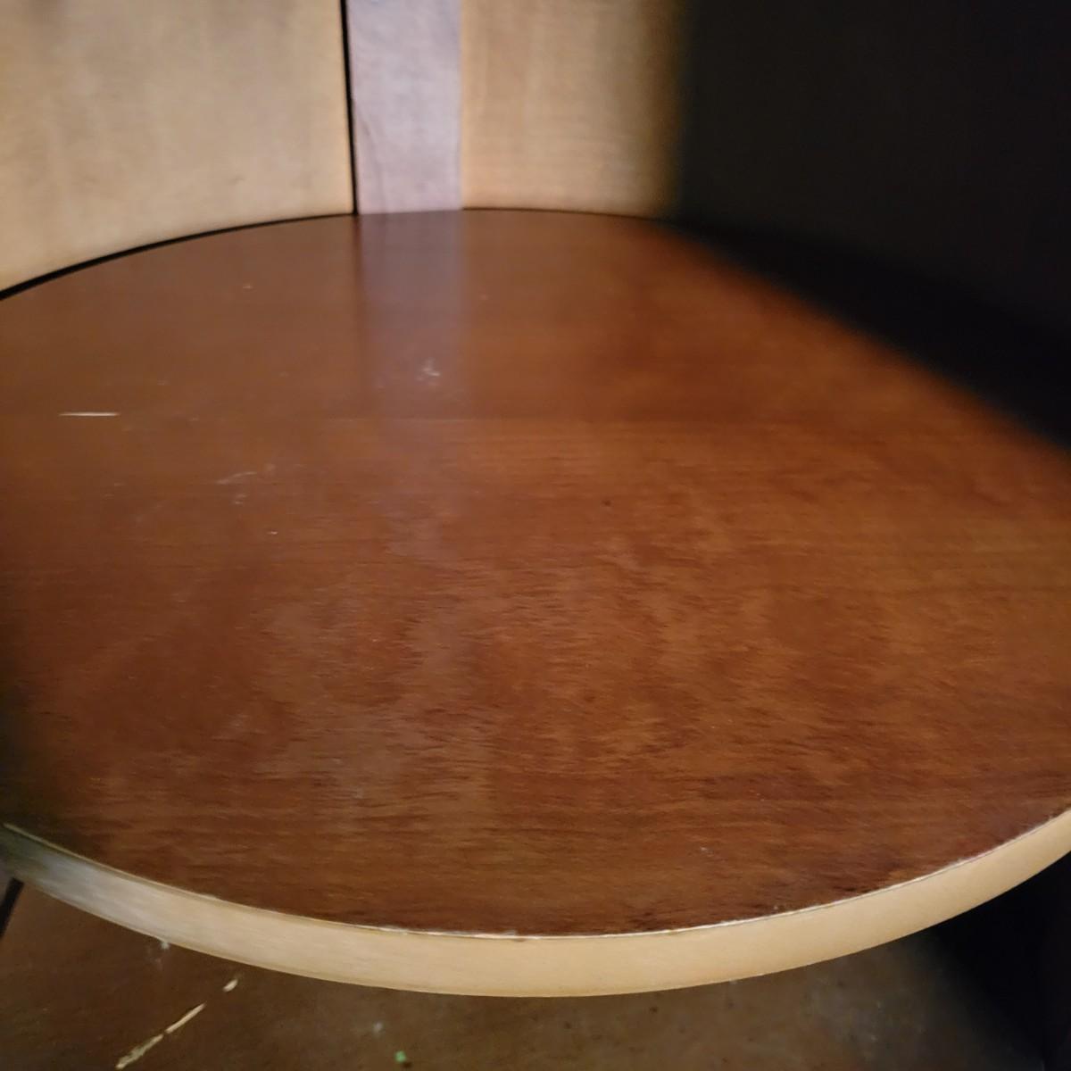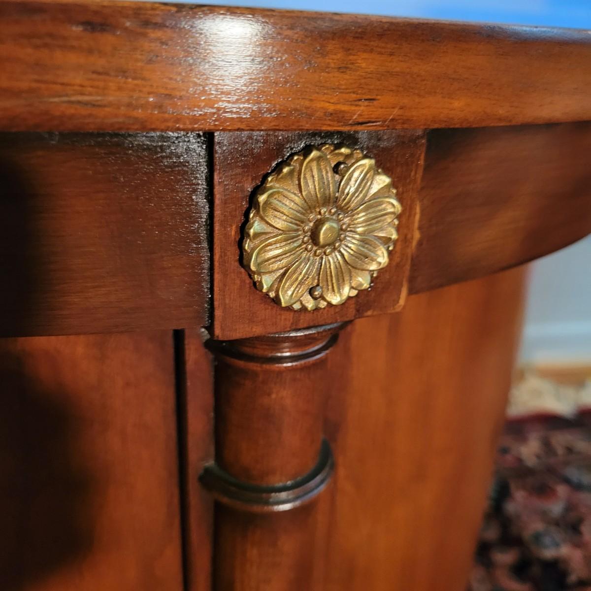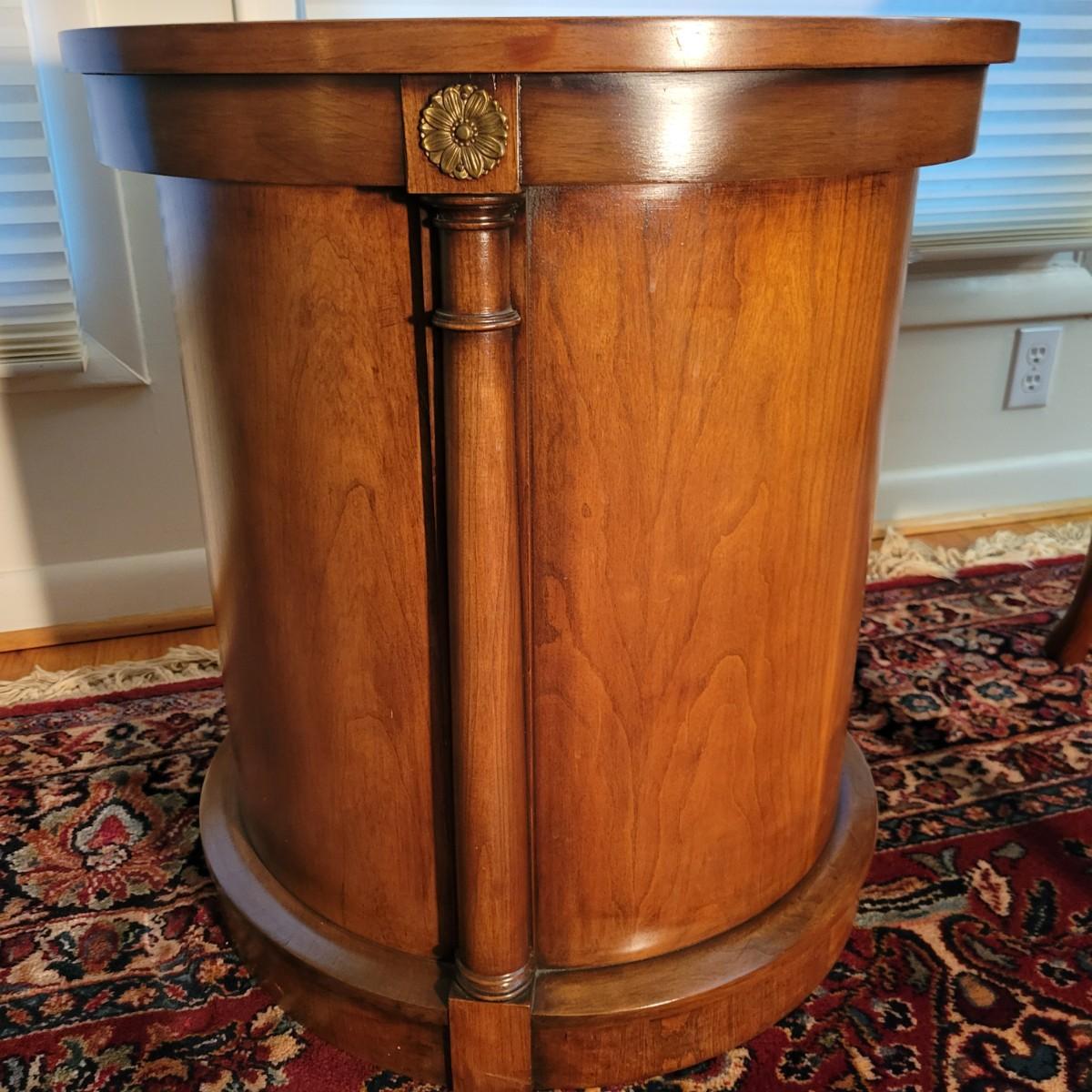 A round solid wood end table in good condition with some minor scratches. This table features one shelf in the cabinet. The door has brass hardware and there are gold colored decorative pieces. Measures approximately 22"d x 24"h. Local pickup only