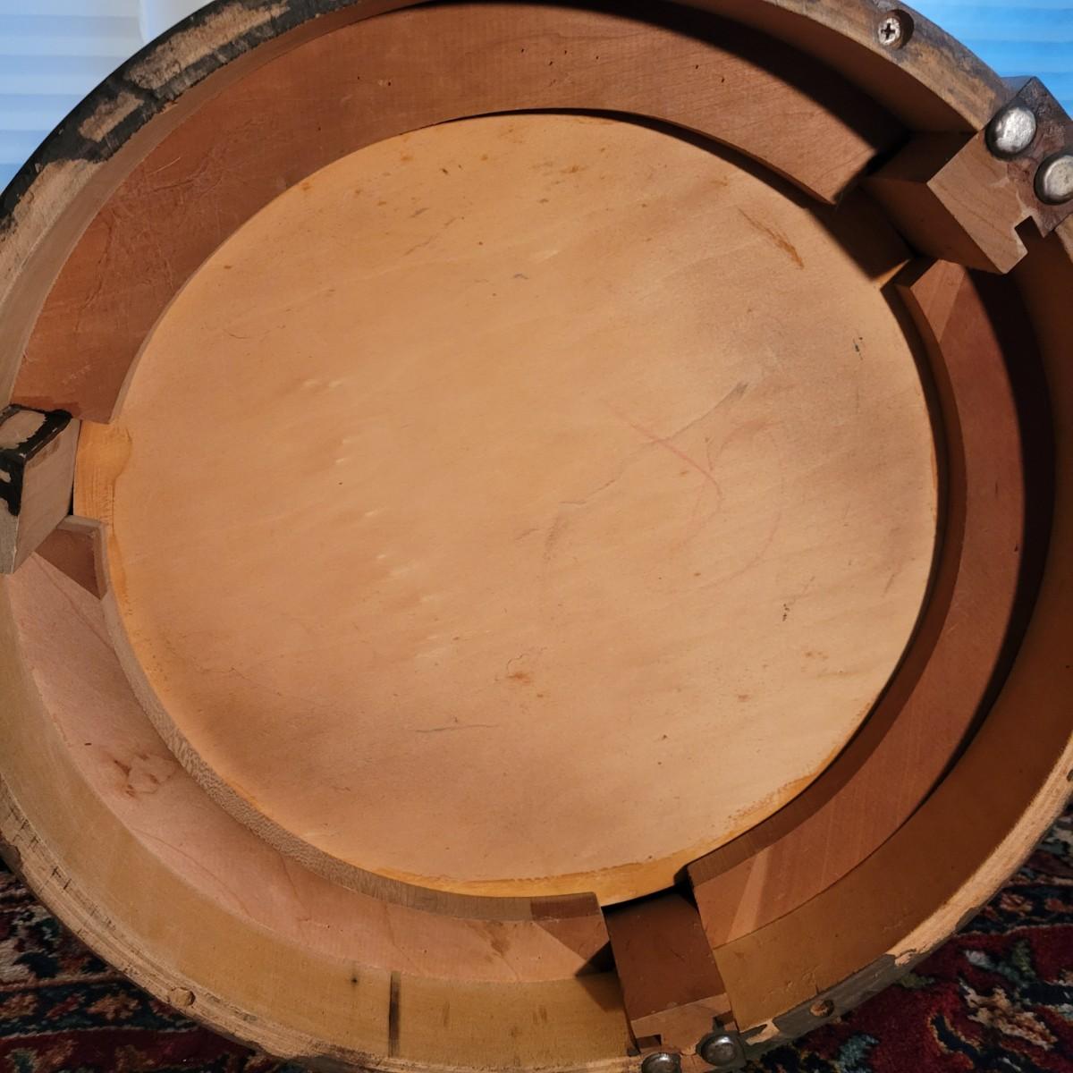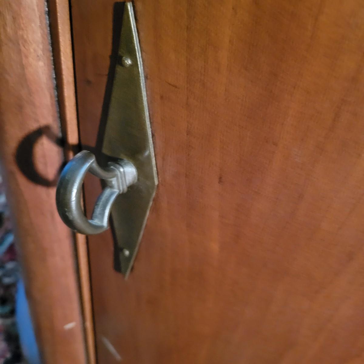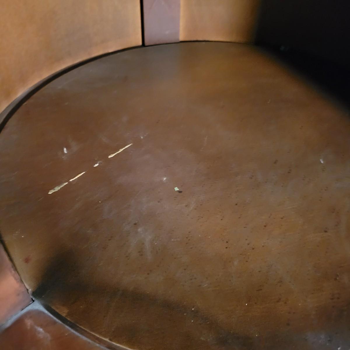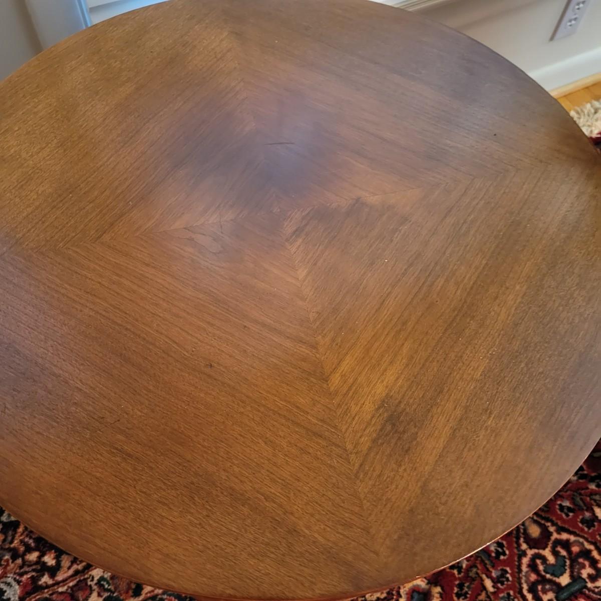 A round solid wood end table in good condition with some minor scratches. This table features one shelf in the cabinet. The door has brass hardware and there are gold colored decorative pieces. Measures approximately 22"d x 24"h. Local pickup only