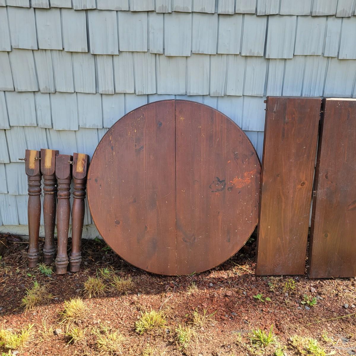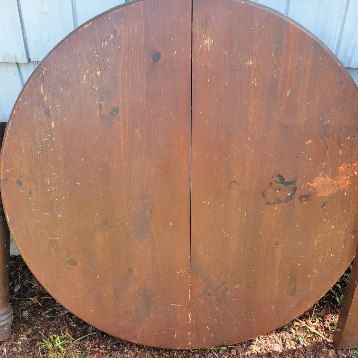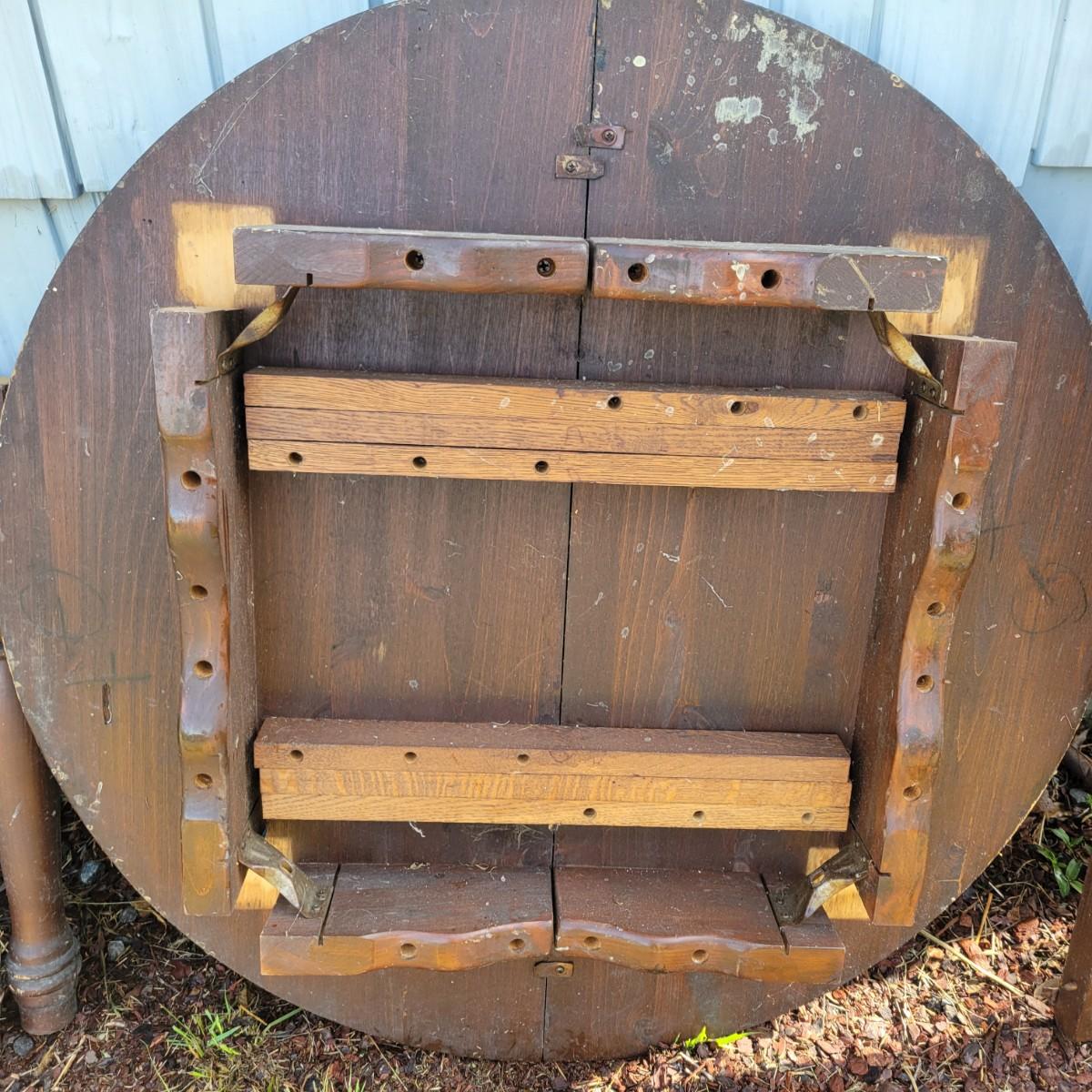 Round wood table with a dark brown finish and 2 leafs. Leafs will add 11.5" each to the width of the 42" table. Approximately 30" tall.
