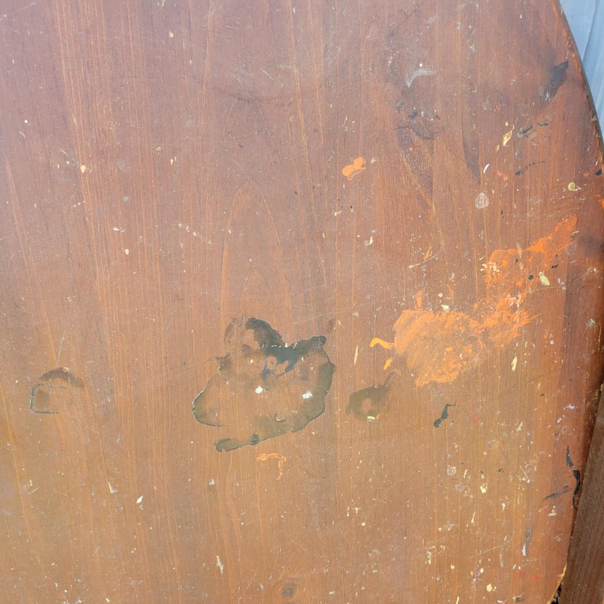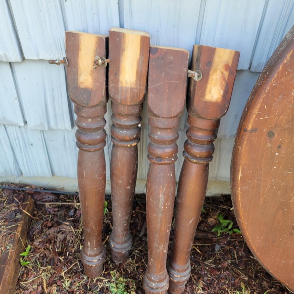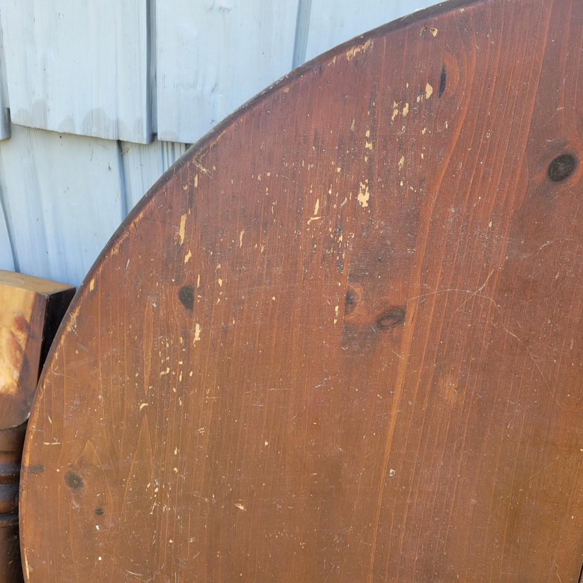 Round wood table with a dark brown finish and 2 leafs. Leafs will add 11.5" each to the width of the 42" table. Approximately 30" tall.