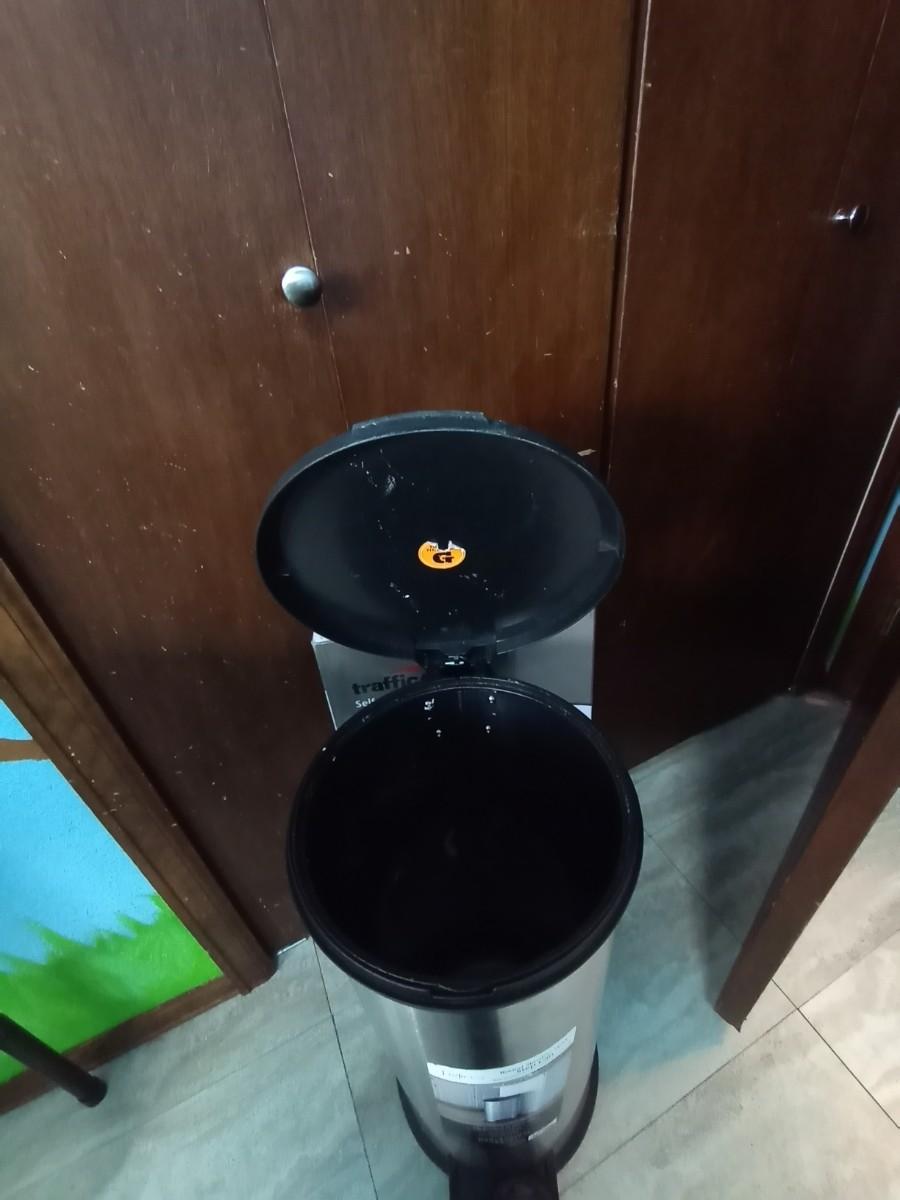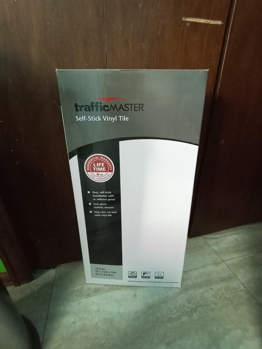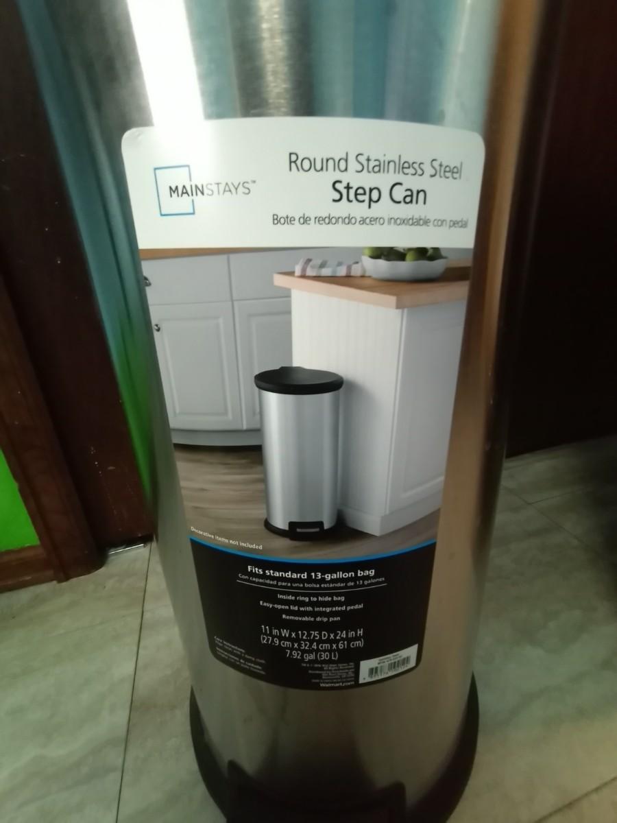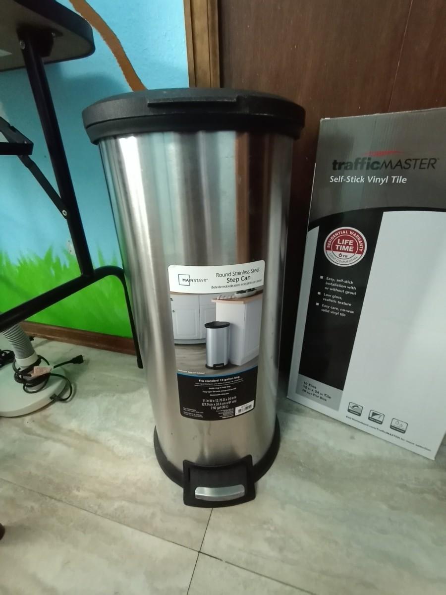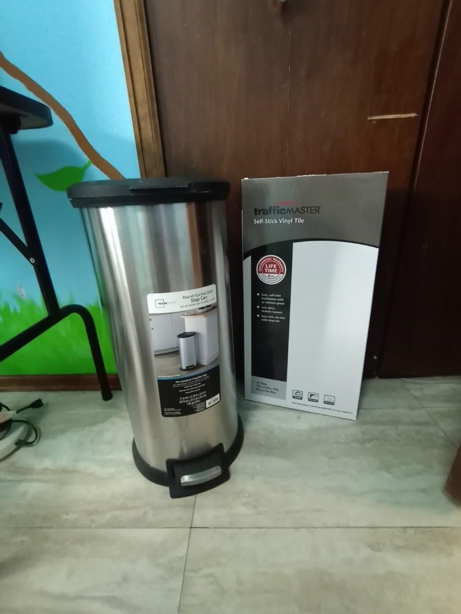 ROUND STAINLESS STEEL STEP CAN AND BOX OF SELF STICK TILE